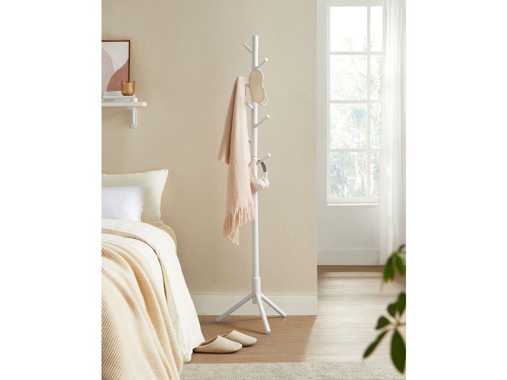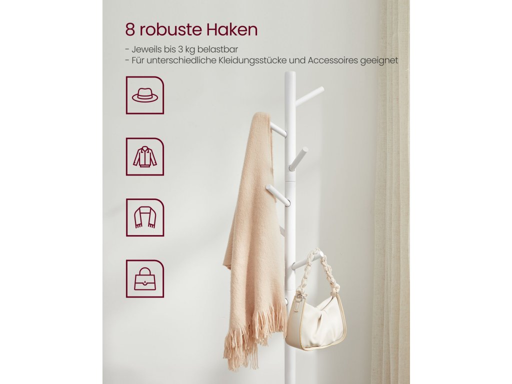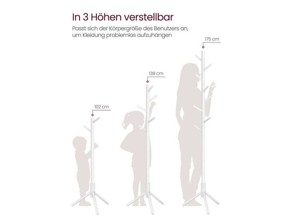 Stojanový věšák na kabáty, masivní dřevěný věšák na kabáty, ve tvaru stromu, 8 háčků, 3 možnosti výšky, na oblečení, klobouky, tašky, do obývacího pokoje, ložnice, domácí kanceláře, bílý.