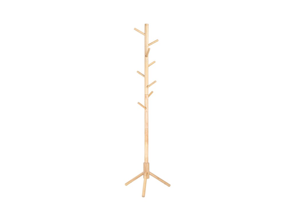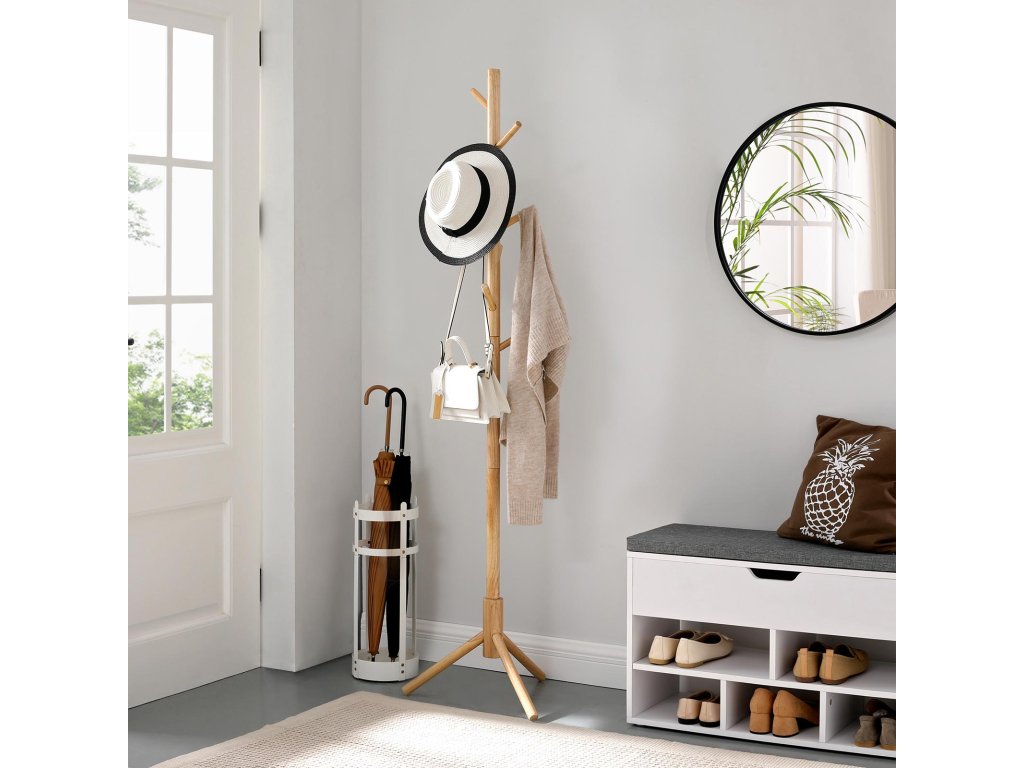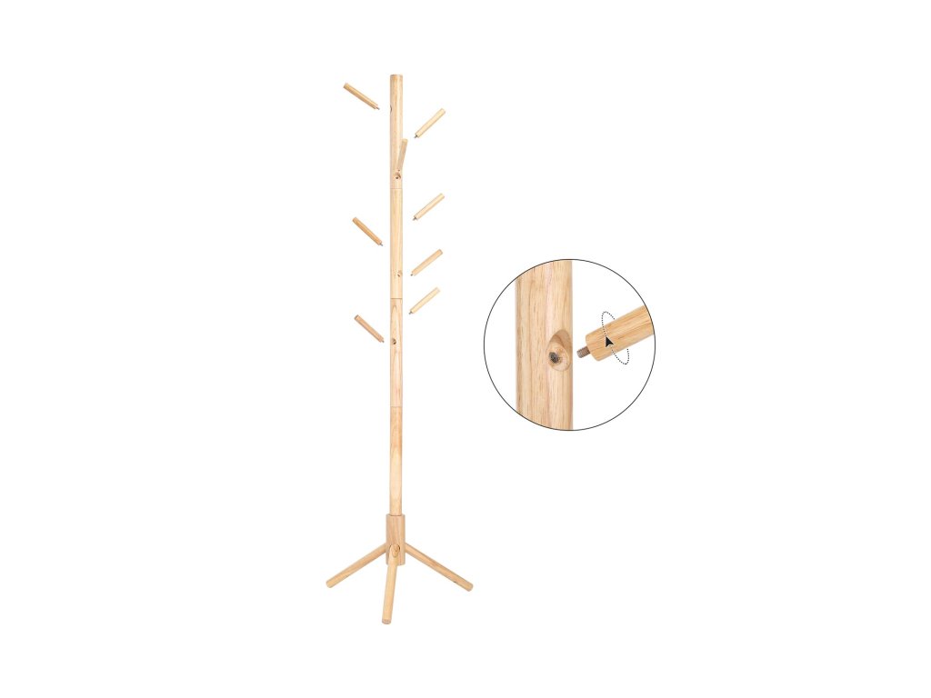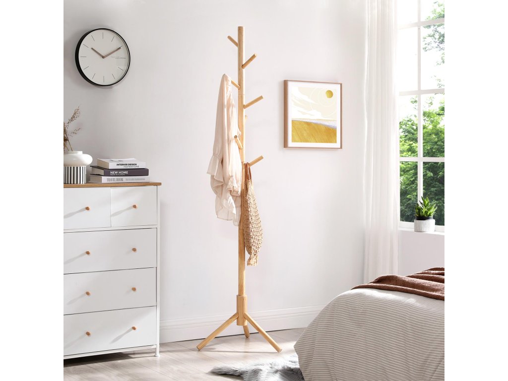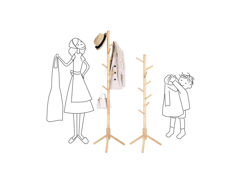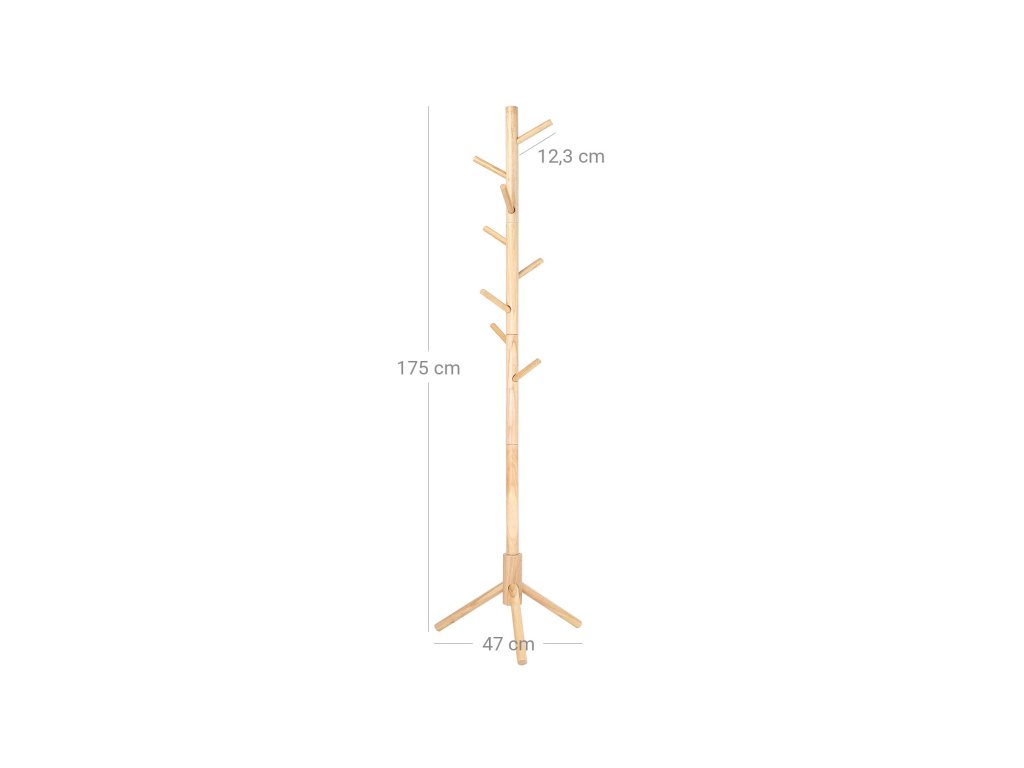 Stojanový věšák na kabáty, věšák z masivního dřeva, věšák ve tvaru stromu s 8 háčky, 3 možnosti výšky, na oblečení, klobouky, tašky, do obývacího pokoje, ložnice, domácí kanceláře, přírodní.
