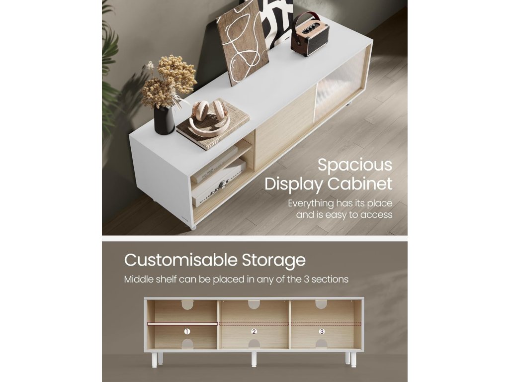 【INVITES MODERN LIVING】Moderní styl se s touto televizní skříňkou snoubí s pohodovým bydlením. Dvojí tón bílého mraku a přírodní béžové barvy působí elegantně a moderně, zatímco rýhované sklo vyzařuje jemnou, mlhavou atmosféru a vytváří příjemný prostor pro zábavu.