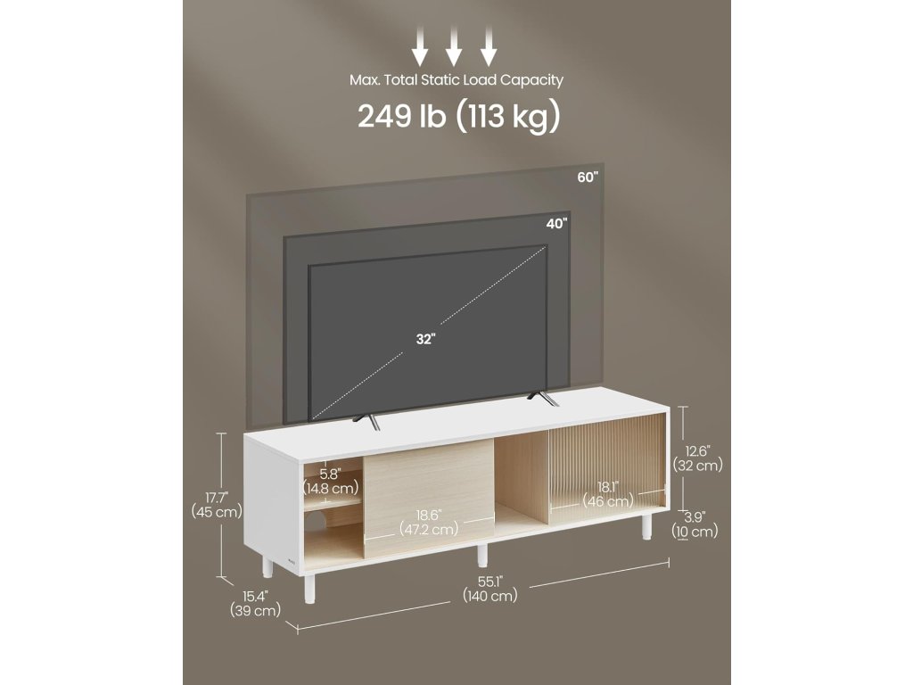 【VHODNÝ PRO TV až do 60" 】 Toto zábavní centrum o rozměrech 140 x 39 x 45 cm je vhodné pro televizory s úhlopříčkou 32", 45", 50", 55" až 60", takže je univerzálním doplňkem vašeho zábavního prostoru nebo multimediální místnosti.
