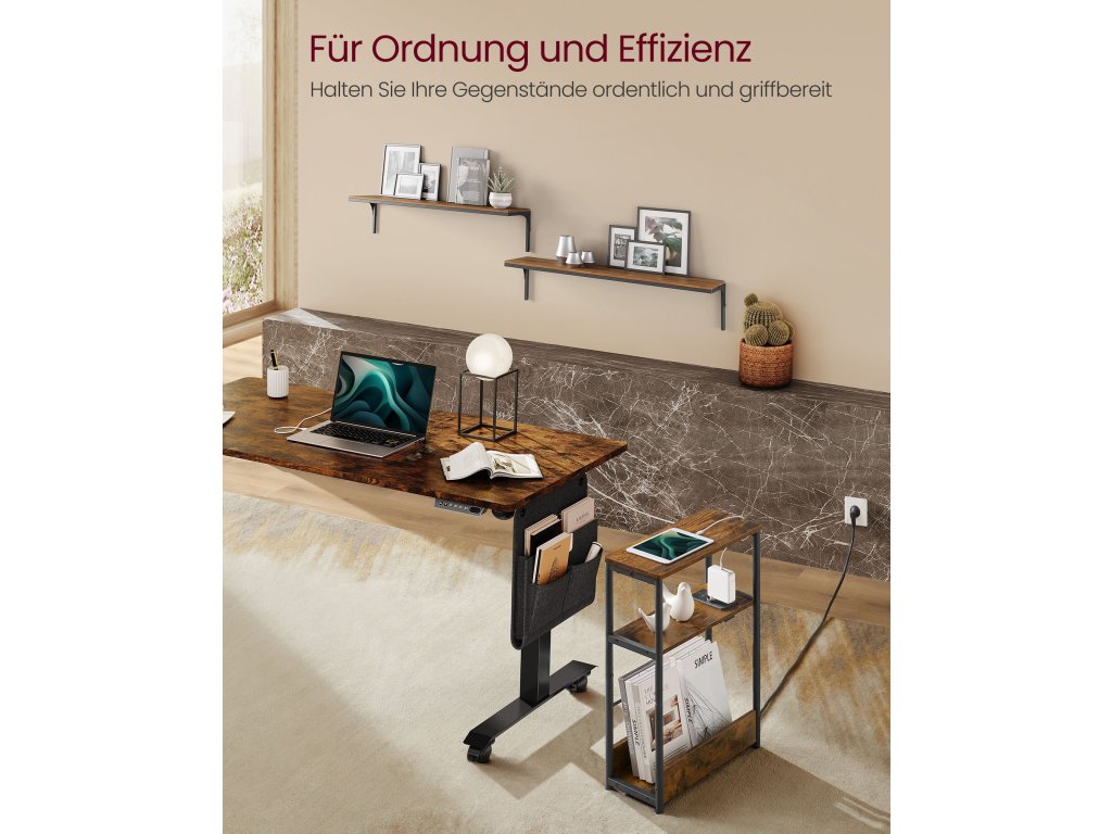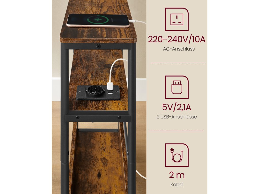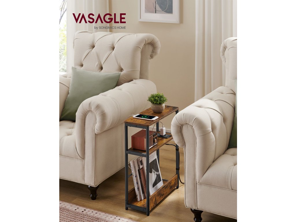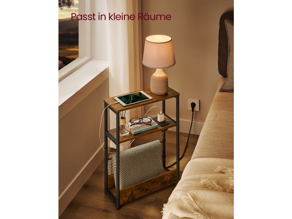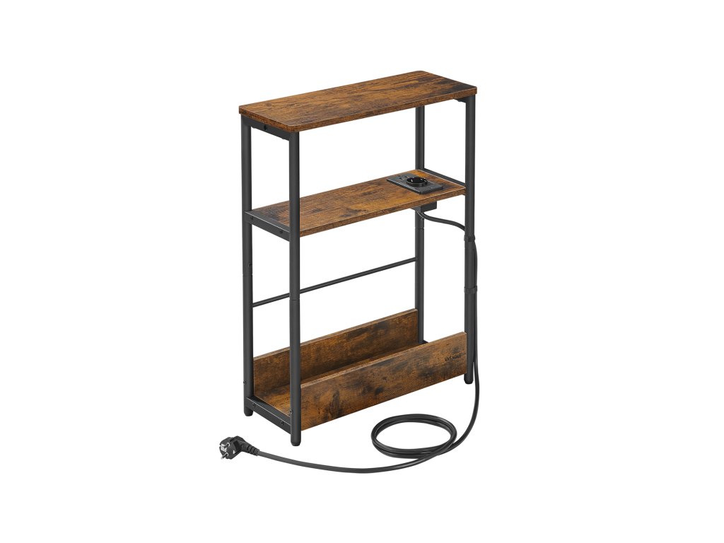 Tenký boční stolek s napájecí lištou, 3patrový noční stolek, koncový stolek, pro malé prostory, stojan na časopisy, obývací pokoj, ložnice, kancelář, rustikální hnědá a inkoustově černá.