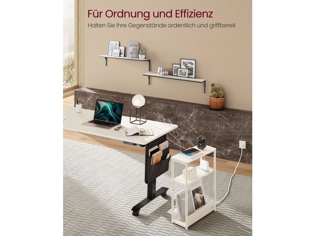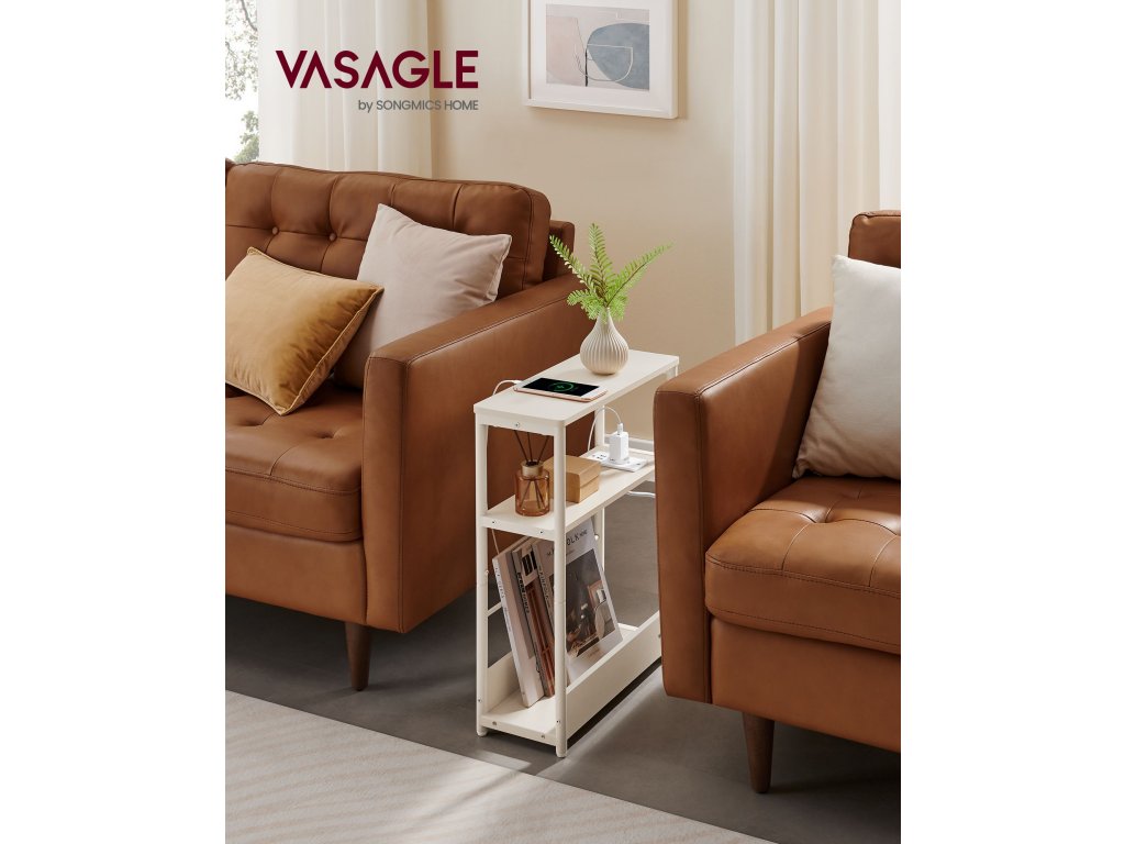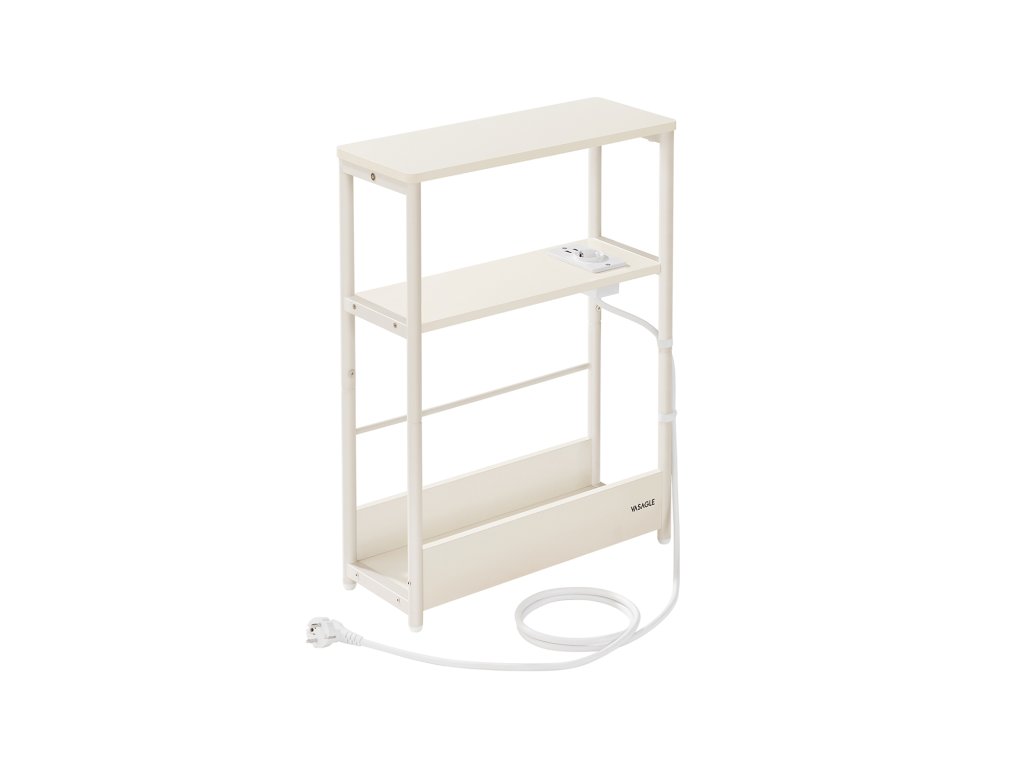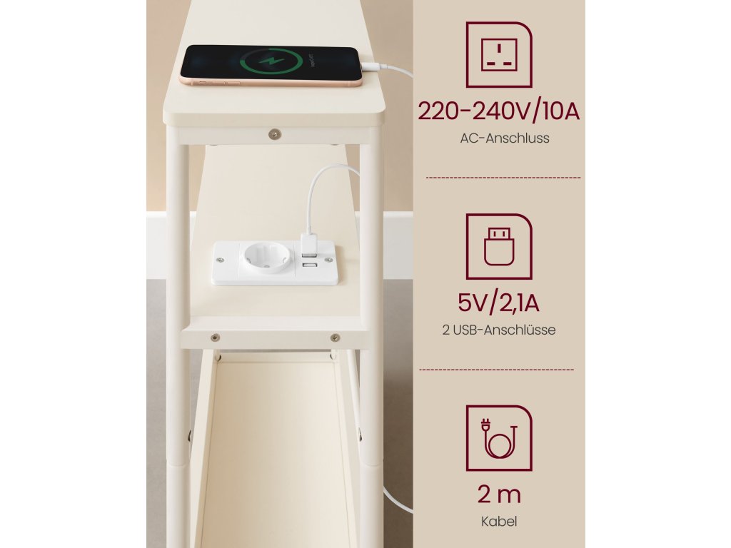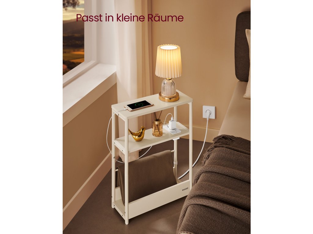 Tenký noční stolek s napájecí lištou, tříúrovňový noční stolek, odkládací stolek, pro malé prostory, stojan na časopisy, obývací pokoj, ložnice, kancelář, krémově bílý.