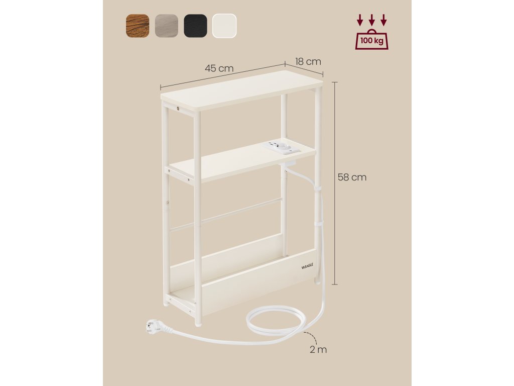 Hodí se do malých prostor Tento štíhlý třípatrový noční stolek o rozměrech 18 x 45 x 58 cm se skvěle hodí do malých prostor vedle pohovky nebo postele, takže jej můžete používat i v omezenějších prostorech.Integrovaná napájecí lišta Tento malý stolek s 1 zásuvkou a 2 porty USB umožňuje nabíjet telefon, tablet a další zařízení současně. Díky 2metrové šňůře můžete tento stolek umístit, kamkoli budete chtít.Více možností uložení Ať už potřebujete stojan na časopisy ke čtení, nebo odkládací stolek na věci denní potřeby, tento multifunkční noční stolek se třemi úrovněmi polic je tu pro vás.Robustní a ďábelský Díky robustnímu ocelovému rámu a vysoce kvalitní dřevotřískové desce unese tento stolek pro malé prostory až 100 kg a poskytuje stabilní oporu pro vaše každodenní potřeby.Snadná a rychlá montáž Díky očíslovaným dílům a ilustrovaným návodům je montáž tohoto stolku hračkou. Tento praktický a elegantní odkládací stolek si užijete během několika minut.| Kategorie: | Odkládací stolky |