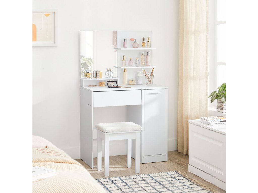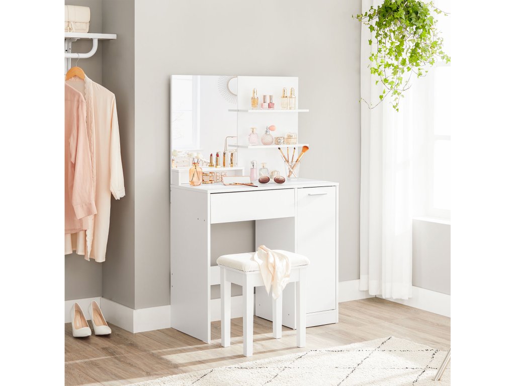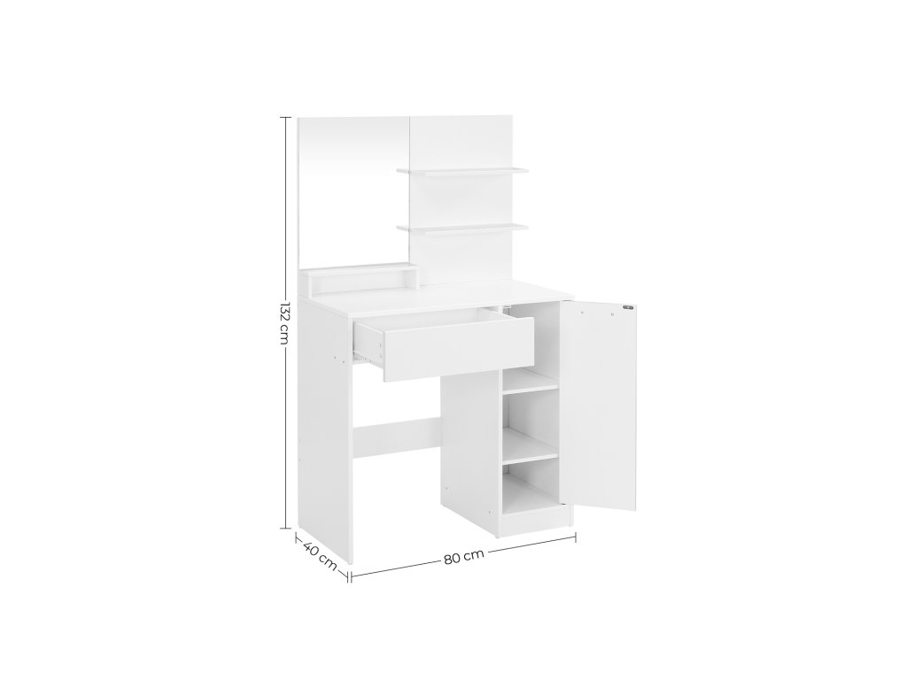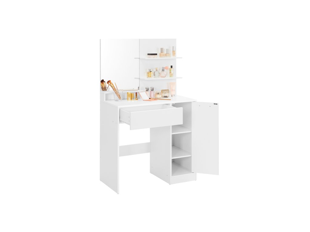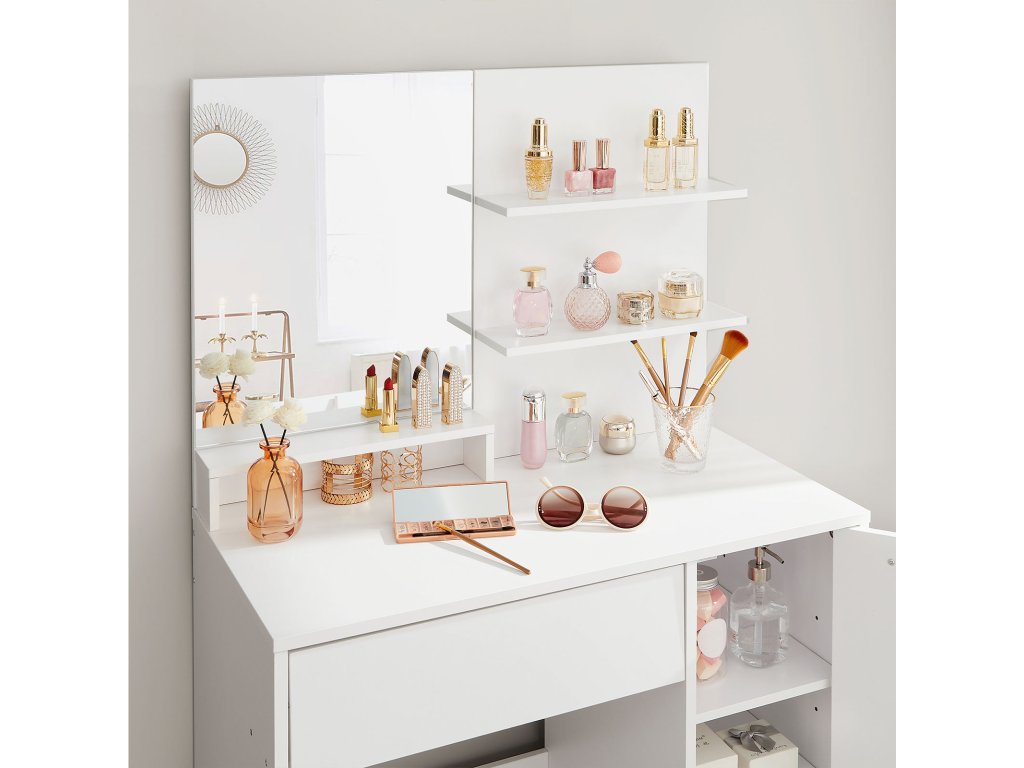 Toaletní stolek, kosmetický stolek, toaletní stolek se zrcadlem, 1 zásuvka, 2 police, úložná skříňka, organizér na make-up, bílý.
