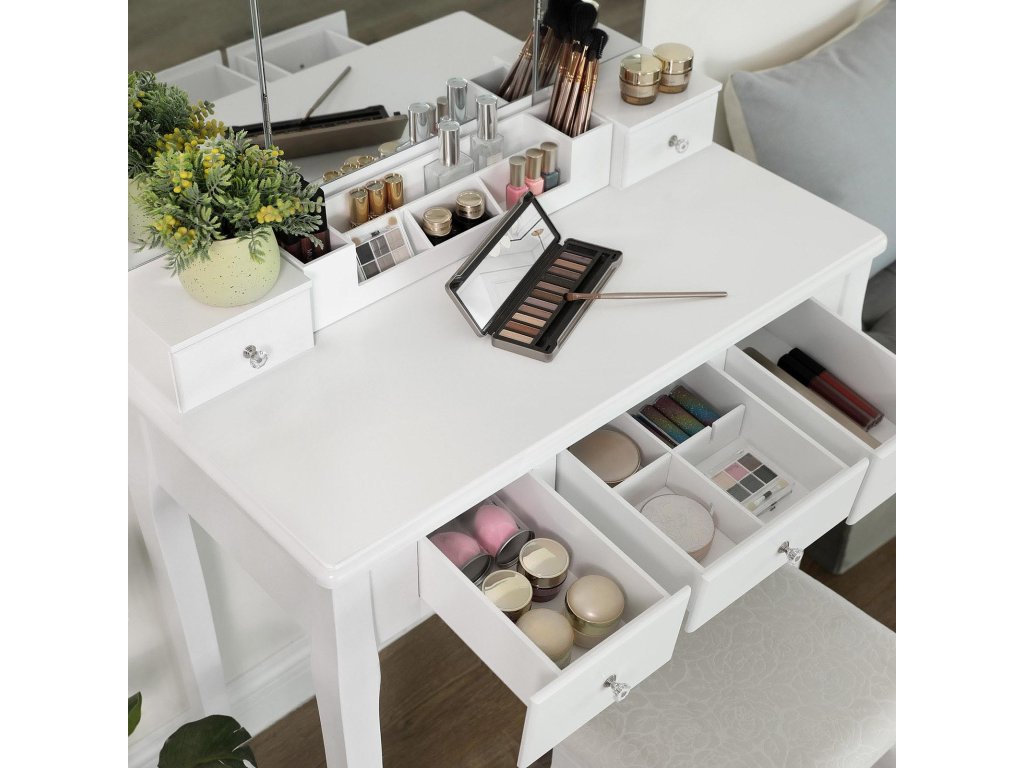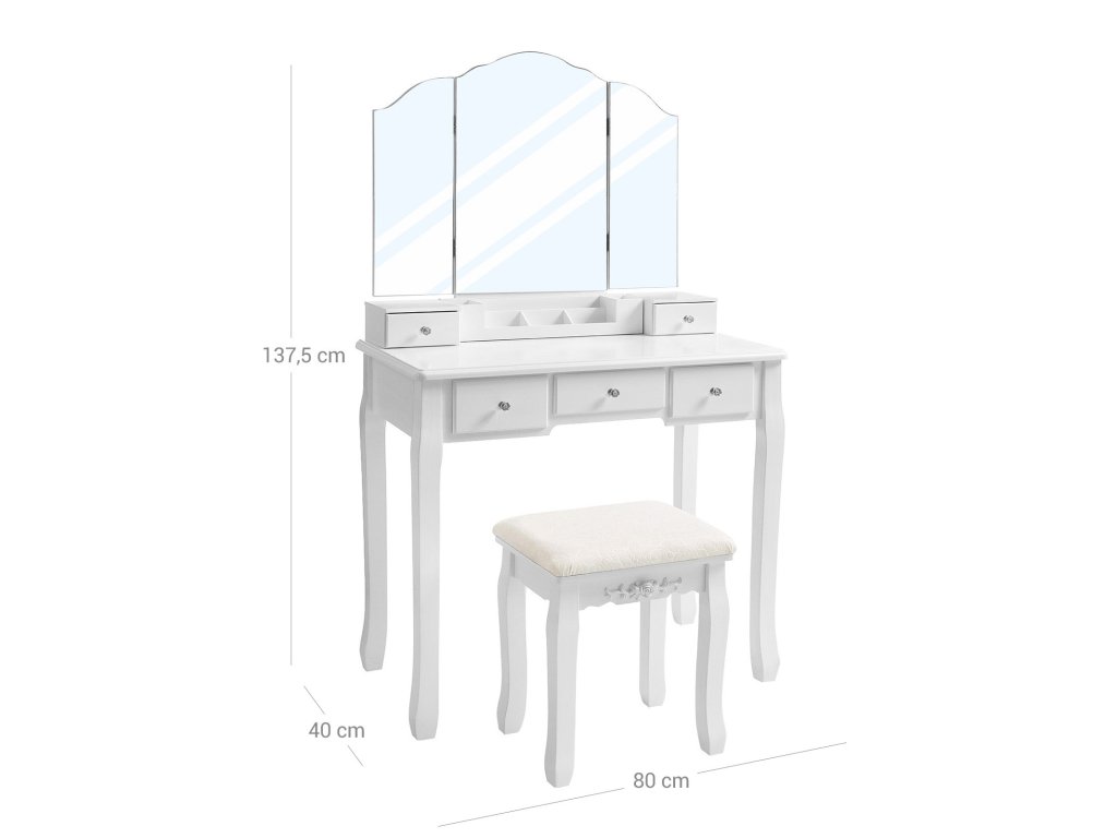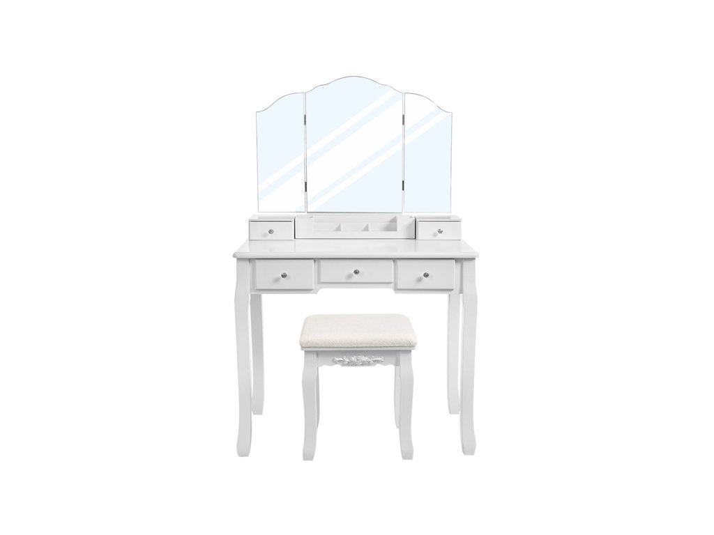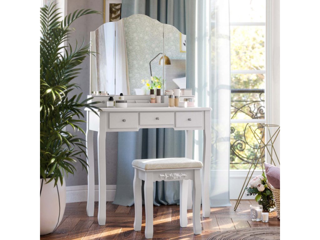 Toaletní stolek s 5 zásuvkami, kosmetický stolek s 1 stoličkou, bezrámové trojskladové zrcadlo, 1 vyjímatelný kosmetický úložný box, toaletní souprava, snadná montáž, bílý.