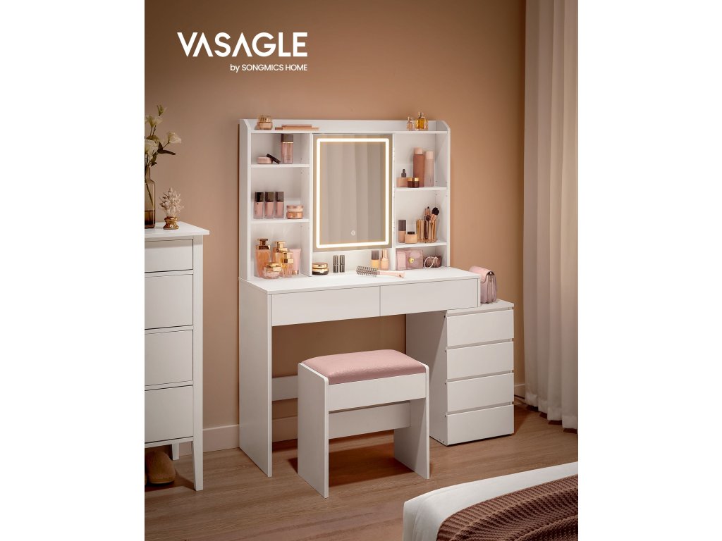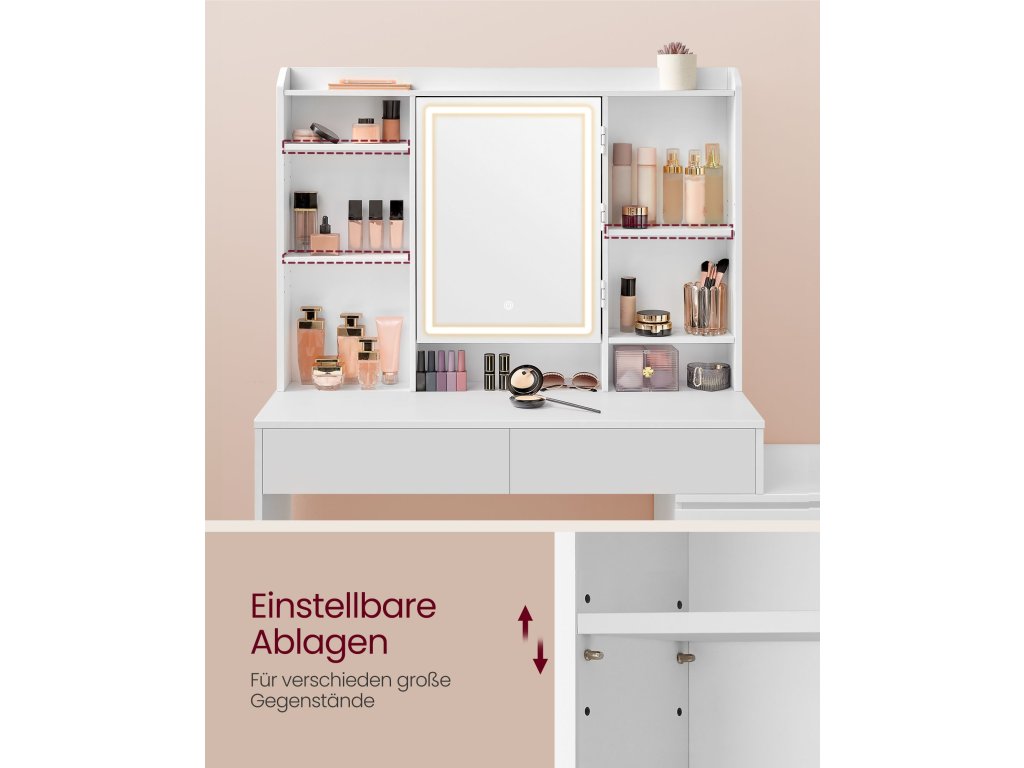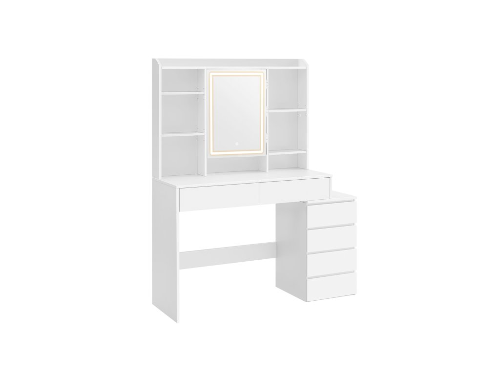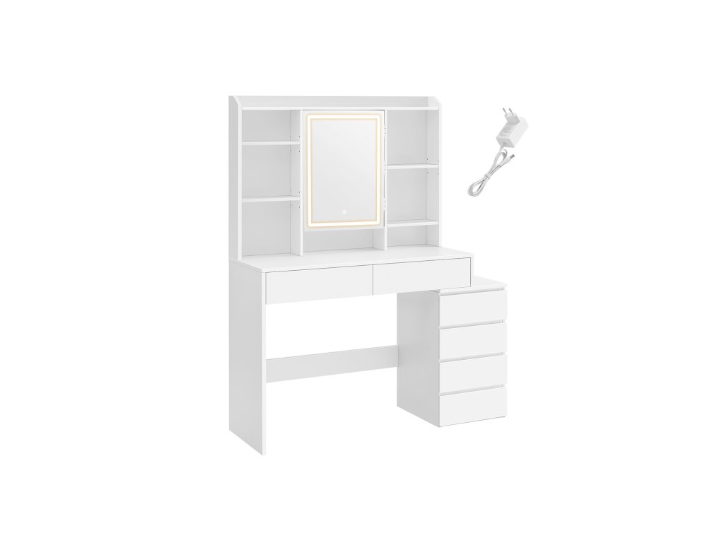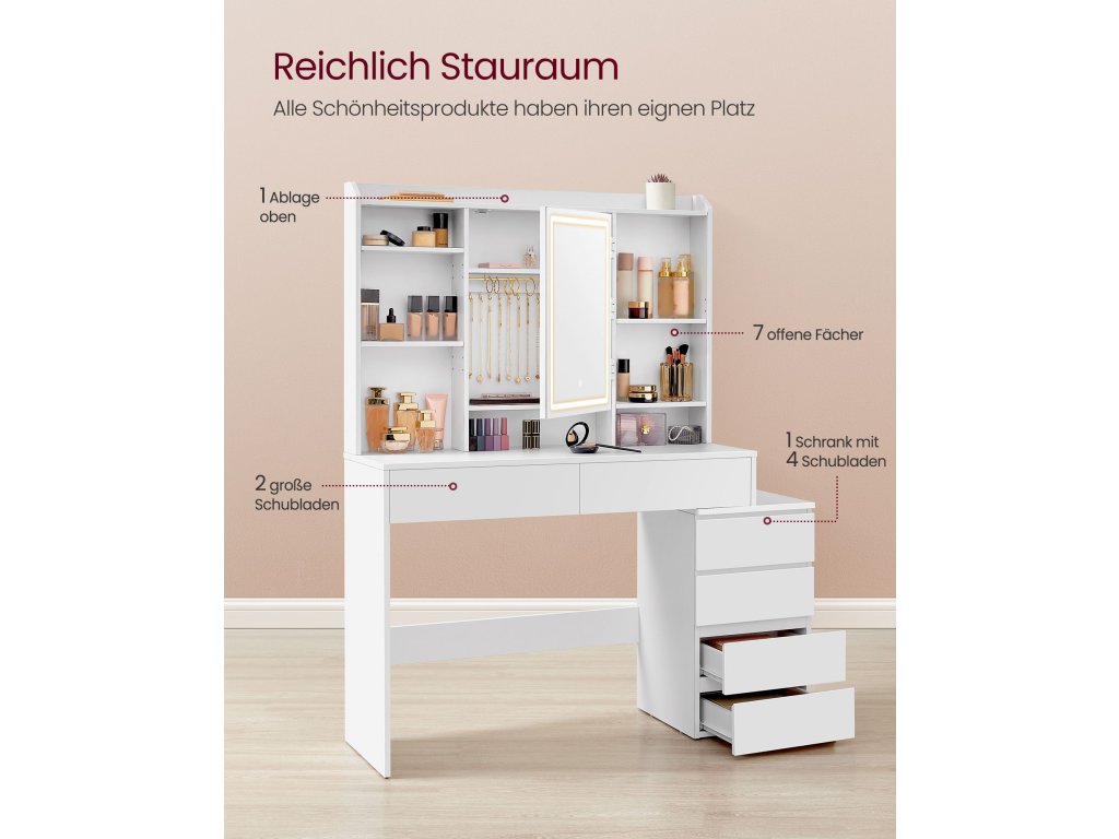 Dostatek úložného prostoru Jedna horní police, 7 otevřených přihrádek, 2 velké zásuvky, 2 police a háčky za zrcadlem a skříňka se 4 zásuvkami. Tento kosmetický stolek nabízí dostatek prostoru pro přehledné uložení všech vašich věcí.Nastavitelné osvětlení LED Dlouhým stisknutím přepínače nastavíte jas, krátkým stisknutím nastavíte barvu světla. Osvětlení LED si můžete nastavit podle svých potřeb a použít tak dokonalé líčení.Nastavitelné police: 2 police na levé straně a police uprostřed na pravé straně jsou každá 3 výškově nastavitelné, takže můžete snadno ukládat předměty různých velikostí.Robustní a snadno udržovatelný Tento toaletní stolek z vysoce kvalitní dřevotřísky je robustní a odolný; jeho povrch je odolný proti opotřebení a snadno se čistí, což umožňuje dlouhodobé používání.Jednoduchý a moderní Jednoduchý design, čisté linie a elegantní bílá barva dělají z tohoto moderního toaletního stolku stylový doplněk vaší ložnice nebo šatny.