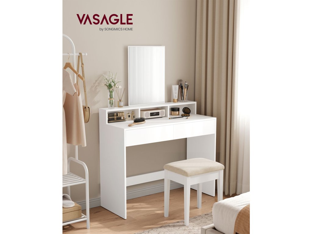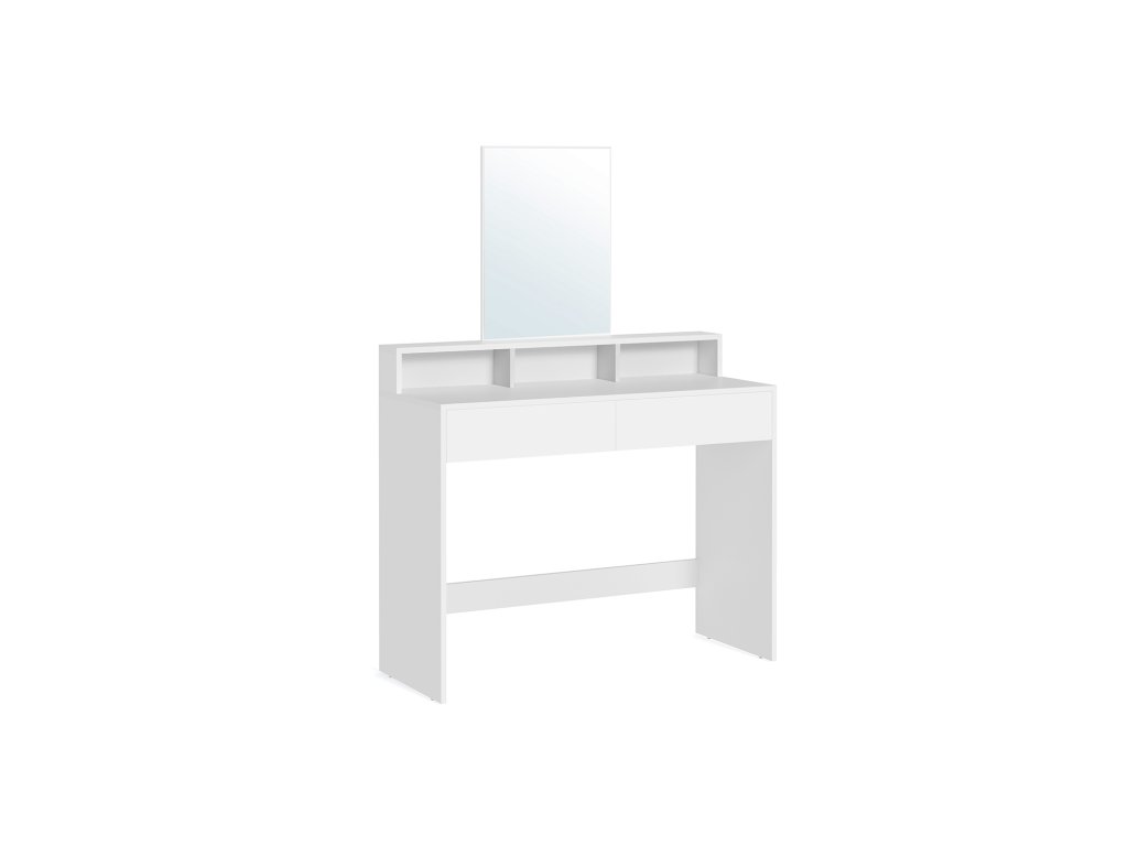 Toaletní stolek s velkým zrcadlem 2 zásuvky 3 otevřené přihrádky Kosmetický stolek moderní bílý.