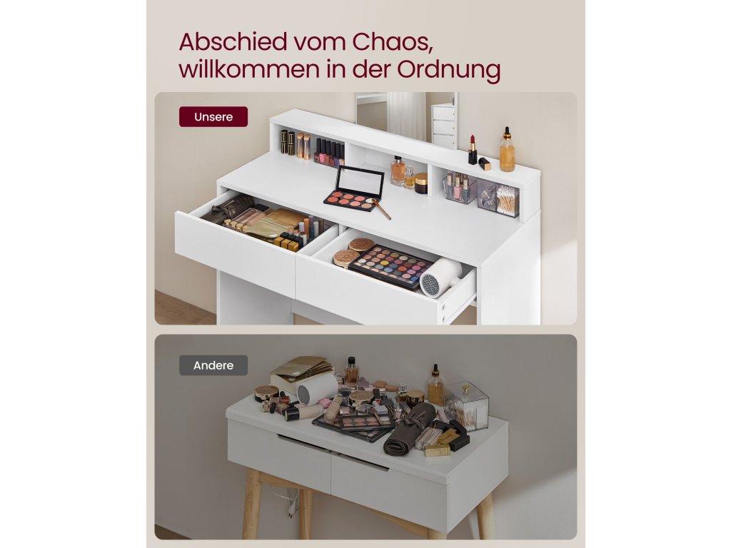 Velké, průhledné zrcadlo Velké zrcadlo toaletního stolku o rozměrech 40 x 53 cm (š x v) vám umožní přehledně se zrcadlit a nanášet bezchybný make-up. [Ochrana proti překlopení pro větší bezpečnost] Připevněte kosmetický stolek ke stěně pomocí přiložené ochrany proti překlopení a vytvořte tak bezpečnější prostředí [Jednoduchý a moderní] Jednoduchý design, čisté linie a elegantní bílá barva dělají z tohoto moderního toaletního stolku stylový doplněk vaší ložnice nebo šatny. [Robustní a snadno se čistí] Tento toaletní stolek vyrobený z kvalitní dřevotřísky je robustní a odolný; jeho povrchová úprava je odolná proti opotřebení a snadno se čistí, což umožňuje dlouhodobé používání;| Kategorie: | Toaletní stolky |