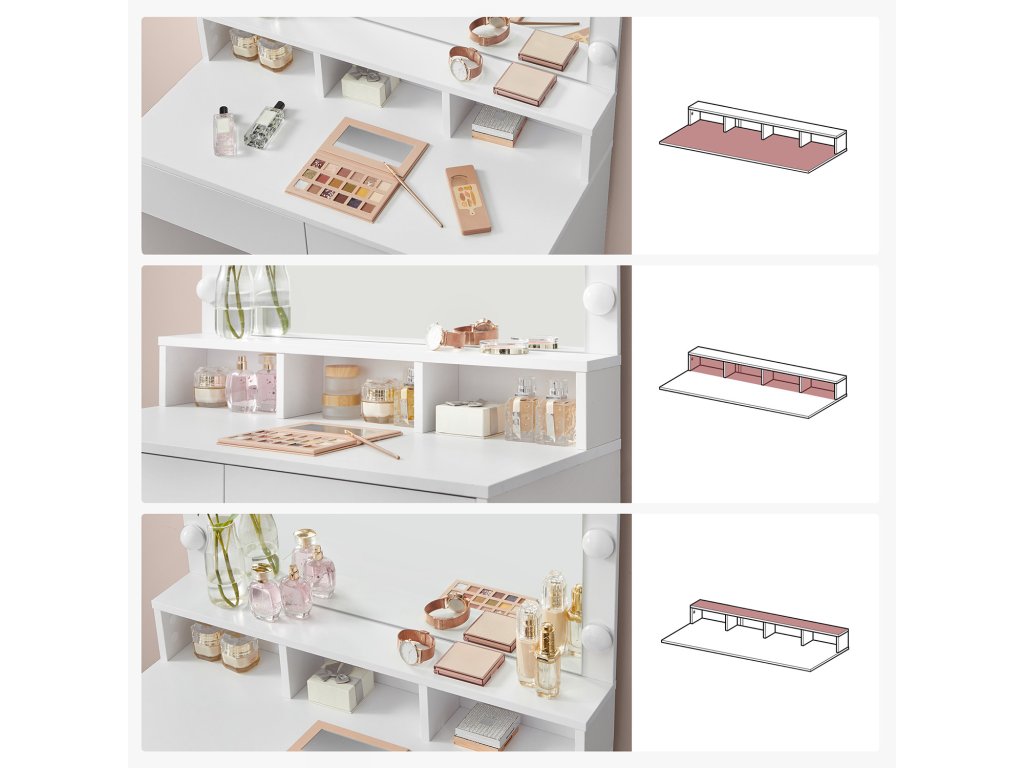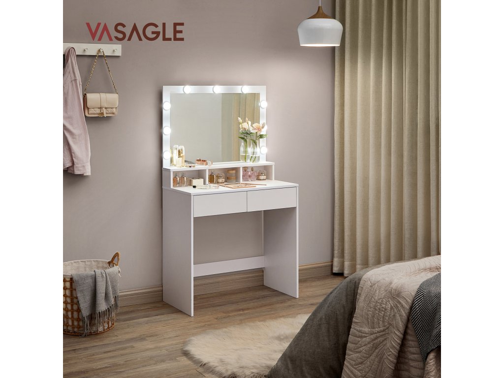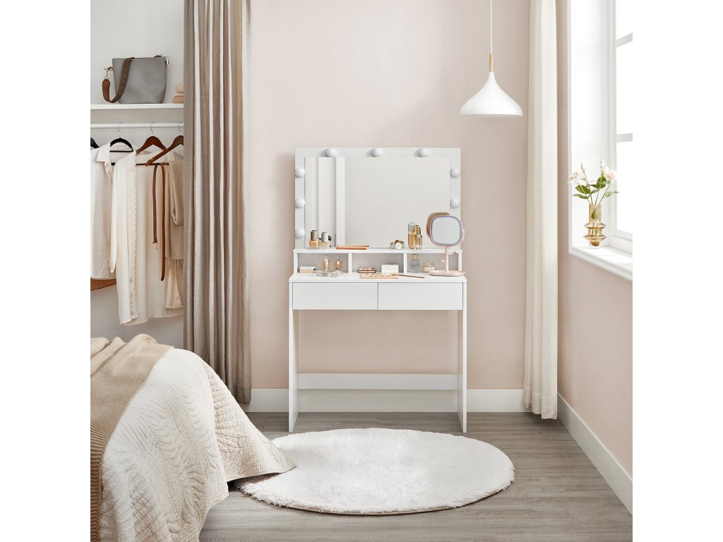 DOKONALE STYLIZOVANÉ: 9 stmívatelných žárovek tohoto toaletního stolku obklopujících zrcadlo rozzáří váš kosmetický prostor a vytvoří dokonalé líčení!Více pořádku pro vaši kosmetiku: 2 velké zásuvky a 3 otevřené přihrádky toaletního stolku poskytují dostatek místa pro váš make-up a usnadňují organizaci kosmetiky.DOKONALÝ SOUČASNÝ STAV - Čisté linie, bílá barva a moderní vzhled tohoto toaletního stolku se dokonale hodí do vaší ložnice. Do rohu nebo vedle postele? Rozhodnutí je na vás!