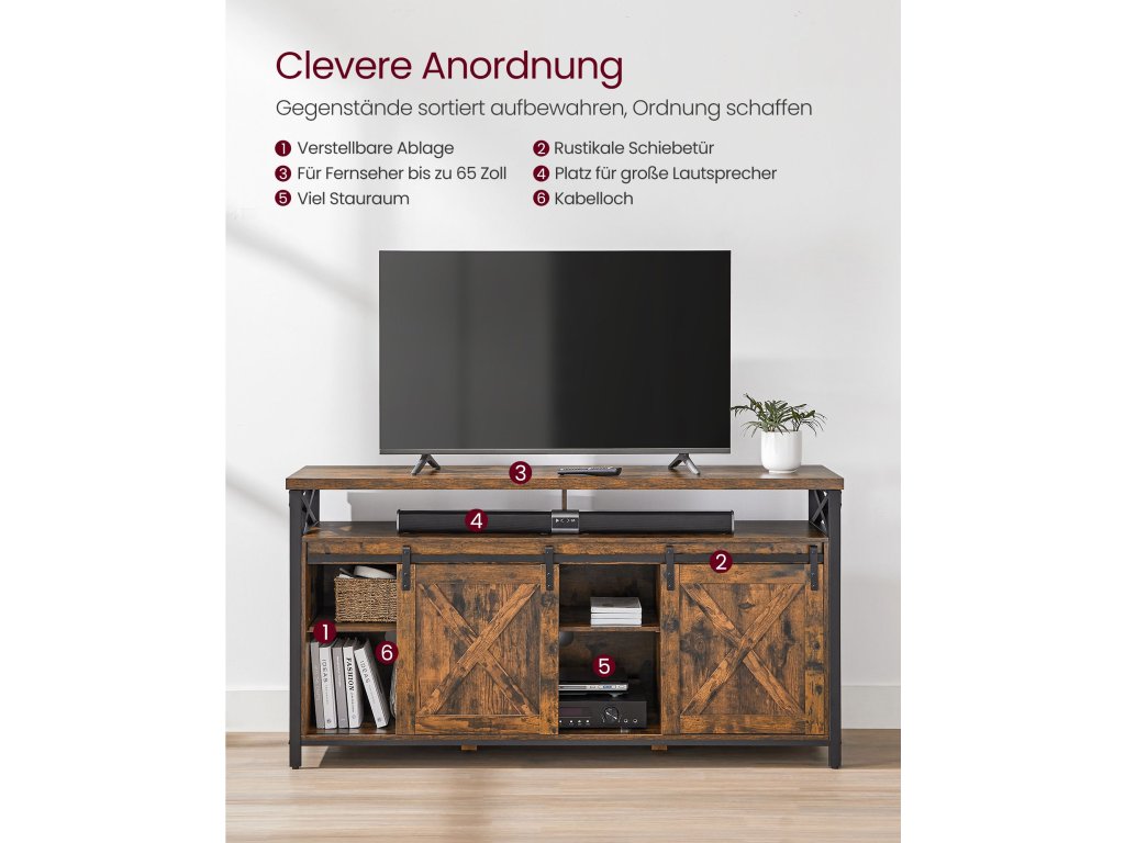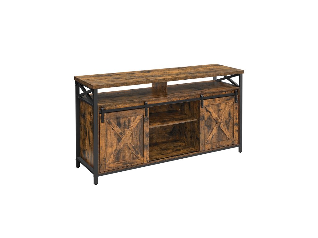 TV skříňka s nastavitelnými policemi, dveře ve tvaru stodoly, farmářský design, kovový rám, rustikální hnědá a černá.