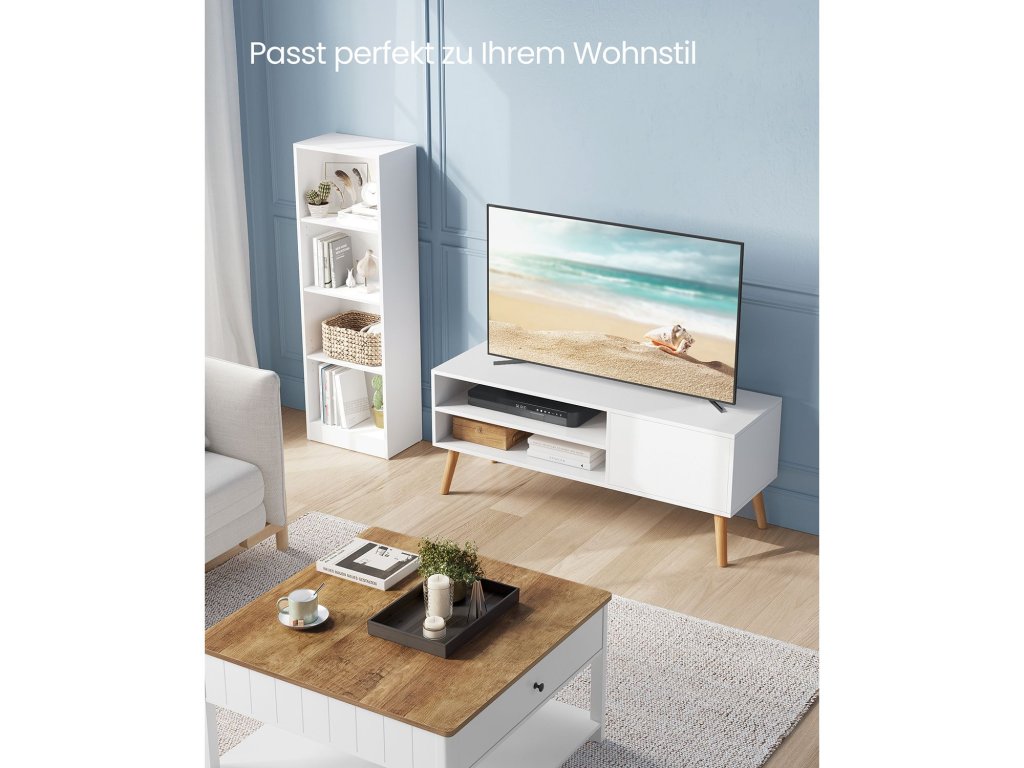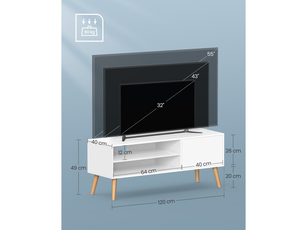 Nízká TV skříňka pro televizory s úhlopříčkou do 55 palců a délkou 120 cm, televizní stojan do obývacího pokoje, průmyslový design bílá.