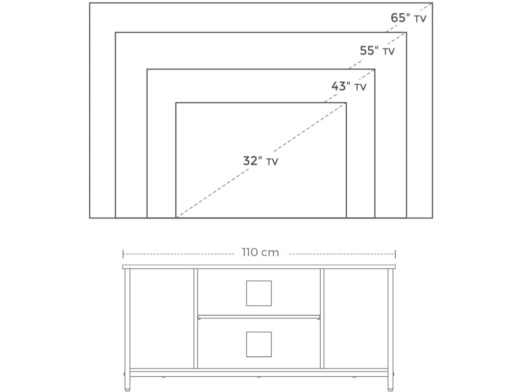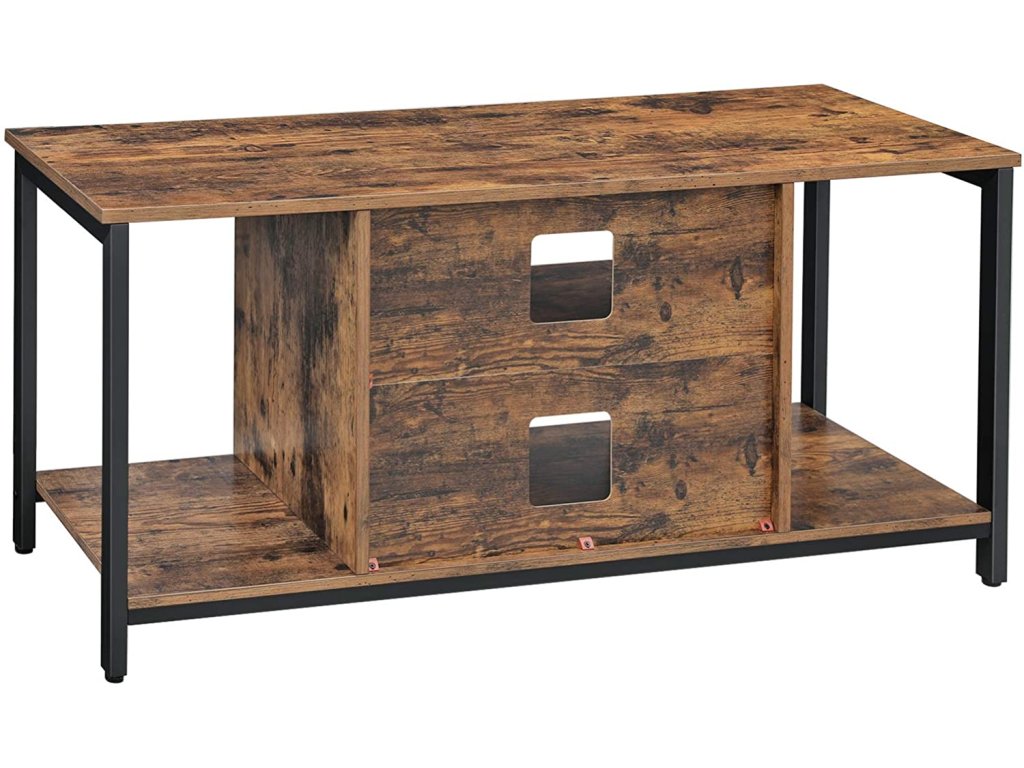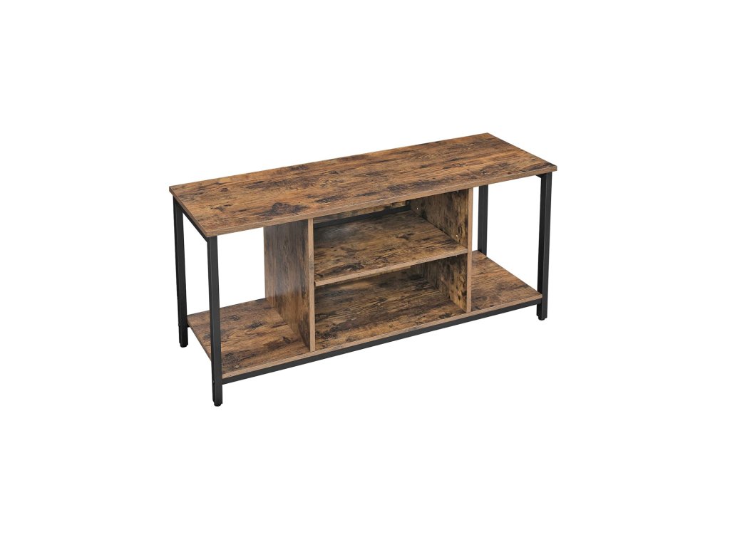 Televizní stolek pro TV s úhlopříčkou do 50 palců, TV skříňka s otevřenými policemi, TV konzola do obývacího pokoje, zábavní místnost, rustikální hnědá a černá.