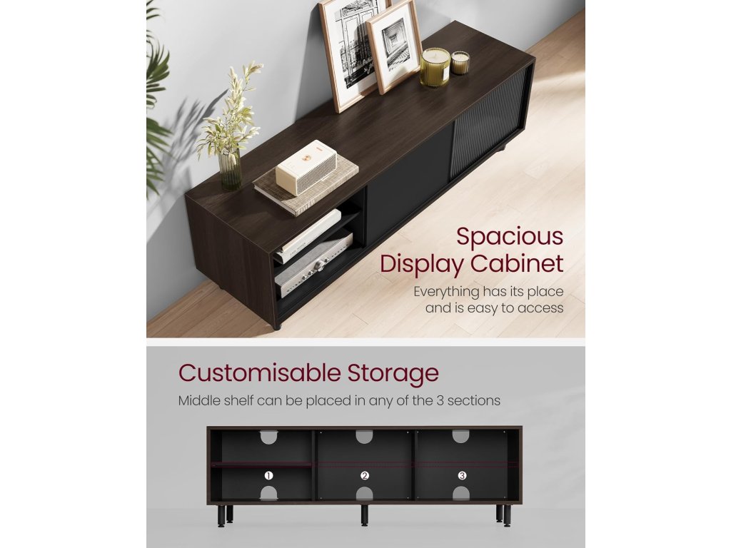 PROSTORNÉ A NASTAVITELNÉ】 Posuvné dveře umožňují zobrazit nebo skrýt multimediální potřeby podle potřeby, zatímco drážkované sklo poskytuje zastíněný úložný prostor pro estetiku a soukromí. Prostřední polici lze umístit do kterékoli ze tří částí podle vašich preferencí.