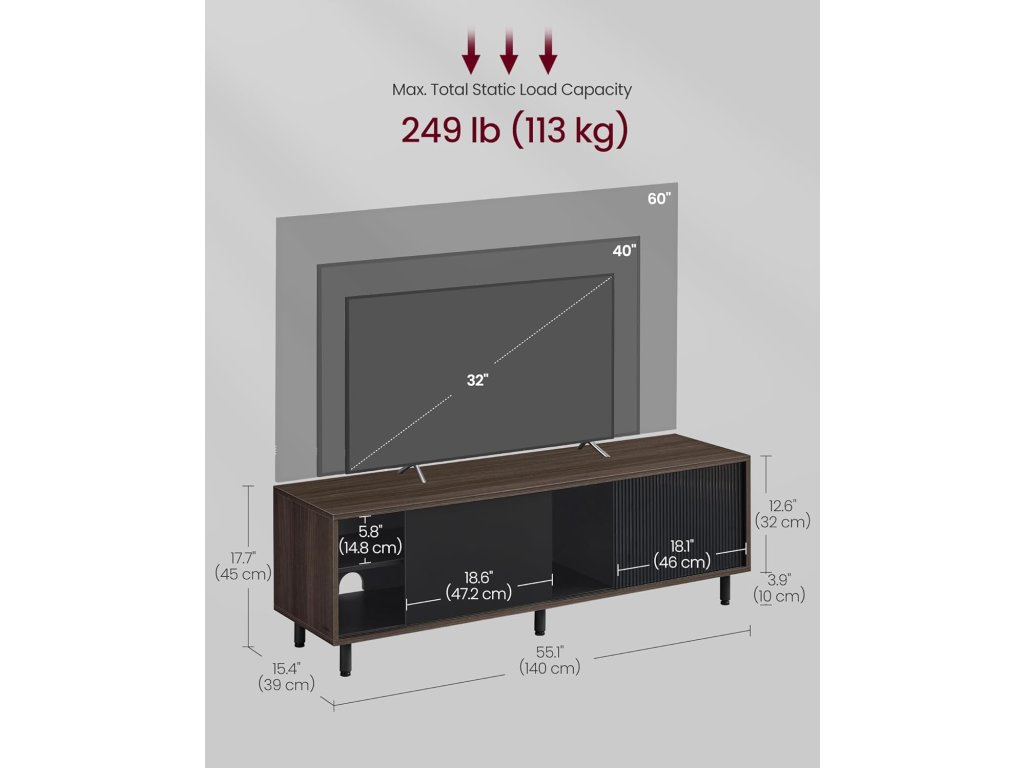 【VHODNÝ PRO TV až do 60" 】 Toto zábavní centrum o rozměrech 140 x 39 x 45 cm je vhodné pro televizory s úhlopříčkou 32", 45", 50", 55" až 60", takže je univerzálním doplňkem vašeho zábavního prostoru nebo multimediální místnosti.