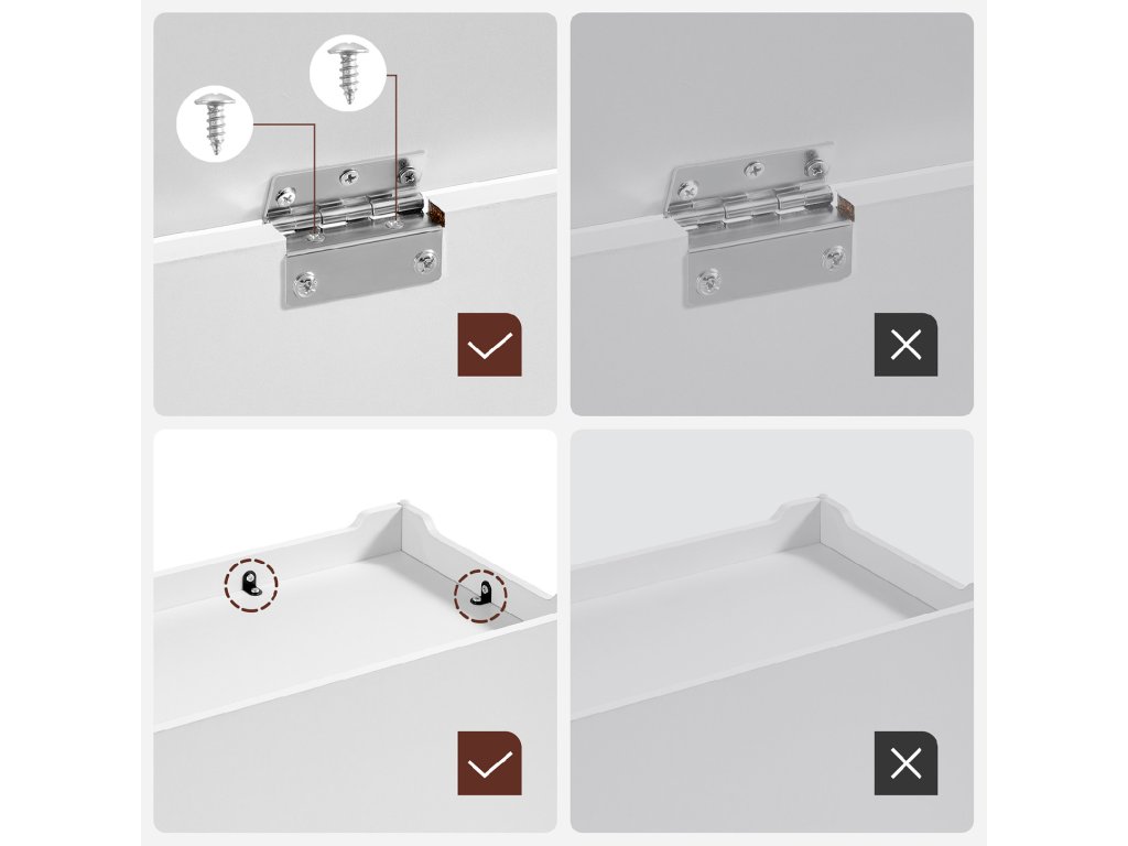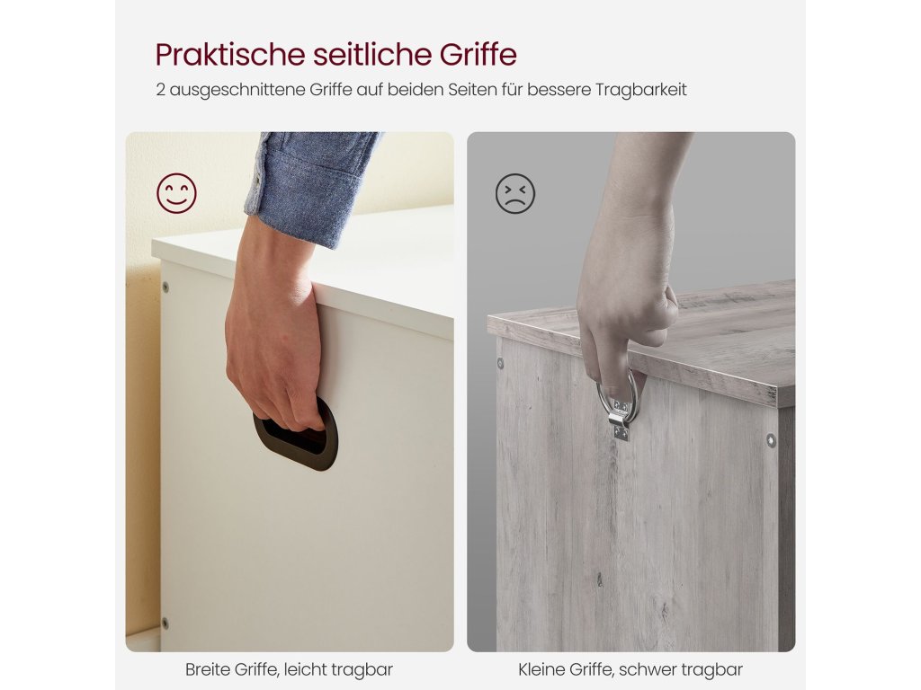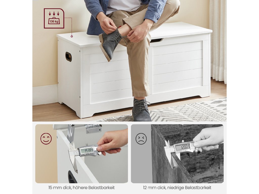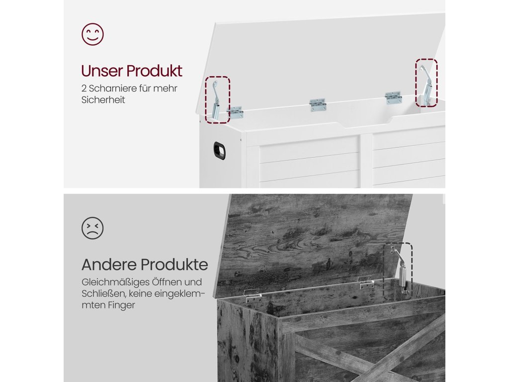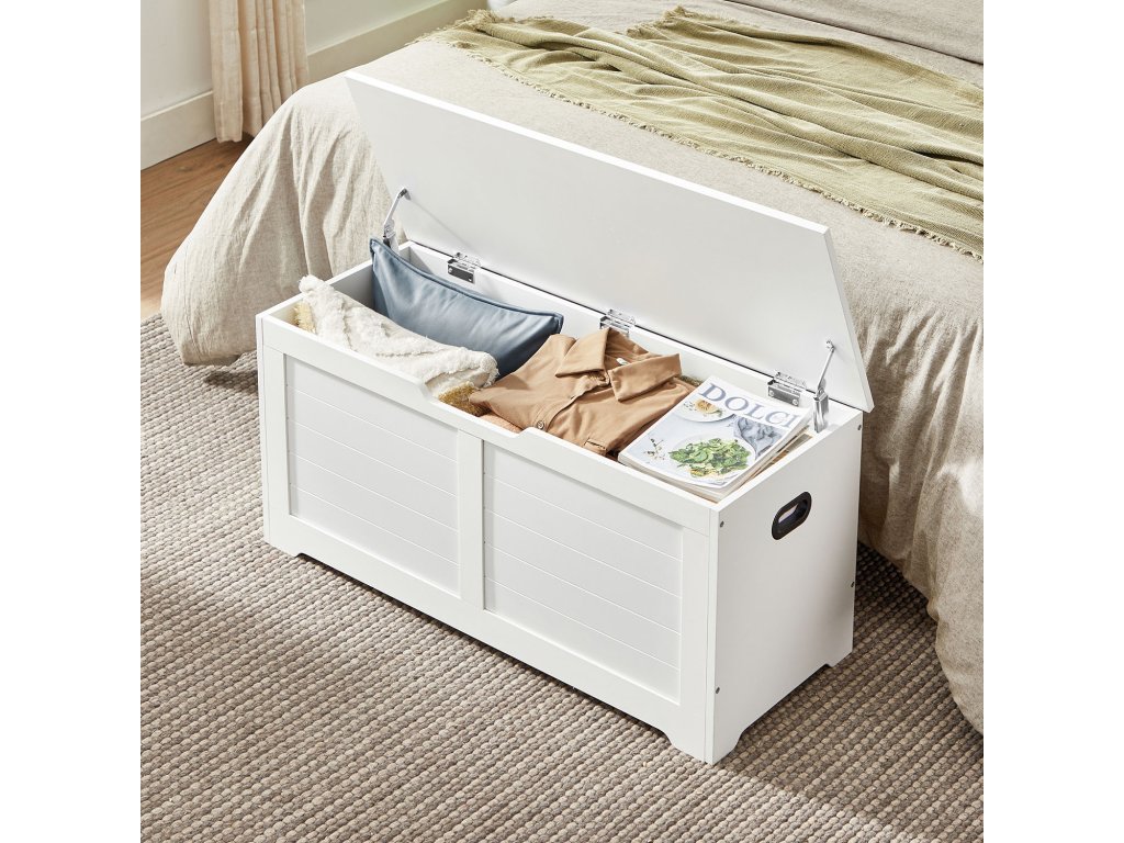 2 bezpečnostní panty pro větší bezpečnost 2 robustní panty umožňují, aby víko této odkládací lavice zůstalo stabilně otevřené v úhlu 60° nebo menším a zavřelo se, když zbývá jen 5 cm místa. takže žádné skřípnuté prsty!Vysoká nosnost Horní část unese až 136 kg a přihrádka až 136 kg. takže si můžete v klidu sednout na lavici, přezouvat se a ukládat spoustu věcí do skryté přihrádky.Široké, praktické boční úchyty Díky 2 dobře navrženým, vyříznutým úchytům po stranách můžete tuto truhlu snadno přemístit kamkoli chcete, aniž by se vaše ruce cítily nepohodlně.Dostatek úložného prostoru Tento úložný box s víkem o rozměrech 40 x 100 x 46 cm má prostornou přihrádku, do které můžete schovat přikrývky, polštáře, oblečení a knihy a udržet tak v ložnici pořádek.Snadná montáž Díky přehlednému návodu a očíslovaným dílům je sestavení této lavice na boty hračka. Můžete ji hrdě uhnízdit ve své ložnici, obývacím pokoji nebo na chodbě co nejdříve!| Kategorie: | Truhly |