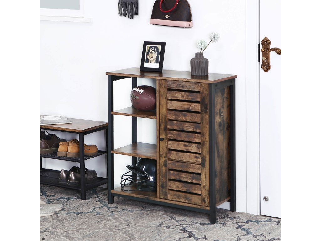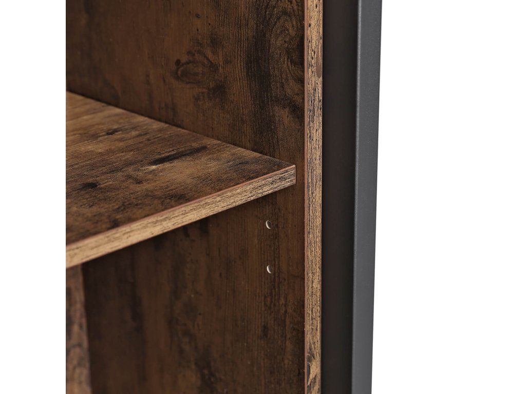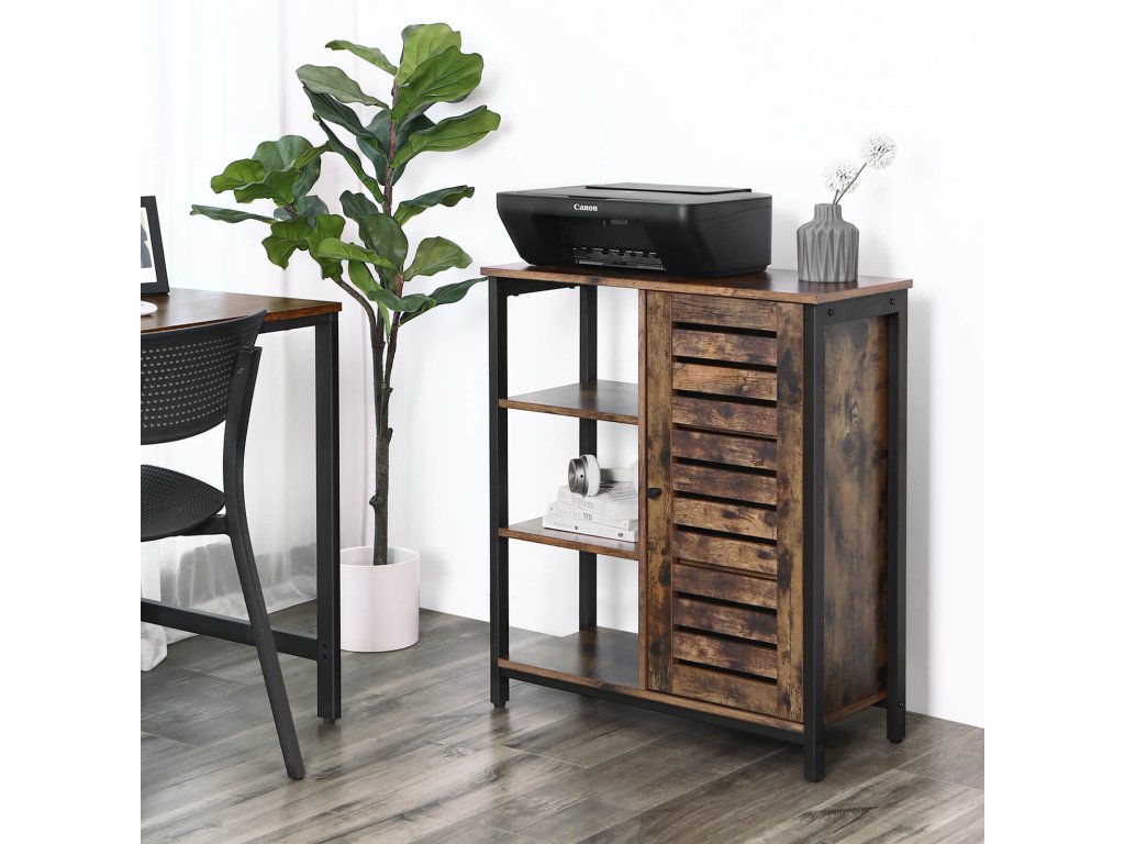 Úložná skříň, skříňka, víceúčelová skříň, 3 police a skříňka s dvířky, do kuchyně, obývacího pokoje, domácí kanceláře, industriální styl, rustikální hnědá a černá.
