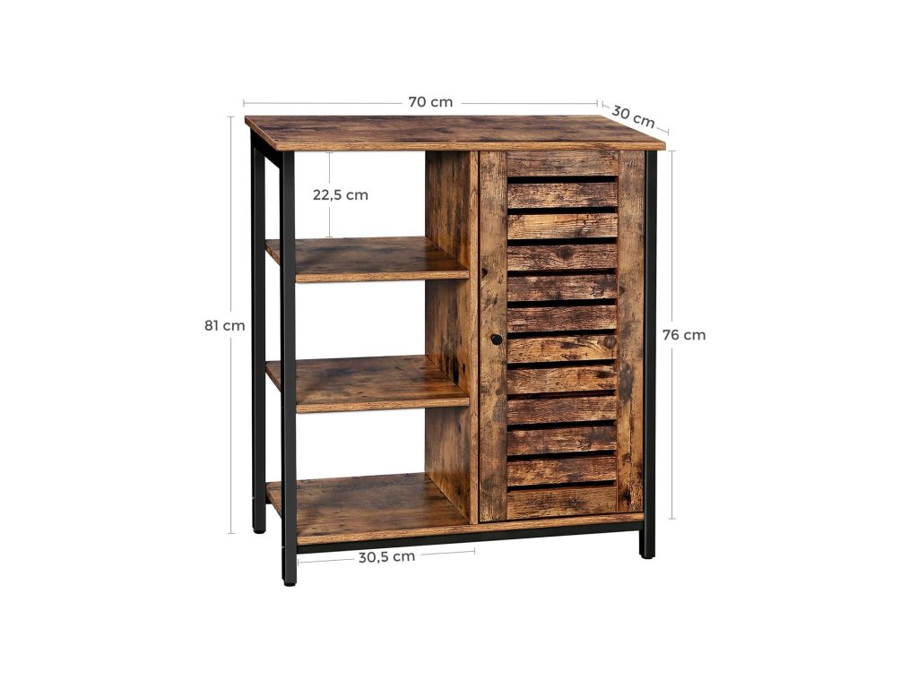 JDE TO S VÁMI: Skříňka v kuchyni, příborník v předsíni, knihovna v obývacím pokoji nebo kartotéka v pracovně? Ať už se rozhodnete pro cokoli tato skříňka se 3 otevřenými policemi a uzavřenými přihrádkami splní všechny vaše požadavky.ODHALTE, CO SE SKRYJE ZA DVEŘMI: Zatáhněte za knoflík nebo jemně stiskněte, abyste otevřeli dvířka této víceúčelové skříňky; 2 výškově nastavitelné police uvnitř poskytují dostatek prostoru pro všechna vaše tajemství;SNADNÁ MONTÁŽ, ŠŤASTNÁ NÁlada: Díky jednoduché konstrukci, očíslovaným dílům a ilustrovaným návodům vám při montáži této úložné skříňky nebudou padat vlasy. Přiložený šroubovák vám naopak práci usnadní.SPRÁVNÉ ŘEŠENÍ: Většina stolů se viklá kvůli nerovné podlaze. Ale nebojte se! Není třeba dávat něco pod nohy, aby se vyrovnaly. Tato úložná skříň je vybavena nastavitelnými nožičkami pro větší stabilitu.CO ZÍSKÁTE: Průmyslová úložná skříň z kolekce LOWELL od společnosti VASAGLE se zařízením proti převrácení pro vaši bezpečnost a další důvod, proč být hrdý na svůj domov.| Kategorie: | Komody |