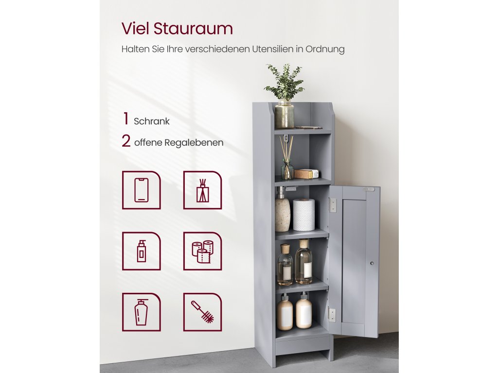 Úzká koupelnová podlahová skříňka s dveřmi a policemi, volně stojící skříňka do koupelny, úzká skříňka na toaletní papír, nastavitelné police, holubičí šedá.