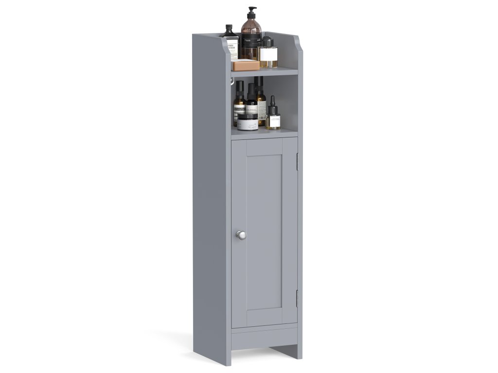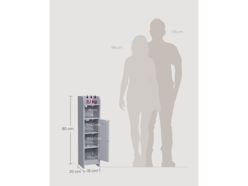 Optimalizace malých prostor S touto holubičí šedou koupelnovou skříňkou proměníte stísněné kouty v koupelně ve funkční a stylové úložné prostory. Díky rozměrům 20 x 18 x 80 cm je úložným prostorem navíc a zároveň nezabírá mnoho místa na podlaze.Více možností uložení V horní přihrádce můžete vystavit rostliny v květináčích nebo umístit mobilní telefon, prostřední přihrádka je určena pro toaletní potřeby. a spodní skříňka na náhradní toaletní papír - vše má své místo!Nastavitelné police Tato koupelnová skříňka uvítá koupelnové potřeby různých velikostí díky 2 nastavitelným policím, z nichž obě lze nastavit nahoru nebo dolů o 3,2 cm.Robustní a stabilní Kvalitní MDF zajišťuje robustnost a sada proti převrácení zabraňuje převrácení podlahové skříňky. Jedná se o spolehlivou, štíhlou koupelnovou skříňku, na kterou se můžete spolehnout!.Snadná montáž Díky snadno čitelnému návodu a očíslovaným dílům budete mít tuto štíhlou koupelnovou skříňku připravenou pro malé prostory ve vaší domácnosti dříve, než se nadějete.| Kategorie: | Koupelnový nábytek |
