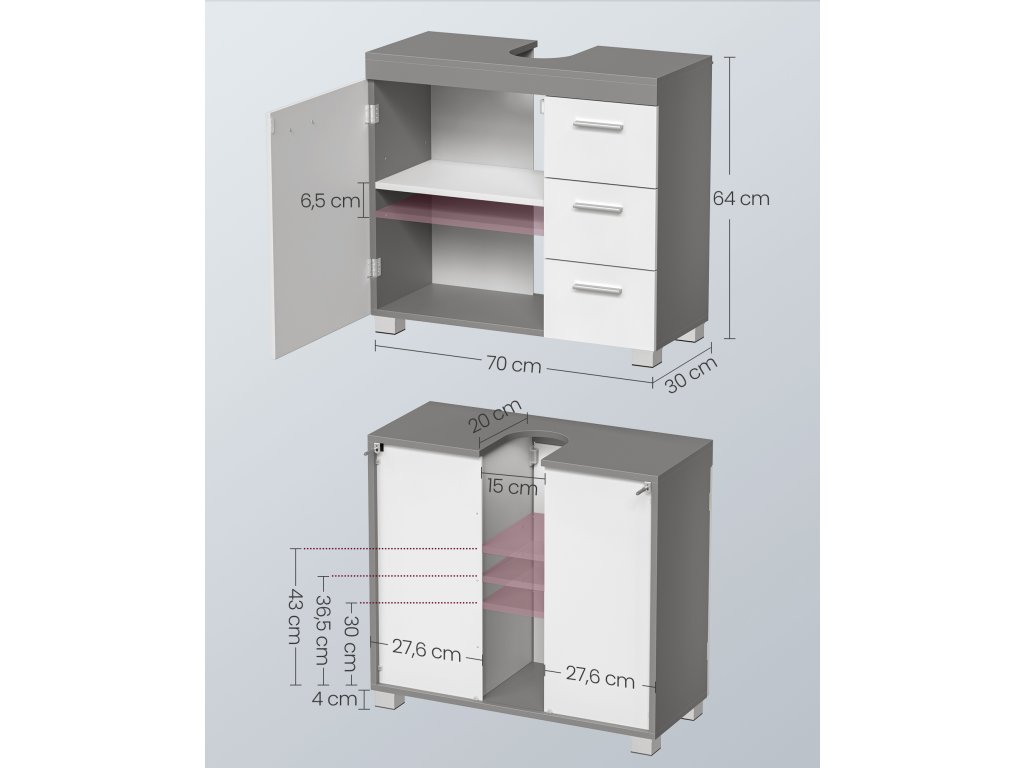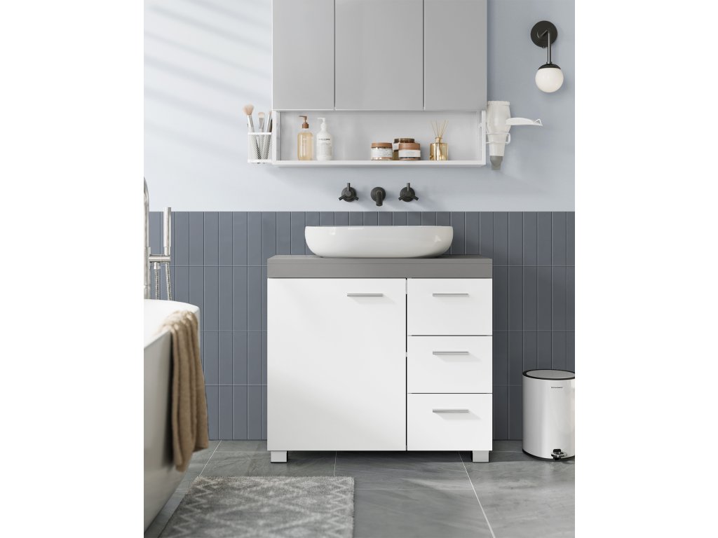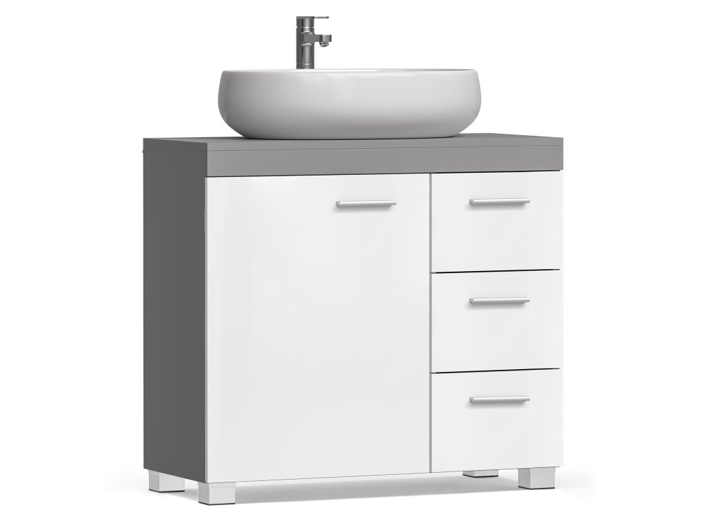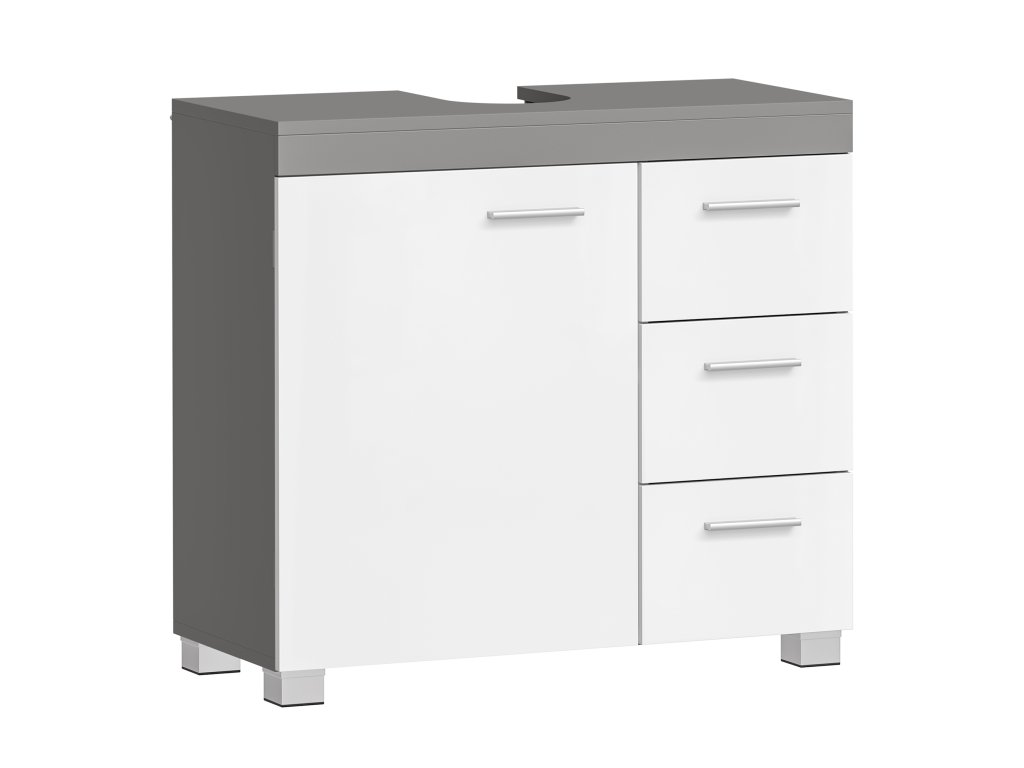 Koupelnová skříňka, 3 velké zásuvky, 30 x 70 x 64 cm, koupelnová skříňka, 2 přihrádky za dveřmi, koupelnová skříňka s nožičkami, bílo-šedá.