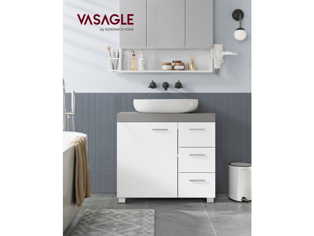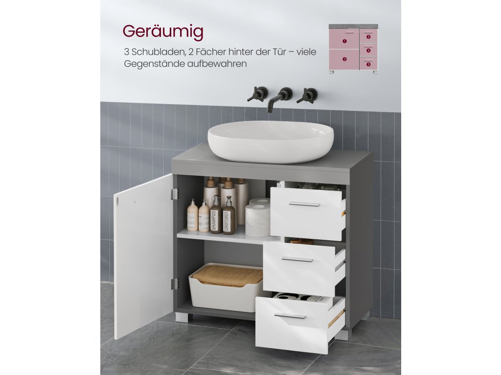 Dostatek úložného prostoru Díky 3 velkým bočním zásuvkám a 2 přihrádkám za dvířky skříňky nabízí tato toaletní skříňka dostatek úložného prostoru pro ukládání koupelnových potřeb, ručníků atd.Výškově nastavitelná polička a praktické úchyty Polička ve skříňce je nastavitelná do 3 úrovní, což umožňuje ukládat lahvičky šamponu a sprchového gelu různých velikostí. Dvířka skříňky a zásuvky se snadno otevírají díky úchytkám.Robustní a stabilní Tato koupelnová skříňka vyrobená z vysoce kvalitní MDF je odolná a bude vám sloužit mnoho let. Stabilitu skříňce dodávají přiložená zařízení proti překlopení.Snadná montáž Montáž této úložné jednotky je snadná díky označeným dílům a přehledným ilustrovaným návodům.Poznámka Vezměte prosím na vědomí rozměry skříňky, výřez pro sifon a vzdálenost mezi nastavitelnou policí a podlahou, abyste se ujistili, že skříňka pasuje. Není vhodný pro dřezy s podstavcem.| Kategorie: | Koupelnový nábytek |