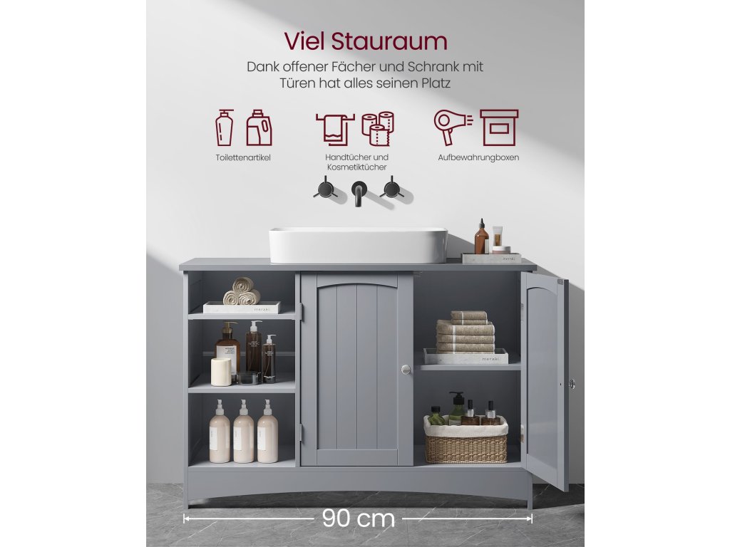 Koupelnová skříňka, extra dlouhá, 30 x 90 x 60 cm, koupelnová skříňka s dvojitými dveřmi a otevřenou policí, nastavitelné police, holubičí šedá.