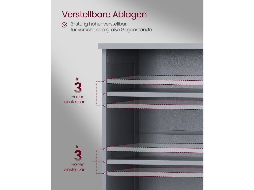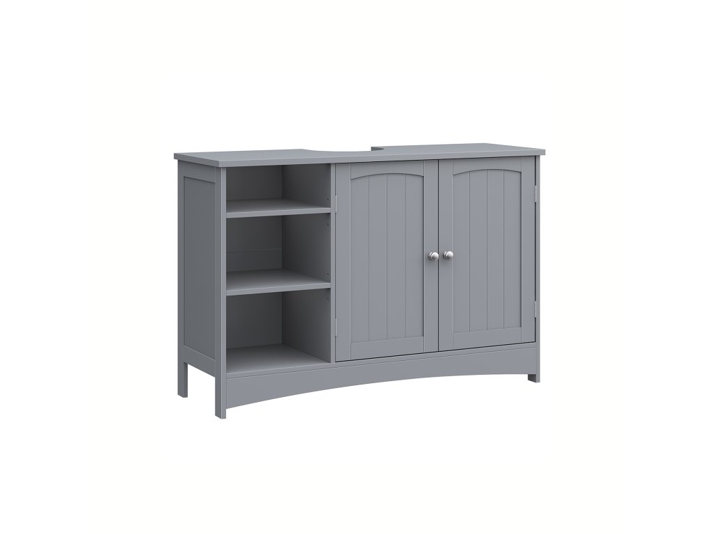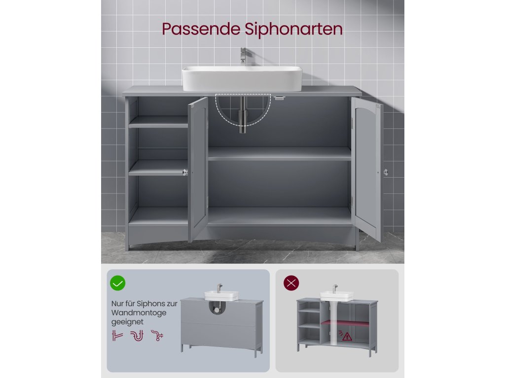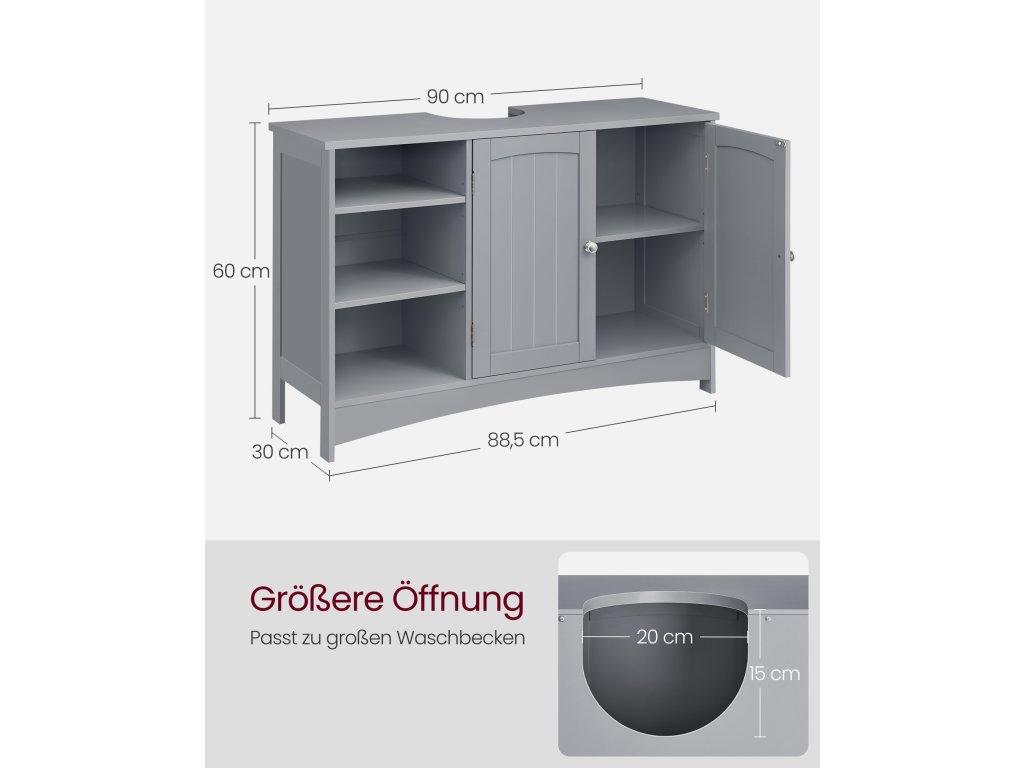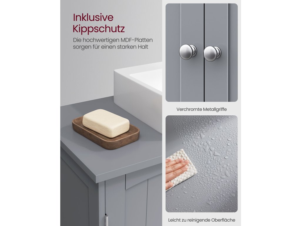 Vynikající kvalita díky detailům Kvalitní desky MDF, hladký a snadno udržovatelný povrch a vynikající zpracování vytvářejí tuto toaletní skříňku, která je ideální pro ty, kteří touží po kvalitě!Závan čerstvého vzduchu v koupelně Holubičí šedá barva, dvířka s rafinovanými řezbami a chromované kovové knoflíky dodávají tomuto koupelnovému nábytku osobitý vzhled. Vnese do vaší koupelny svěží a relaxační nádech!.Nábytek plný prostoru Vlevo najdete otevřenou polici vybavenou 2 policemi nastavitelnými ve 3 úrovních. Často používané předměty, jako jsou hřebeny a parfémy, lze v těchto otevřených přihrádkách snadno uložit.Potřebujete také uzavřené prostory? Podívejte se doprava! Zde je oddíl s dvojitými dveřmi vybavený nastavitelnou policí ve 3 výškách. Náhradní ručníky a toaletní papír zde najdou vhodné místo.Malá nápověda při montáži vám usnadní práci Nabízíme vám srozumitelný, ilustrovaný návod a jasně označené díly, které vám usnadní montáž tohoto koupelnového nábytku.