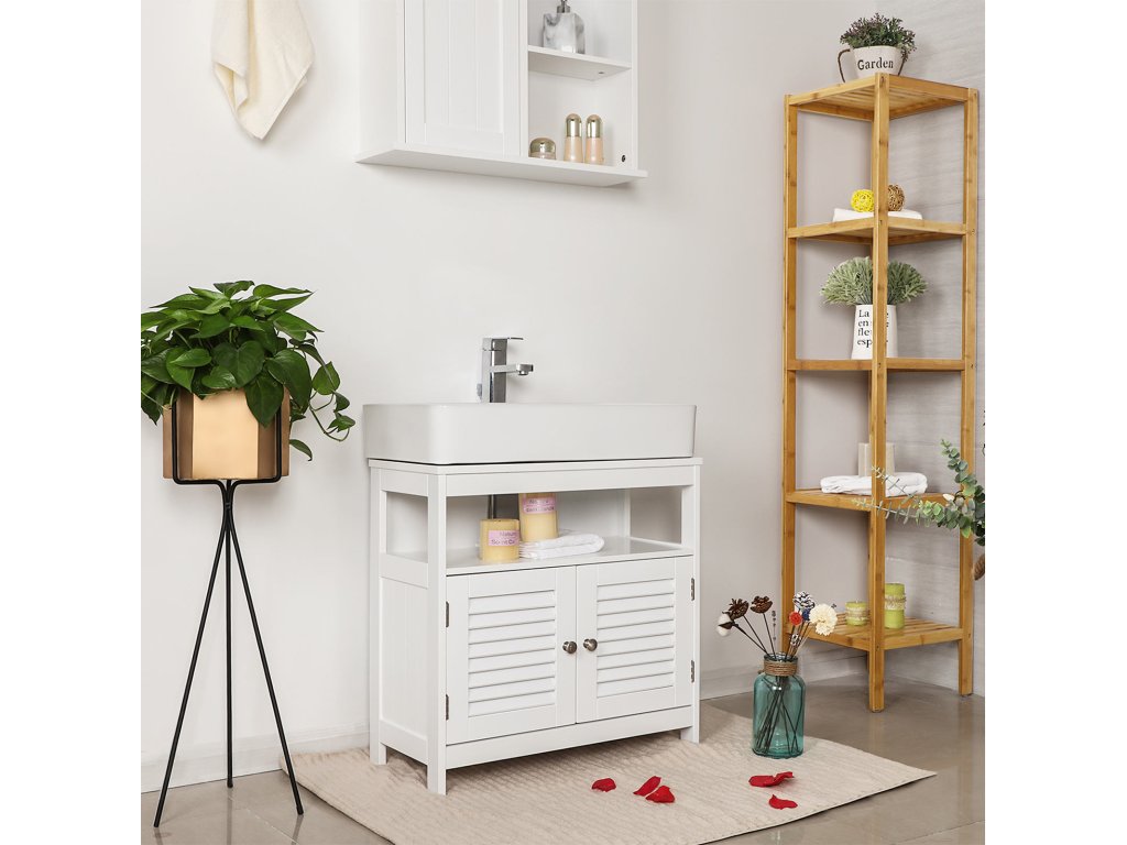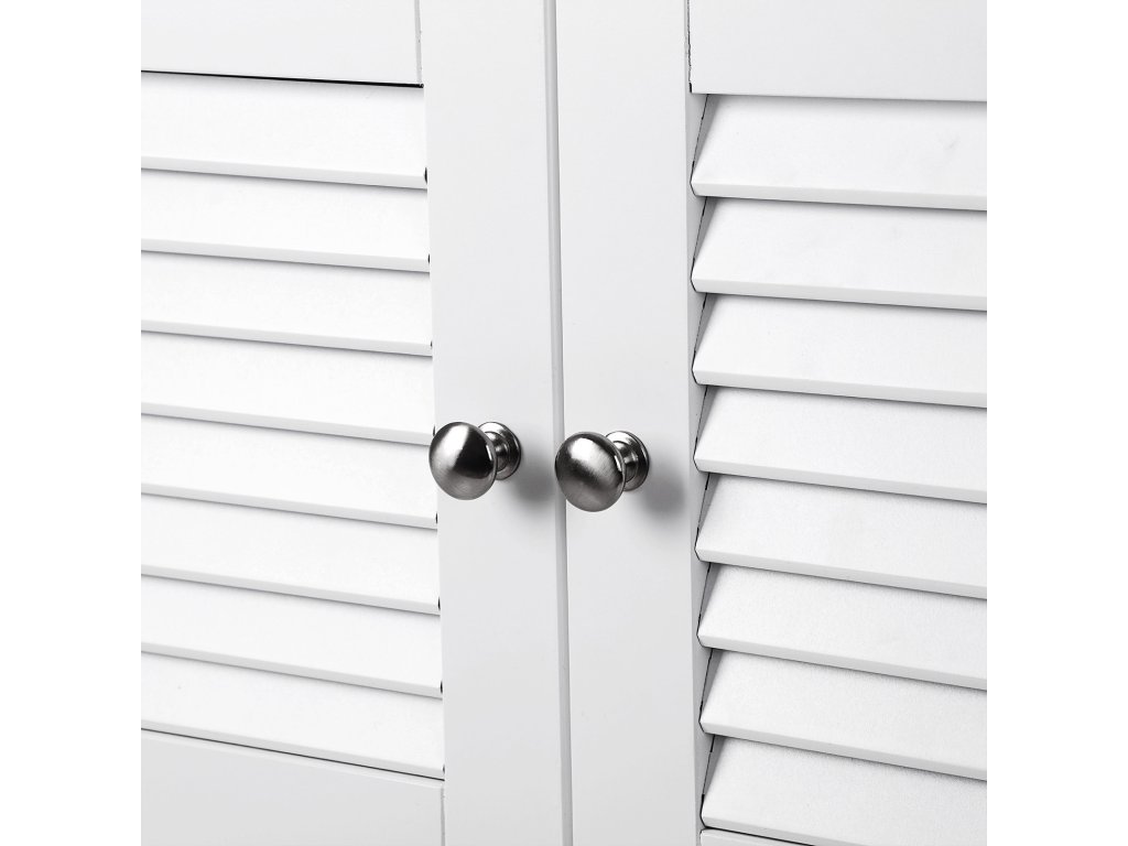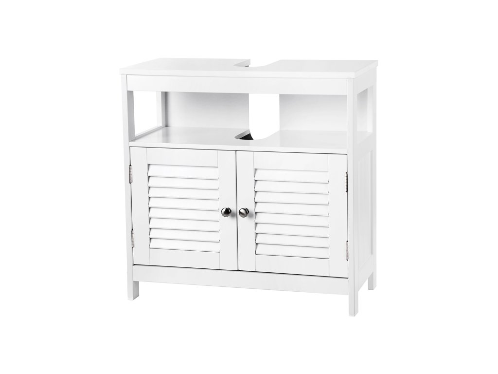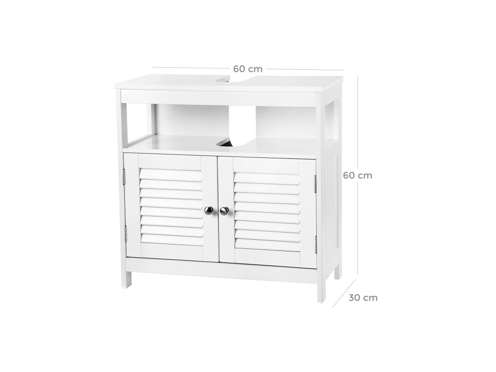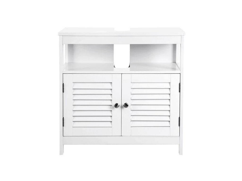 Nabízí dostatek úložného prostoru - v horní části: 1 otevřená přihrádka (vnitřní rozměry: (56 x 19 x 28 cm (š x v x h) pro snadné uložení často používaného náčiní; níže: 1 neprůhledná přihrádka za dveřmi (vnitřní rozměry: ručníky, toaletní papír a další koupelnové potřeby jsou chráněny před prachem, vodou a nežádoucími pohledy;2 lamelové dveře otočné o 180° - Elegantní lamelové dveře s kovovými úchytkami působí útulným venkovským dojmem, nadčasová bílá barva se hodí ke každému stylu interiéru; zároveň zajišťují dobré větrání, a tím zabraňují riziku vzniku plísní a zatuchlých pachů;