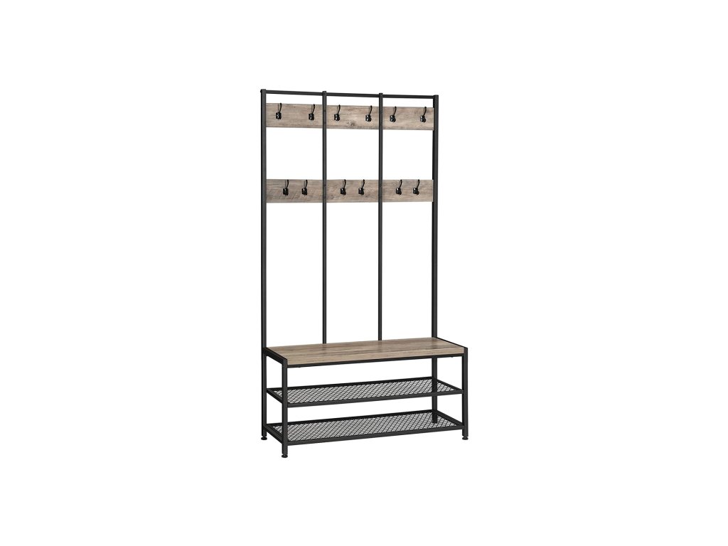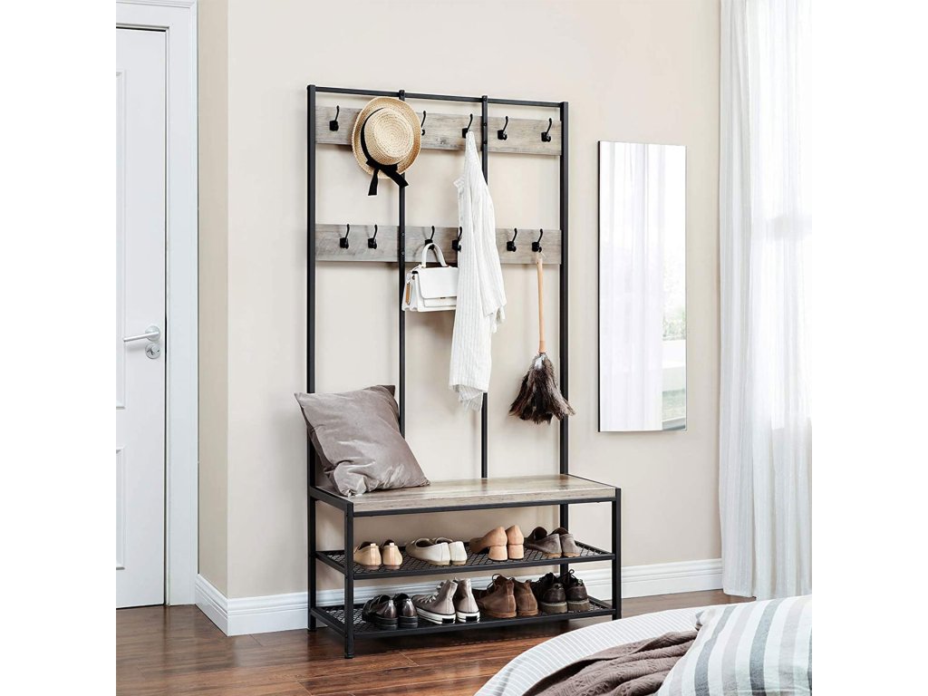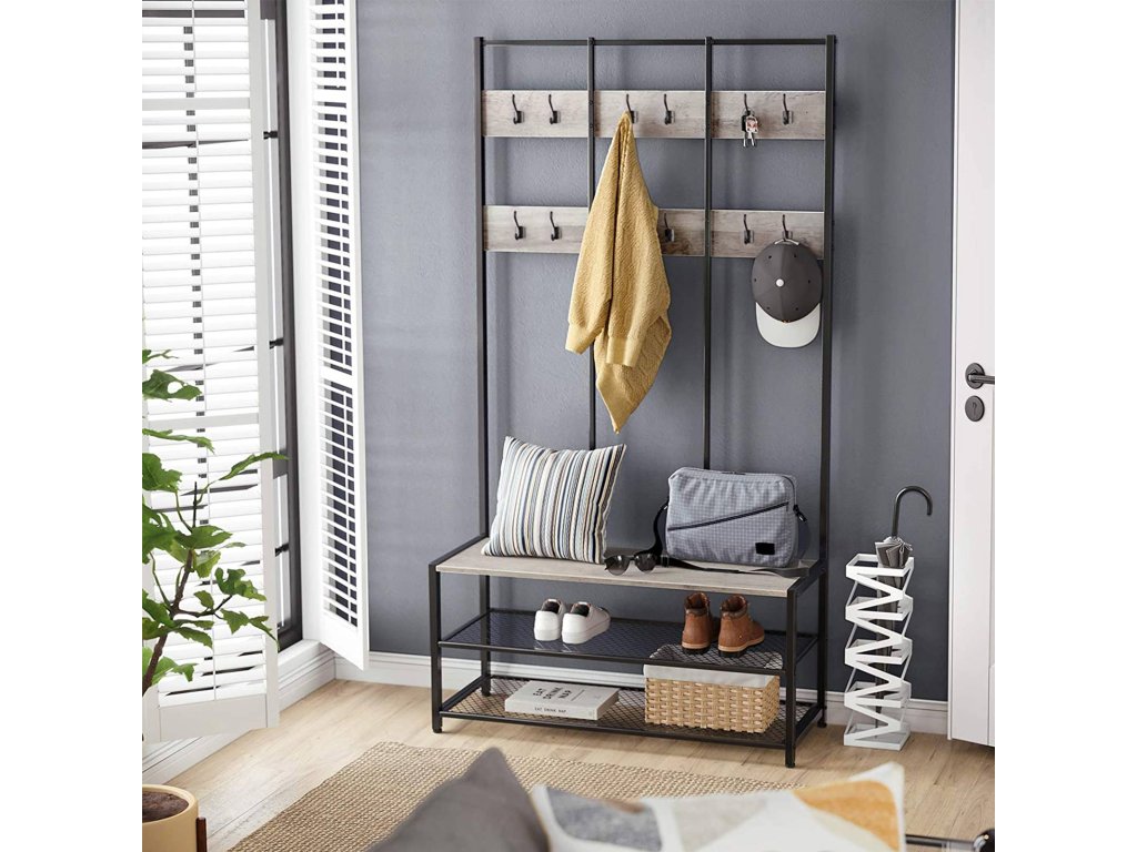 Velký stojan na kabáty, věšák s 12 háčky a lavicí na boty v průmyslovém designu, předsíňový strom, multifunkční police v předsíni, kanceláři, ložnici, béžová a černá.