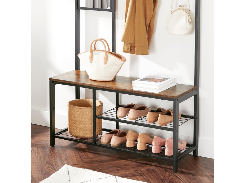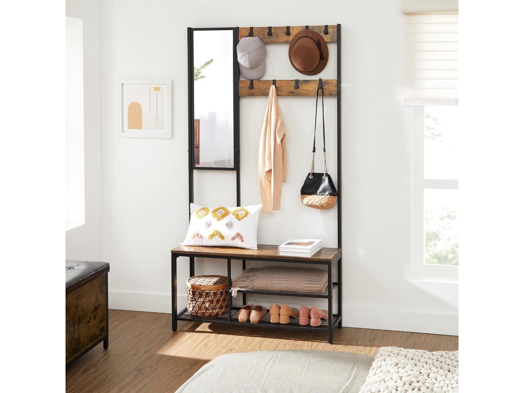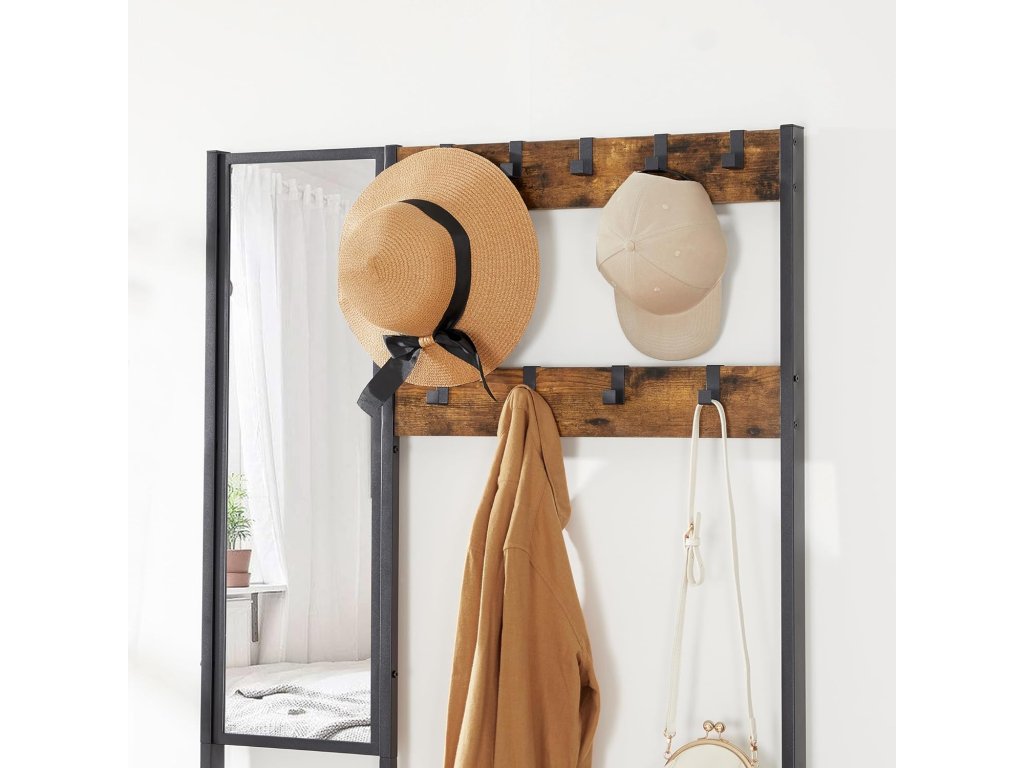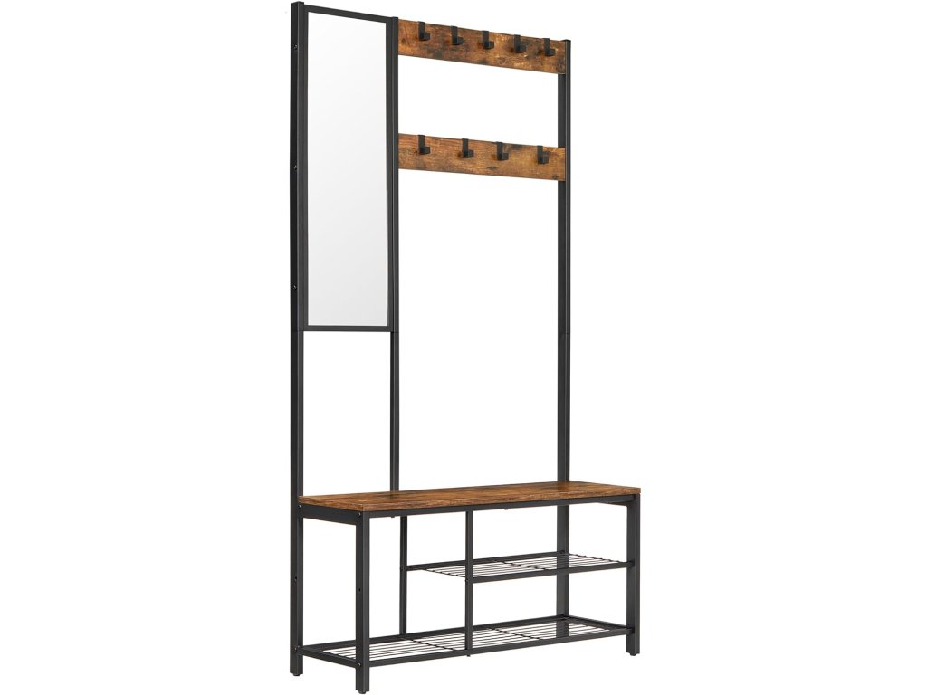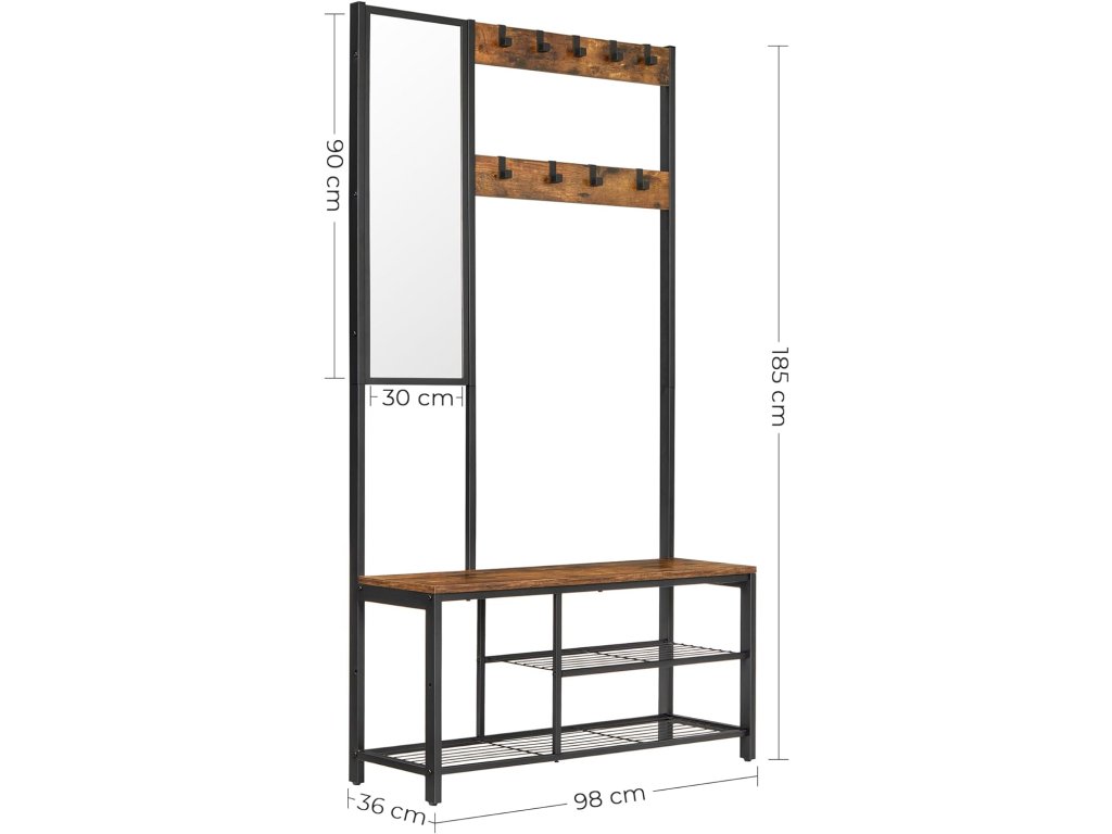 Věšák na kabáty, předsíňový nábytek s háčky, zrcadlem, botníkem a policemi, 36 x 98 x 185 cm, do předsíně, ložnice, obývacího pokoje, rustikální hnědá a černá.