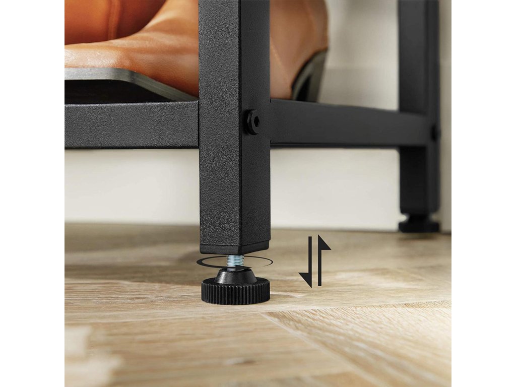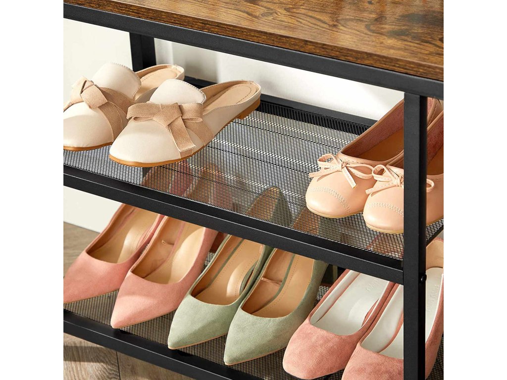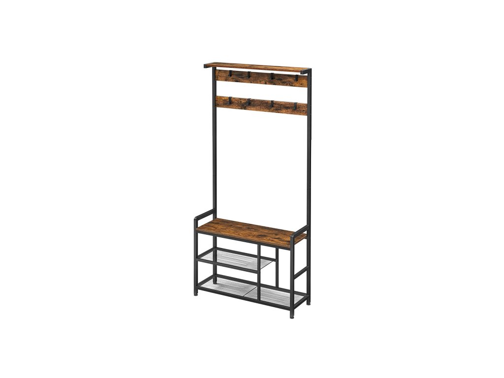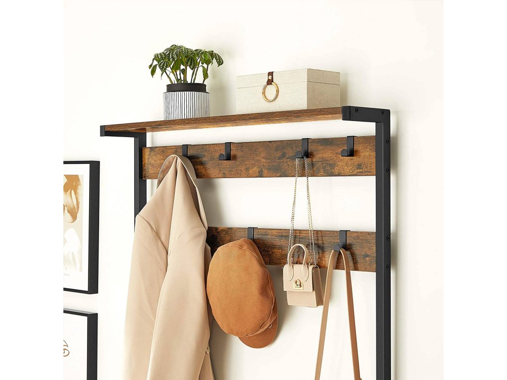 Věšák na kabáty, předsíňový strom s 8 háčky, lavice na boty, úložné police, do předsíně, ložnice, ocelový rám, průmyslový styl, rustikální hnědá a černá.