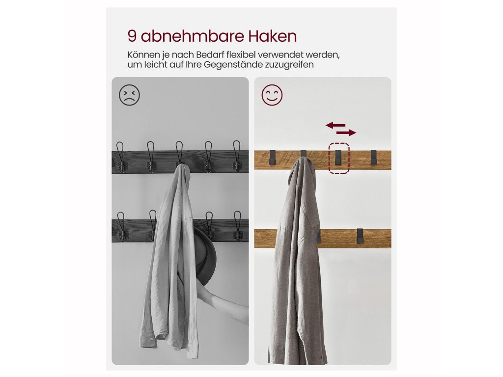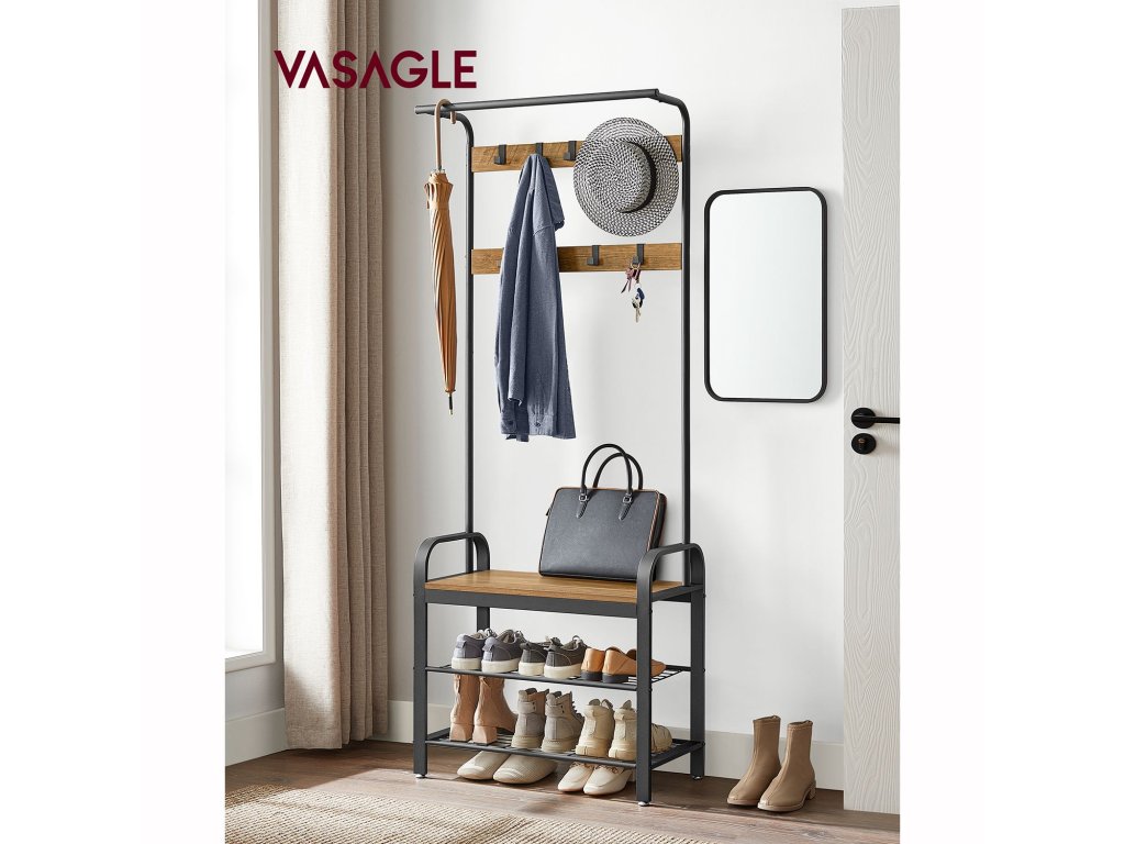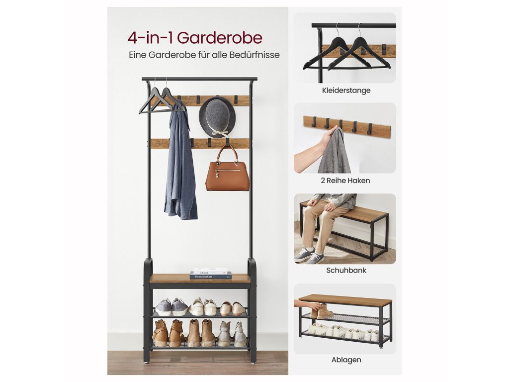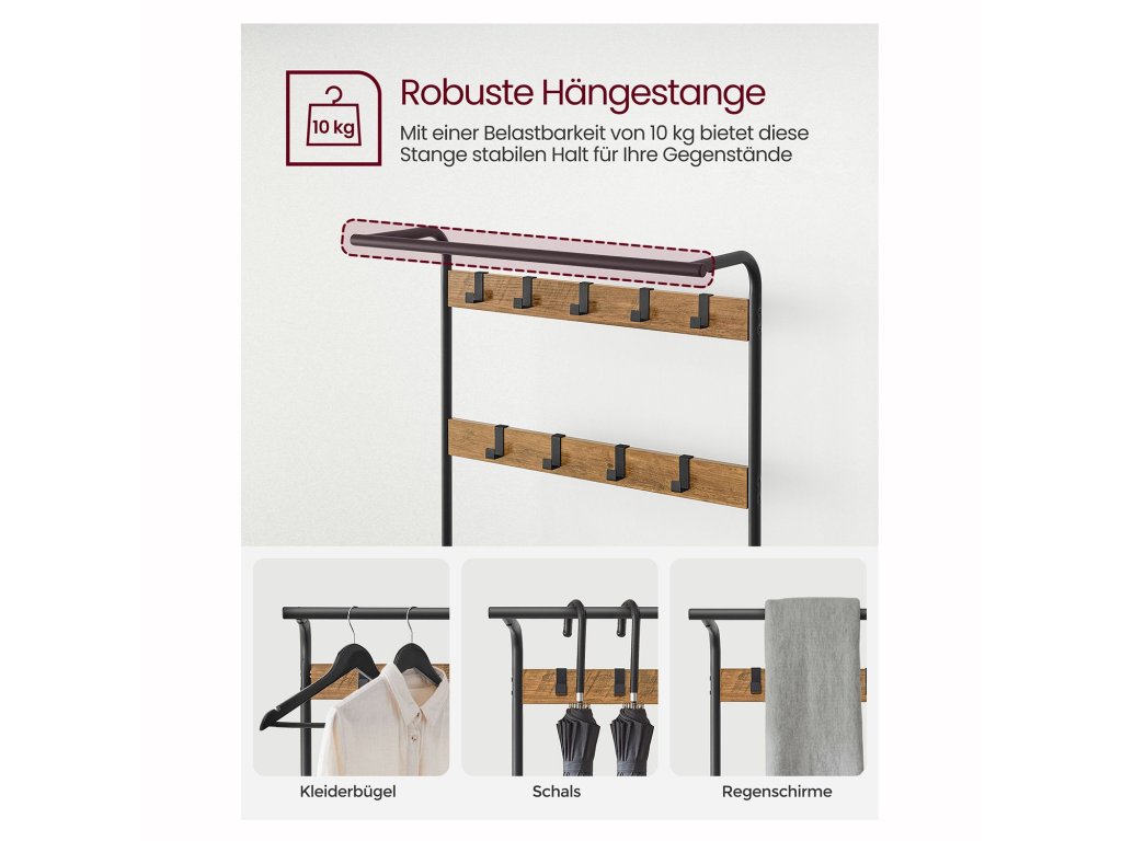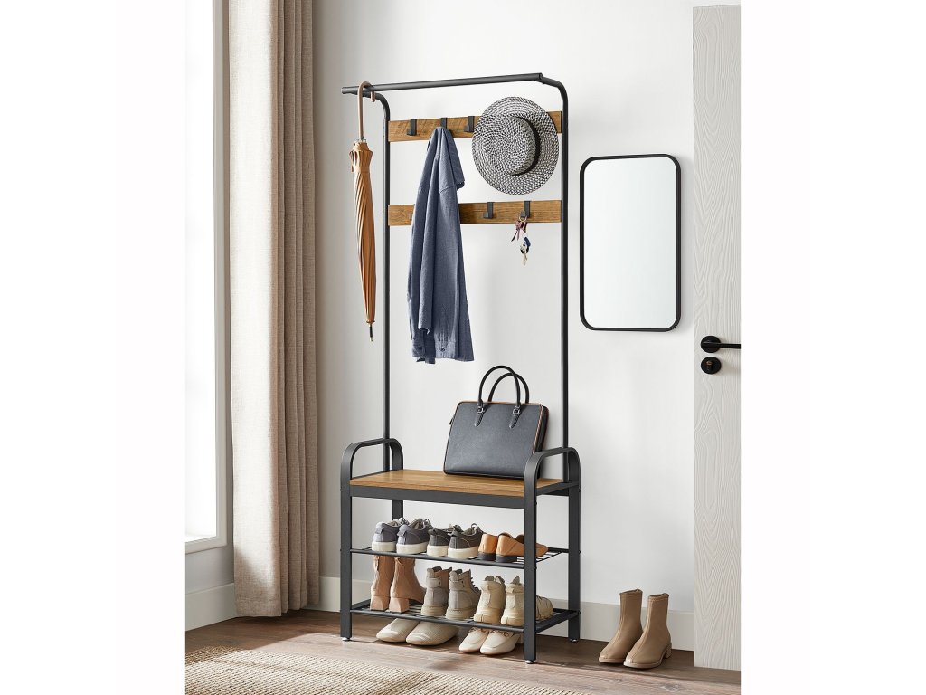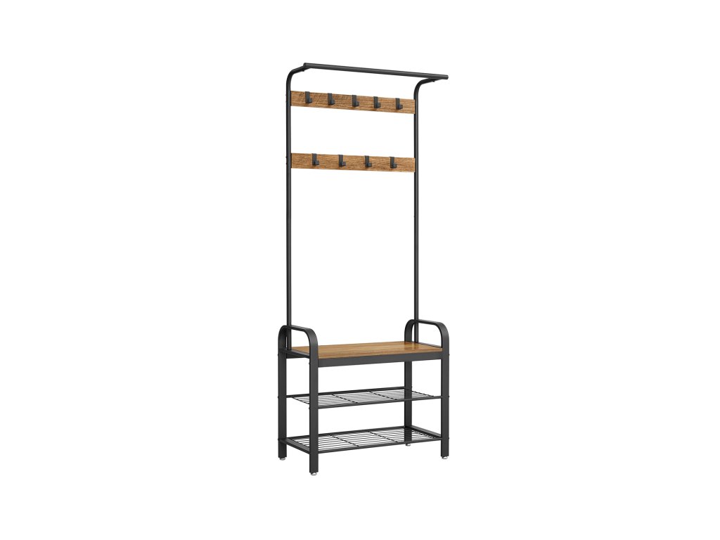 Věšák na kabáty, stojan na kabáty s lavicí na boty, design 4 v 1, 9 odnímatelných háčků, kolejnice na oblečení, do předsíně, vchod, 33,7 x 77 x 183 cm, průmyslový, rustikální ořech a černá.