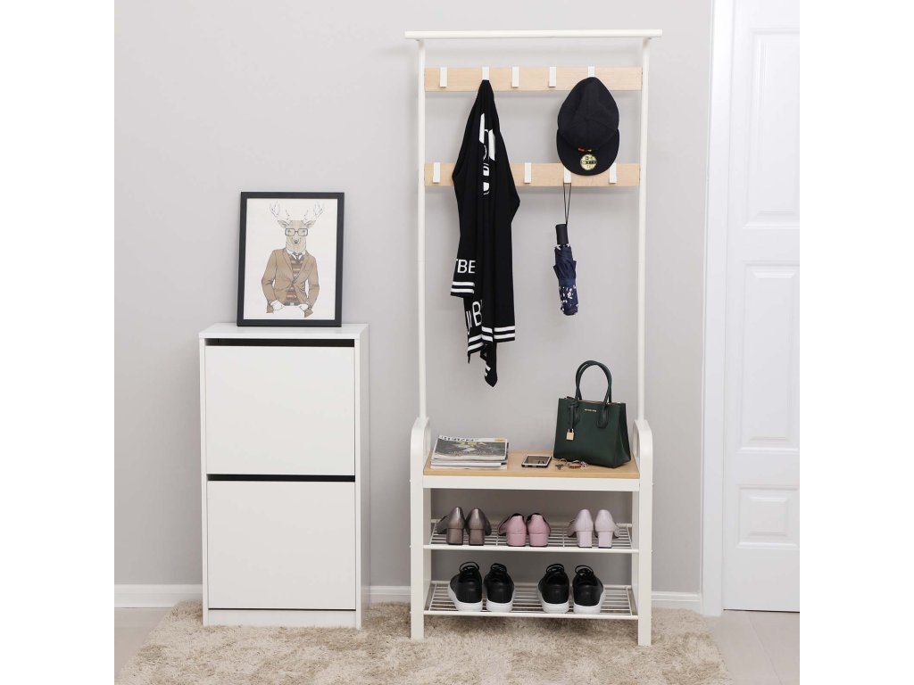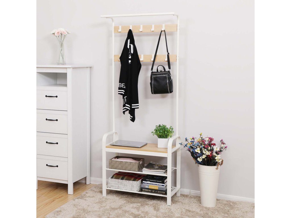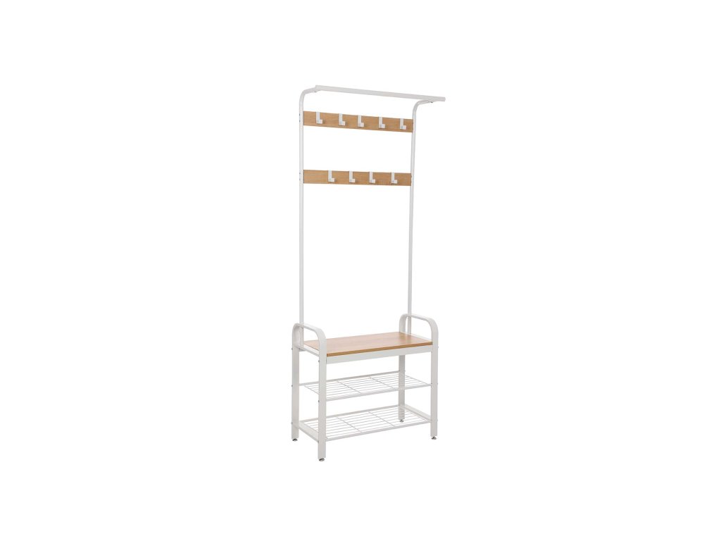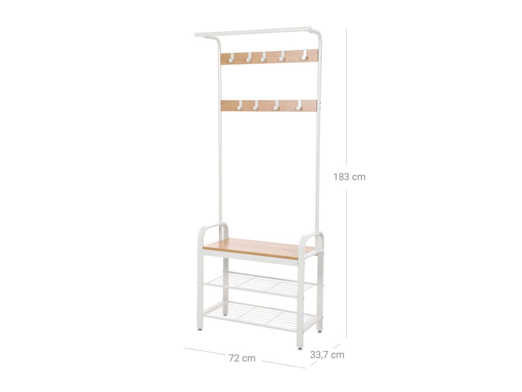 Věšák 4 v 1 Tato předsíňová úložná jednotka kombinuje věšákovou tyč, lavici na boty, botník a háčky na kabáty, aby splnila vaše různé potřeby - od zavěšení oblečení, uspořádání obuvi a pohodlné sezení při přezouváníPraktická závěsná lišta Pevná a stabilní horní lišta na oděvy tohoto stojanu na kabáty maximalizuje vertikální prostor a umožňuje zavěsit šály a deštníky nebo přidat ramínka pro zavěšení dalších oděvů.9 kvalitních odnímatelných háčků Tento stojan na kabáty do předsíně je vybaven 9 odnímatelnými háčky ve 2 řadách, které vám pomohou zavěsit předměty různých velikostí. Jsou vyrobeny z robustního kovu odolného proti korozi a jsou určeny k dlouhodobému používání.Robustní a stabilní Robustní ocelový rám, 3,8 cm široké nohy a kvalitní dřevotřísková deska vytvářejí tento robustní stojan na kabáty, jehož lavice na odkládání bot unese až 90 kg, abyste mohli v klidu sedět; sada proti překlopení zvyšuje celkovou stabilitu;Snadná montáž Díky očíslovaným dílům, jasnému návodu a videu s montážním návodem můžete tento věšák s úložným prostorem na boty bez problémů sestavit.| Kategorie: | Předsíňové stěny |