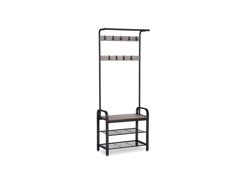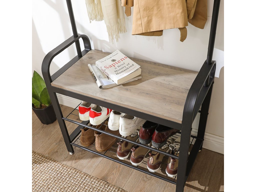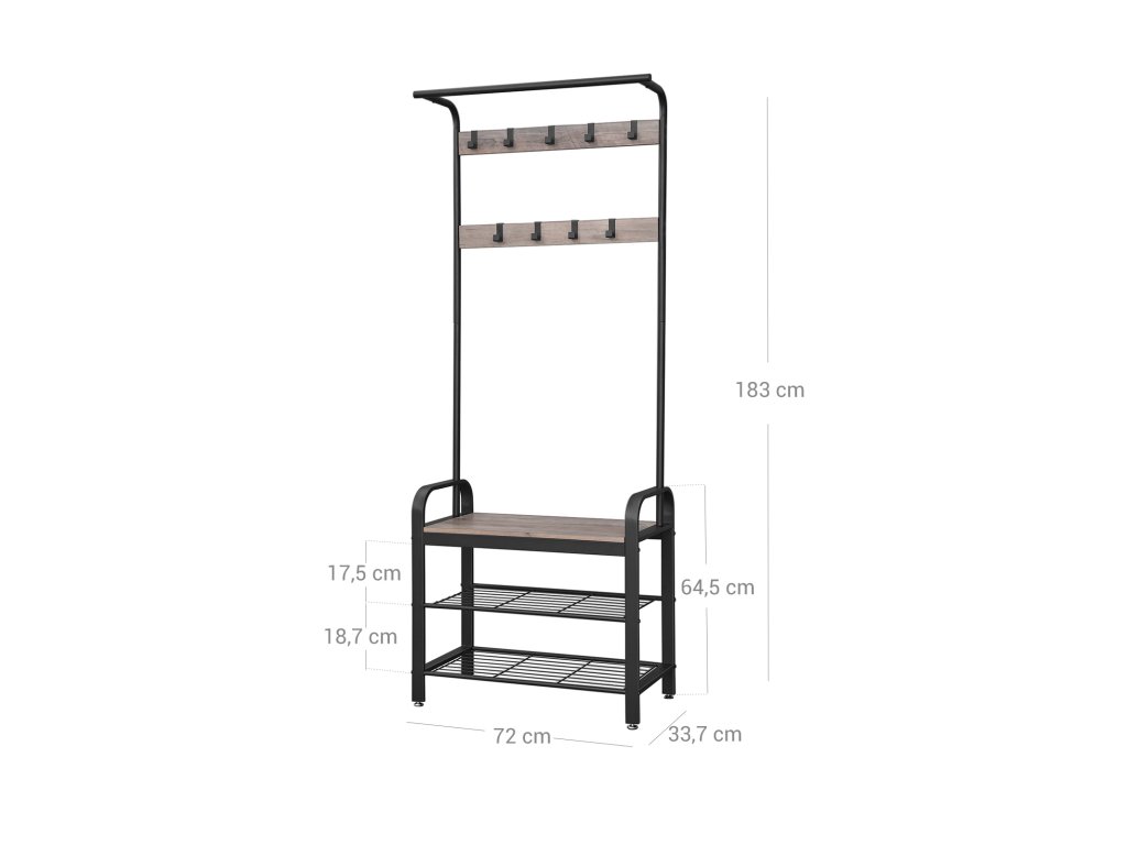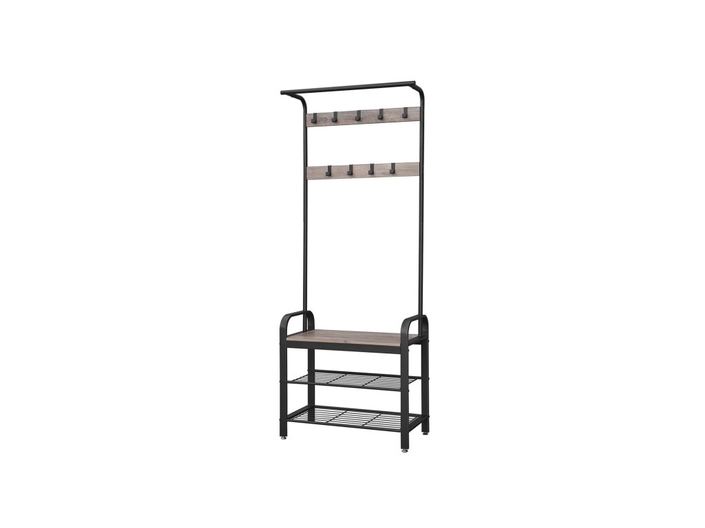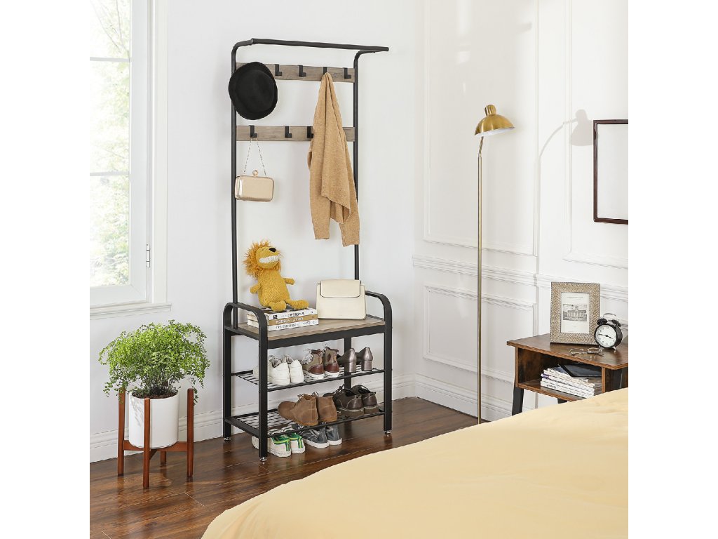 Věšák na kabáty, stojan na kabáty s lavicí na boty, design 4 v 1, 9 odnímatelných háčků, tyč na oděvy, do předsíně, vchod, 33,7 x 77 x 183 cm, průmyslový, béžový a černý.