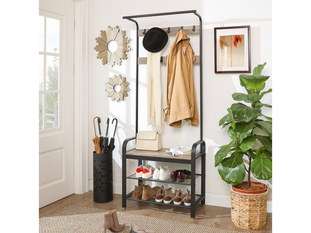 Věšák 4 v 1 Tato předsíňová úložná jednotka kombinuje věšákovou tyč, lavici na boty, botník a háčky na kabáty, aby splnila vaše různé potřeby - od zavěšení oblečení, uspořádání obuvi a pohodlné sezení při přezouváníPraktická závěsná lišta Pevná a stabilní horní lišta na oděvy tohoto stojanu na kabáty maximalizuje vertikální prostor a umožňuje zavěsit šály a deštníky nebo přidat ramínka pro zavěšení dalších oděvů.9 kvalitních odnímatelných háčků Tento stojan na kabáty do předsíně je vybaven 9 odnímatelnými háčky ve 2 řadách, které vám pomohou zavěsit předměty různých velikostí. Jsou vyrobeny z robustního kovu odolného proti korozi a jsou určeny k dlouhodobému používání.Robustní a stabilní Robustní ocelový rám, 3,8 cm široké nohy a kvalitní dřevotřísková deska vytvářejí tento robustní stojan na kabáty, jehož lavice na odkládání bot unese až 90 kg, abyste mohli v klidu sedět; sada proti překlopení zvyšuje celkovou stabilitu;Snadná montáž Díky očíslovaným dílům, jasnému návodu a videu s montážním návodem můžete tento věšák s úložným prostorem na boty bez problémů sestavit.| Kategorie: | Předsíňové stěny |