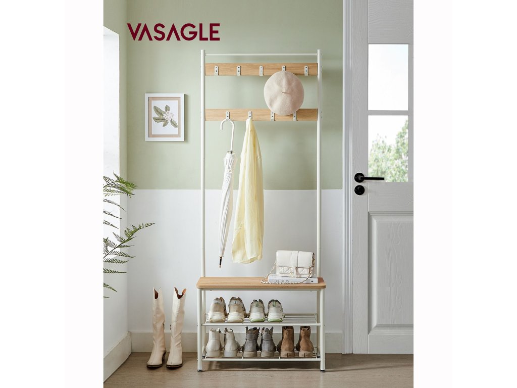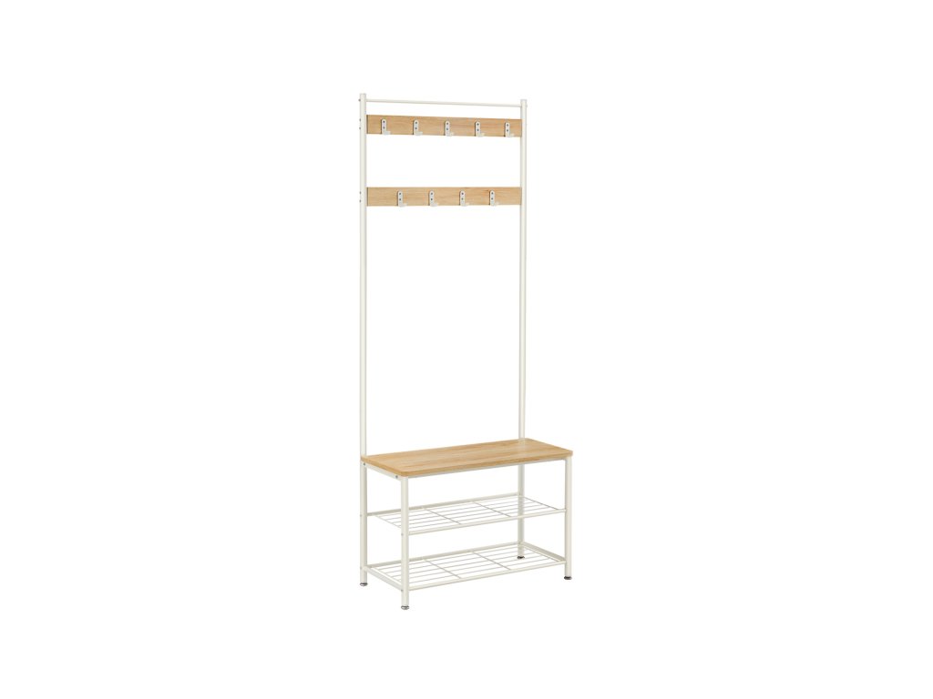 Věšák na kabáty, stojan na kabáty s lavicí na boty, předsíňový strom s botníkem, design 3 v 1, ocelový rám, do předsíně, vchod, 32 x 70 x 175 cm, moderní, barva dub a bílá.