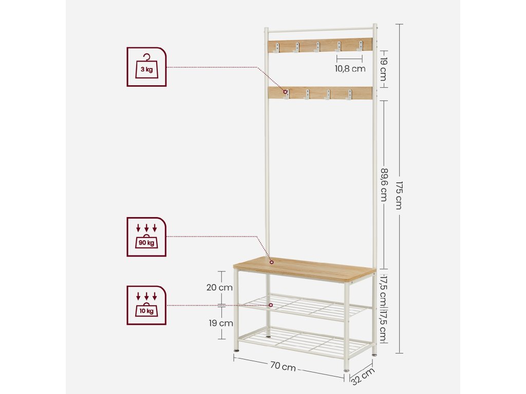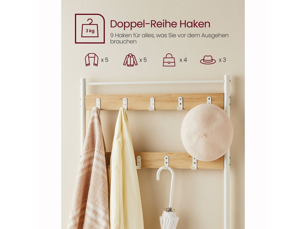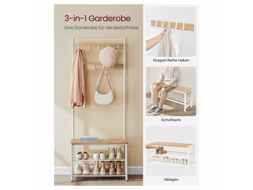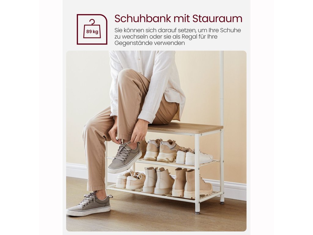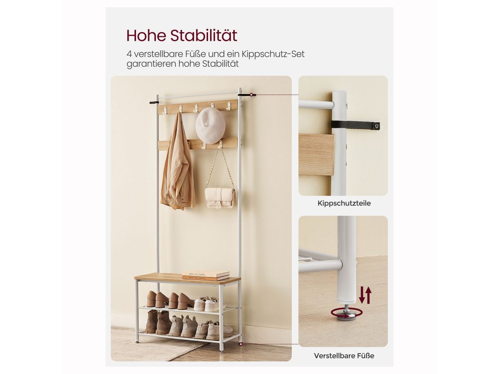 Věšák 3 v 1 Háčky na kabáty, lavička na boty a botník - tato univerzální úložná jednotka v předsíni vyhovuje všem vašim potřebám pro zavěšení oblečení, uspořádání bot. a posadit se, abyste si mohli obout nebo vyzout boty.9 robustních háčků 9 nerezových kovových háčků ve 2 řadách, z nichž každý unese až 3 kg, jsou robustní a odolné a nabízejí spoustu místa pro zavěšení kabátů, tašek, klobouků, šátků. a další předměty s sebou - ideální pro dlouhodobé použití.Robustní a stabilní Tento stojan na kabáty do předsíně se opírá o robustní ocelový rám a je vyrovnán pomocí 4 nastavitelných nožiček; přiložená sada proti překlopení zvyšuje celkovou stabilitu;Lavice na boty s policemi Lavice tohoto stojanu na kabáty vám díky nosnosti 90 kg umožní klidné sezení. Můžete ji také použít jako úložnou polici na krabice na boty a úložné boxy nebo na vystavení rostlin a dekorací.Snadná montáž Díky jednoduché konstrukci, očíslovaným dílům a jasnému návodu můžete tento věšák s úložným prostorem na boty bez problémů sestavit.| Kategorie: | Předsíňové stěny |
