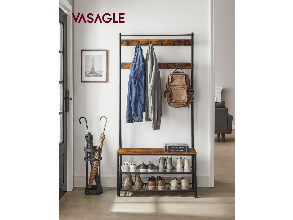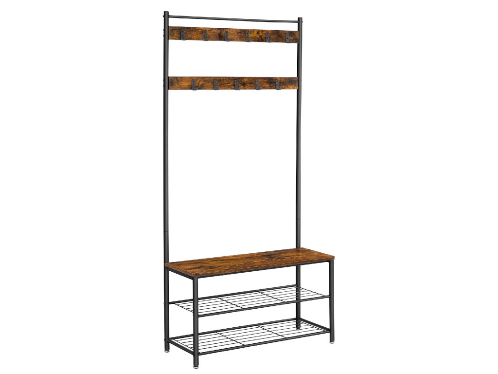 Věšák na kabáty, stojan na kabáty s lavicí na boty, předsíňový strom s botníkem, design 3 v 1, ocelový rám, pro předsíň, vchod, 32 x 85 x 175 cm, průmyslový, rustikální hnědý a černý.