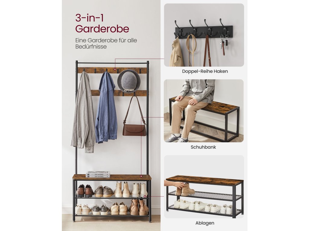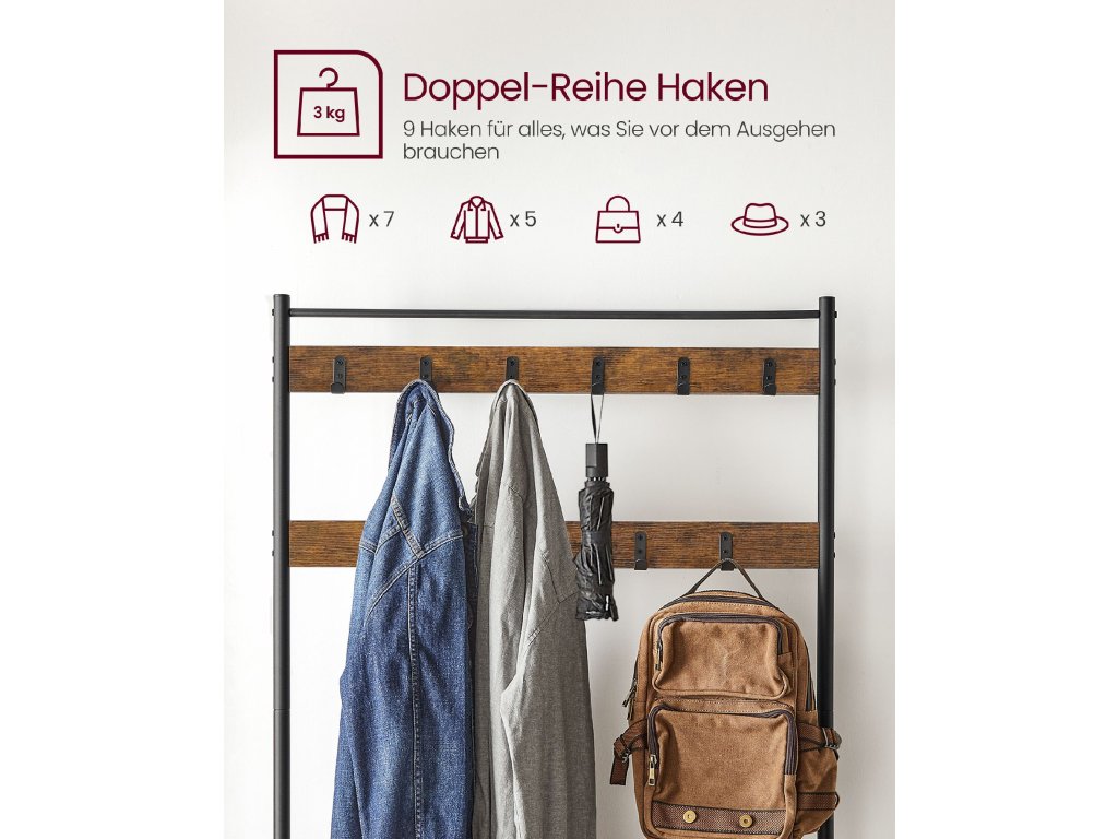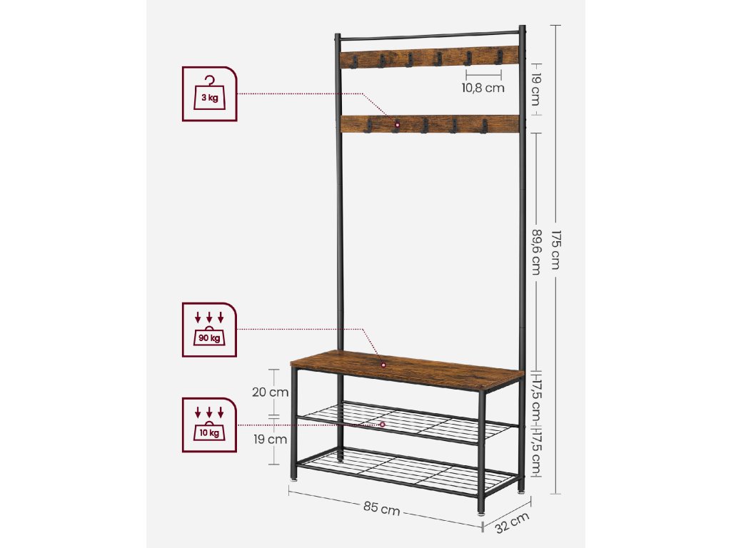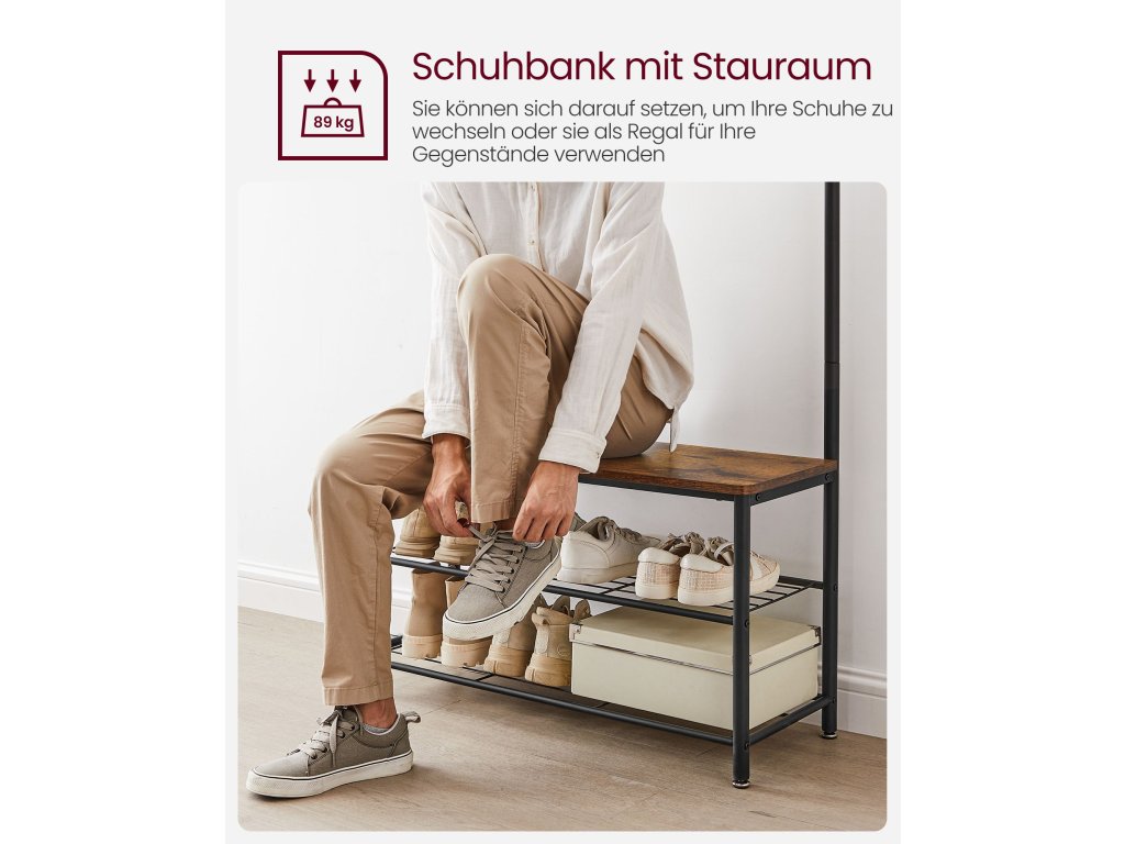 Věšák 3 v 1 Háčky na kabáty, lavička na boty a botník - tato univerzální úložná jednotka v předsíni vyhovuje všem vašim potřebám pro zavěšení oblečení, uspořádání bot. a posadit se, abyste si mohli obout nebo vyzout boty.9 robustních háčků 9 nerezových kovových háčků ve 2 řadách, z nichž každý unese až 3 kg, jsou robustní a odolné a nabízejí spoustu místa pro zavěšení kabátů, tašek, klobouků, šátků. a další předměty s sebou - ideální pro dlouhodobé použití.Robustní a stabilní Tento stojan na kabáty do předsíně se opírá o robustní ocelový rám a je vyrovnán pomocí 4 nastavitelných nožiček; přiložená sada proti překlopení zvyšuje celkovou stabilitu;Lavice na boty s policemi] Lavice tohoto stojanu na kabáty vám díky nosnosti 90 kg umožní klidné sezení. Můžete ji také použít jako úložnou polici na krabice na boty a úložné boxy nebo na vystavení rostlin a dekorací.
