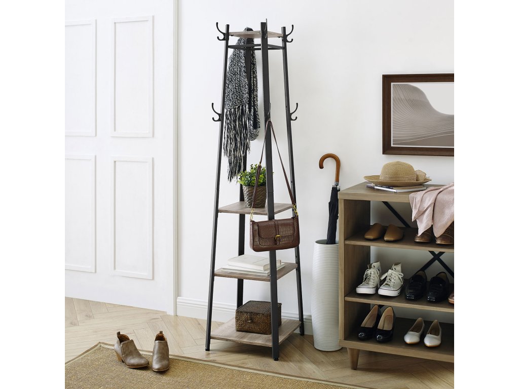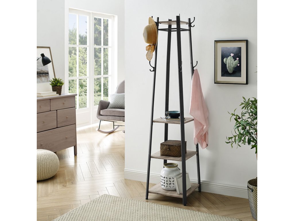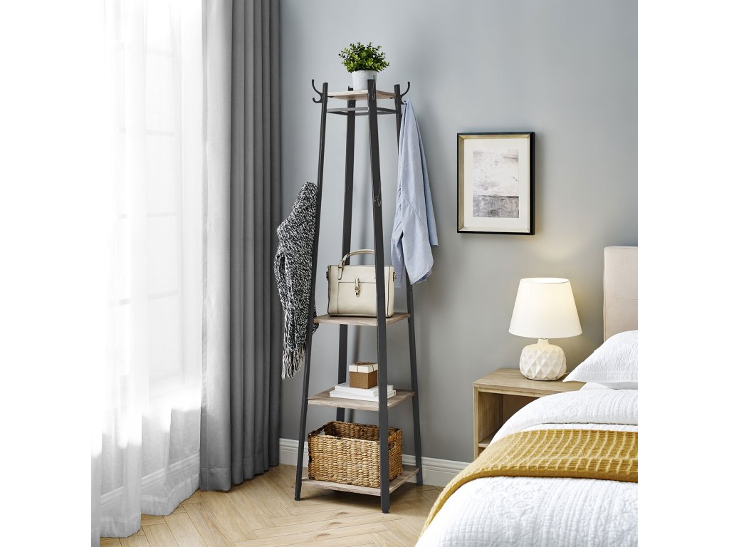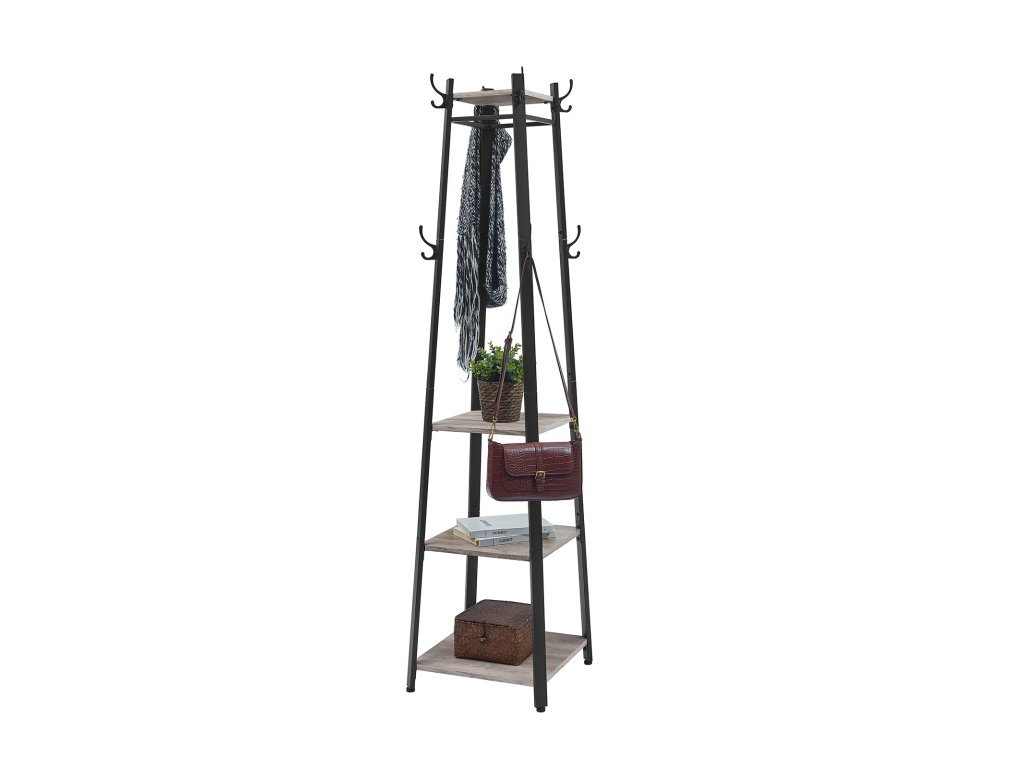 DVA KAMENY S JEDNÍM KAMENEM: Tento stylový věšák vnese do vašeho vchodu industriální nádech a zároveň vytvoří dostatek úložného prostoru pro bundy, kabáty, čepice a tašky.INOVATIVNÍ A STABILNÍ DESIGN: Matně černý ocelový rám, jehož strany se směrem nahoru mírně zužují, dodává tomuto věšáku více než jen jedinečný tvar; zajišťuje také stabilitu a pevně podpírá tři police;KABELY, KABELKY A VĚŠÁKY: Úložný koš se umístí na police, klobouky na horní háčky a věšáky na závěsné tyče. Co ještě? Spodní háčky jsou ideální pro děti, aby si mohly pověsit kabáty a tašky ze školy.VŠUDE V DOBRÝCH RUKOU: Díky prostorově úspornému designu se tento věšák skvěle hodí i do malé předsíně a zároveň se skvěle vyjímá v rohu obývacího pokoje.CO ZÍSKÁTE: Věšák s 8 háčky a 3 policemi, který se vejde do rohu místnosti a ušetří místo. Tento věšák je součástí naší kolekce ALINRU!| Kategorie: | Stojany na oblečení |