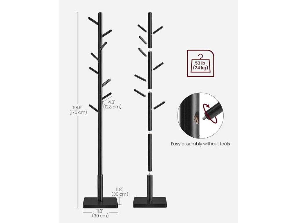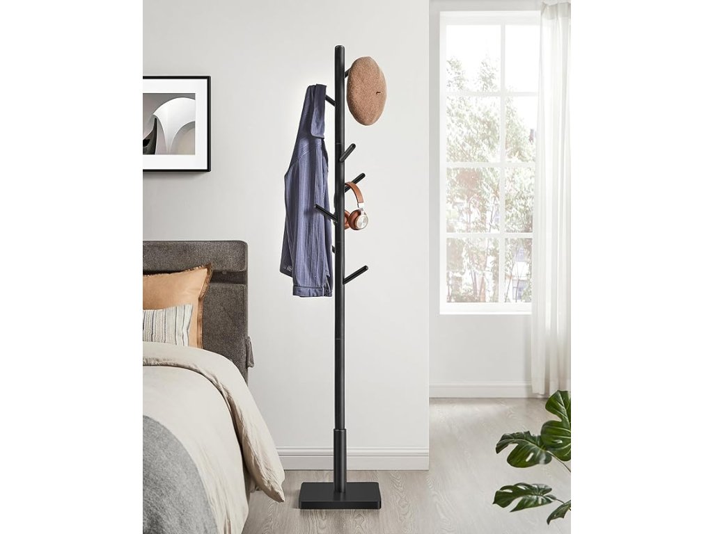 Věšák na kabáty, stojan na kabáty z masivního dřeva, volně stojící předsíňový strom s 8 háčky na kabáty, klobouky, tašky, kabelky, do předsíně, chodby, gumové háčky a tyč, inkoustově černý.