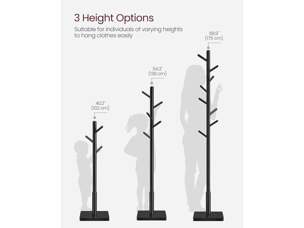 Snadná montáž Tento věšák je navržen se zabudovanými závitovými díly a k montáži nevyžaduje žádné další nářadí. Stačí háčky podle jasného návodu otočit na místo a vše je připraveno!.Trvalá pevnost, hladký povrch Tento volně stojící věšák, vyrobený z robustního kaučukového dřeva a opatřený třívrstvou povrchovou úpravou, je trvale kvalitní a nabízí hladký povrch. povrch vhodný pro oděvy3 výškové varianty Nastavitelný věšák se třemi různými výškovými variantami vyhovuje různým potřebám uživatelů. Je ideální pro každého člena rodiny, optimalizuje používání a snadno se přizpůsobí vašemu životnímu stylu.Stabilní a spolehlivý Věšák má robustní hlavní tyč o průměru 4 cm pevně spojenou s větvemi. Stojí pevně na stabilní čtvercové základně a bez obav unese celkem až 24 kg, přičemž každý hák unese 3 kg.Všestranná elegance Tento stojan na oblečení se díky svému elegantnímu minimalistickému designu snadno začlení do jakéhokoli prostředí. Je to víc než jen funkční prvek - je to elegance pro vaši chodbu, ložnici, kancelář nebo přijímací pokoj.| Kategorie: | Stojany na oblečení |