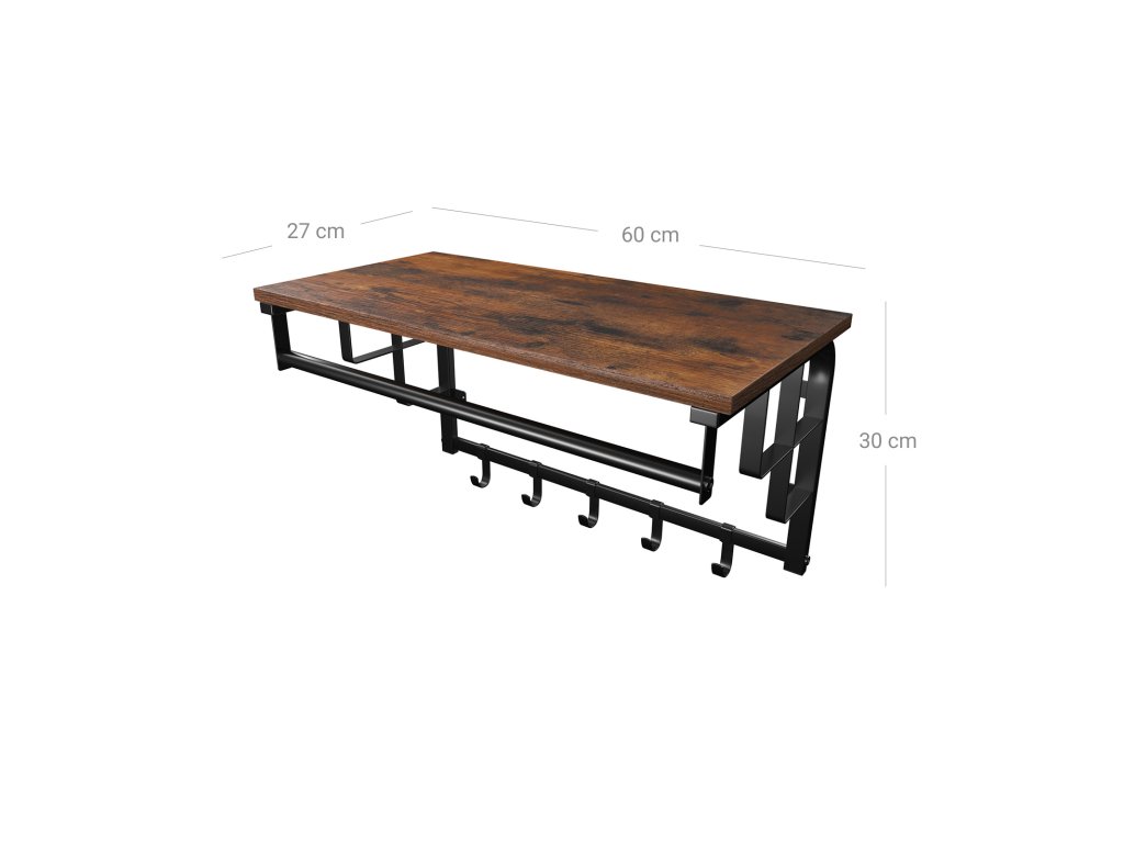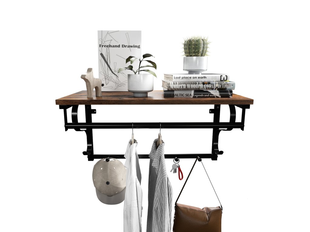 Plně využijte prostor na stěnách: Nástěnný věšák promění prázdnou stěnu v užitečný prostor, kde budou vaše kabáty, tašky, deštníky a klíče uspořádané a po ruce.Design tři v jednom: Včetně velké police (66 x 30 cm), závěsné lišty a 5 háčků, které vyhoví vašim různým potřebám s minimálním prostorem.Vyrobeno tak, aby vydrželo: Ocelový rám poskytuje pevnou a stabilní oporu; vylepšené rozpěrné šrouby a šrouby pro větší pevnost; police unese až 15 kg, každý háček 3 kg a závěsná lišta 10 kg.Univerzální a dekorativní: Vhodný do vstupní haly, předsíně nebo ložnice: kombinuje rustikální polici s černým rámem a dodává vašemu prostoru industriální elegantní vzhled.Co získáte: Nástěnný věšák z dřevotřísky a oceli s jasným návodem na snadnou montáž. Dopřejte si tento praktický kus nábytku z naší kolekce DAINTREE a zbavte se chaosu v předsíni!.| Kategorie: | Věšáky na zeď |