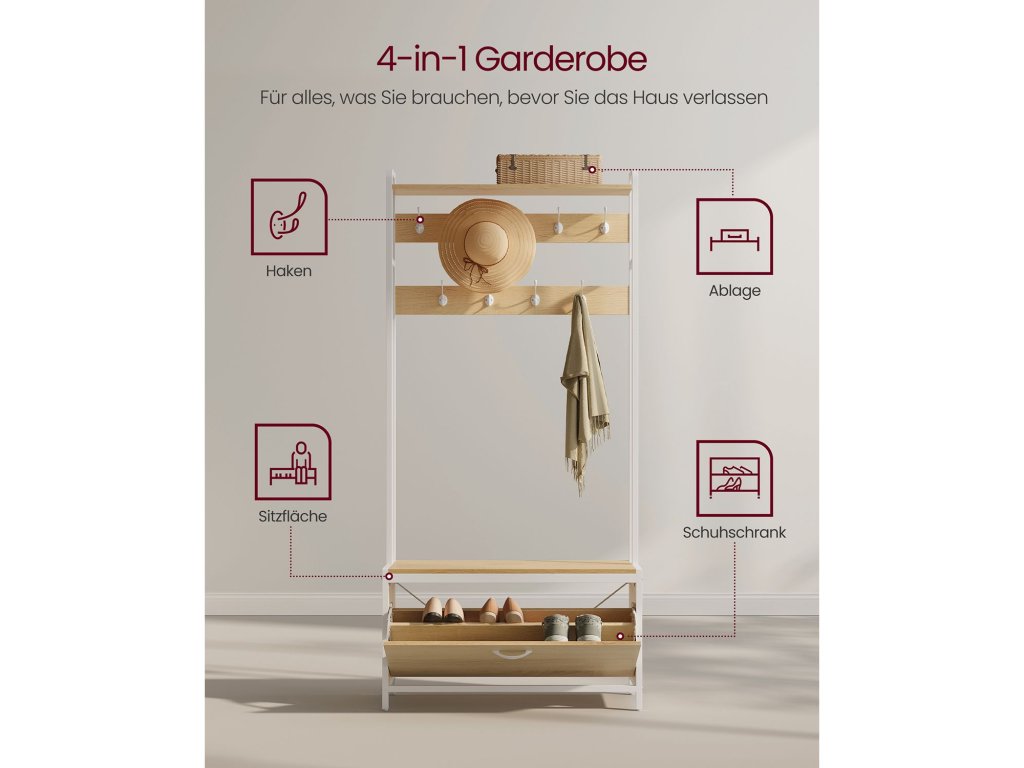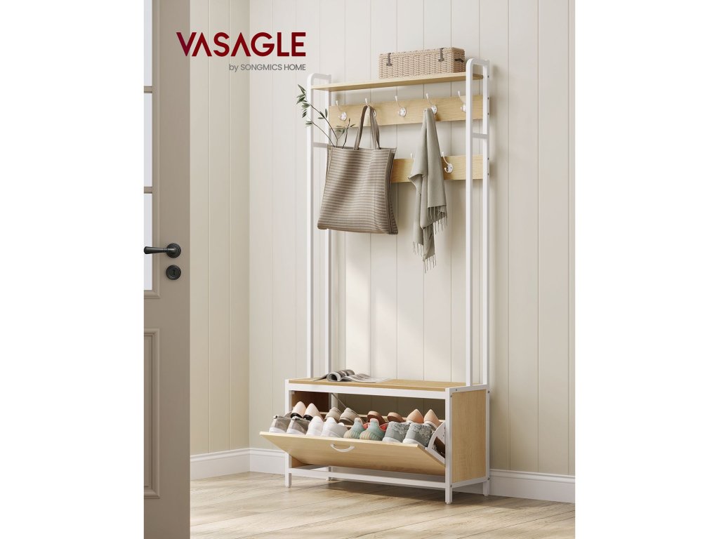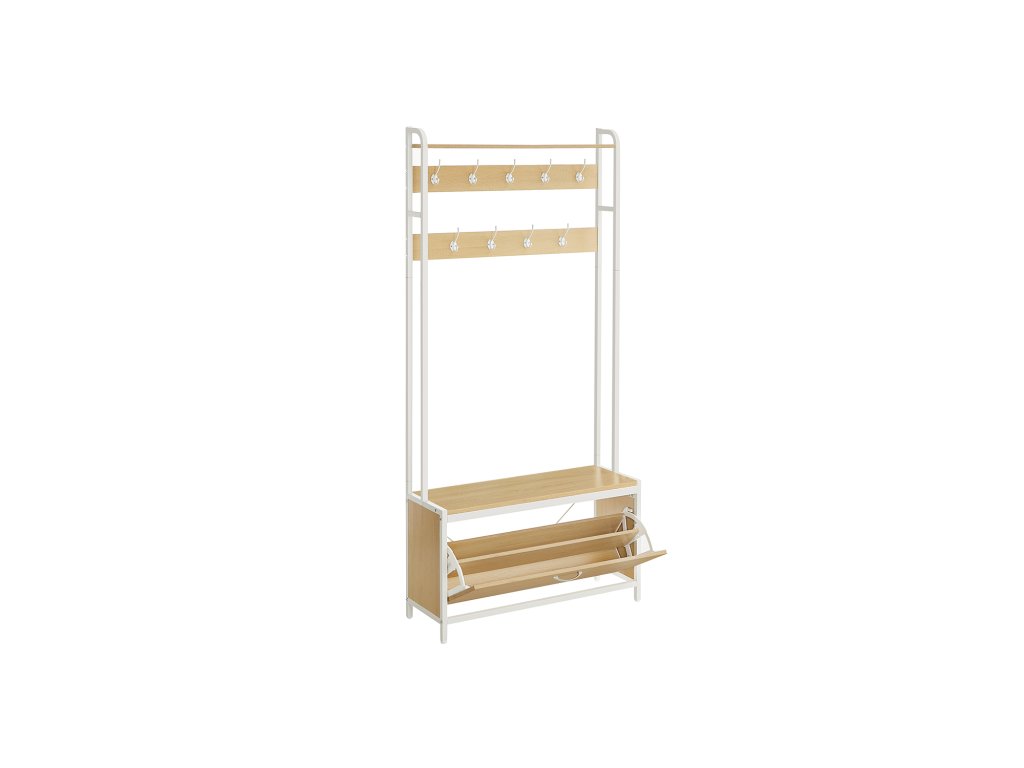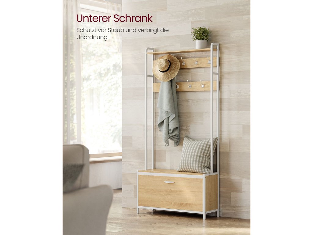 Věšák na kabáty s botníkem, věšák s lavicí, věšák na oblečení, výklopník na boty, 9 háčků, horní police, předsíň ložnice, moderní design, dub bílý.