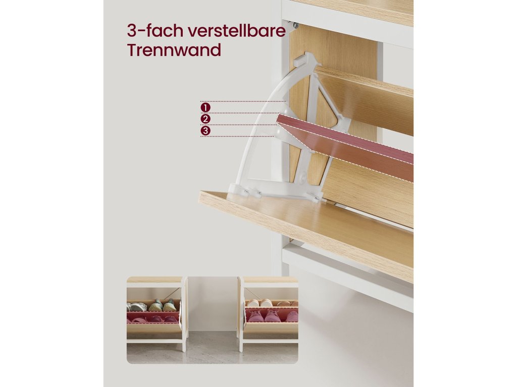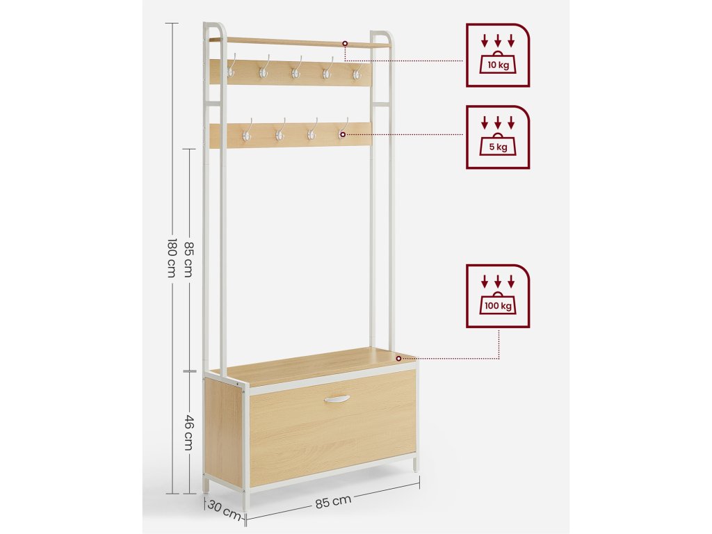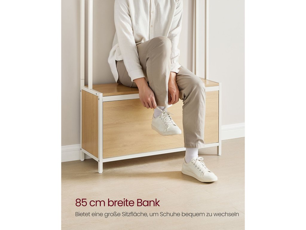 Multifunkční šatní skříň 9 háčků, botník s výklopnou přihrádkou, lavice o délce 85 cm, horní police - šatní skříň splňuje různé potřeby: zavěšení oblečení, uložení obuvi sedět při obouvání a ukládání věcí.Skládací přihrádka - chrání před prachem 30 cm hluboká skříňka je vybavena tříúrovňovou nastavitelnou přepážkou, takže do ní můžete uložit pantofle, tenisky i vysoké podpatky. Uzavřená přihrádka chrání před prachem a udržuje boty mimo dohled.Robustní: Díky konstrukci z oceli a dřevotřísky a V-vzpěrám na zadní straně je tento stojan na kabáty robustní a stabilní (lavice unese až 100 kg). Na lavici se jednoduše posaďte a pohodlně si obujte boty.Moderní design - pro jedinečnou atmosféru Kombinace dubové dřevotřísky a bílého ocelového rámu dodává tomuto věšáku moderní nádech a zvláštní charakter vaší předsíni.Co získáte: Věšák do předsíně 4 v 1, který kombinuje háčky, lavici, botník a polici, abyste co nejlépe využili prostor v předsíni. a srozumitelný návod (angličtina není zaručena) a označené díly pro snadnou montáž.| Kategorie: | Předsíňové stěny |