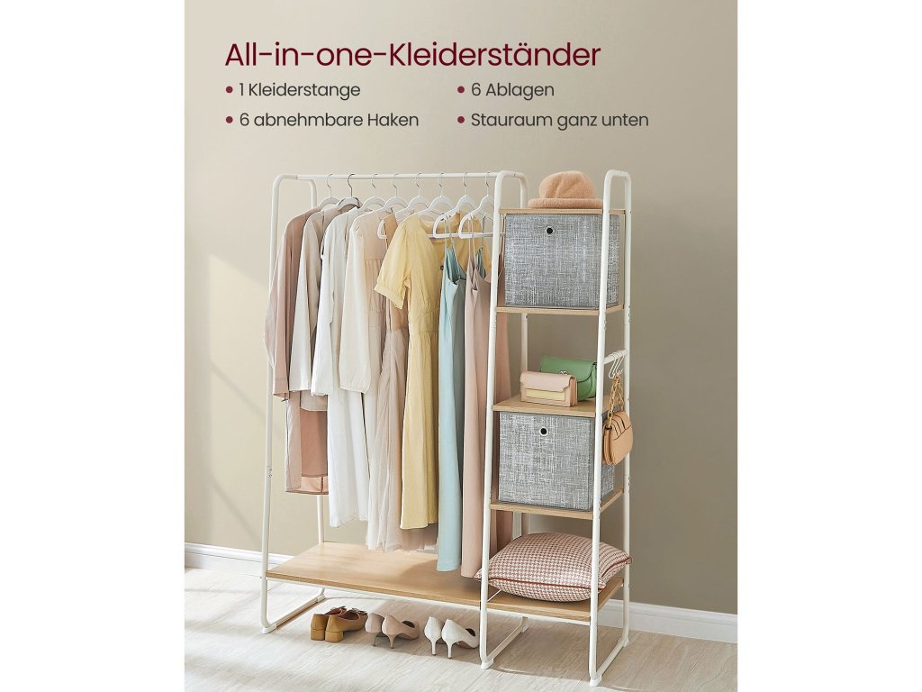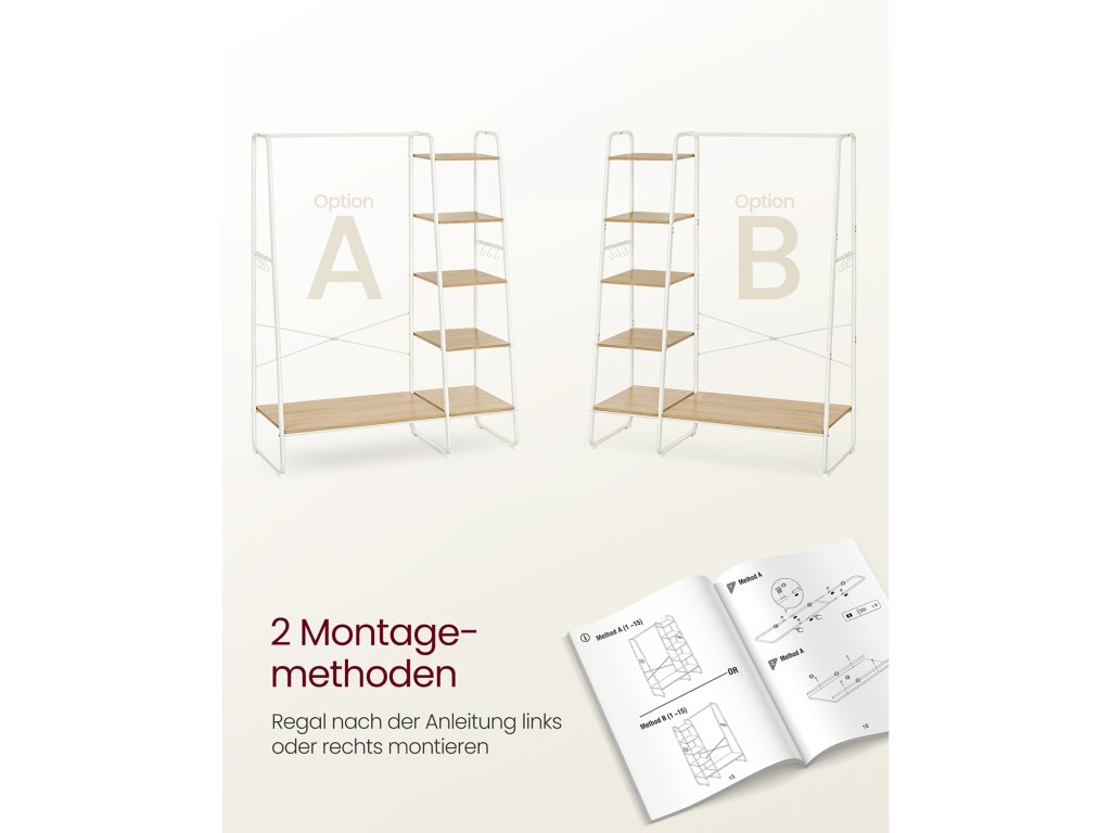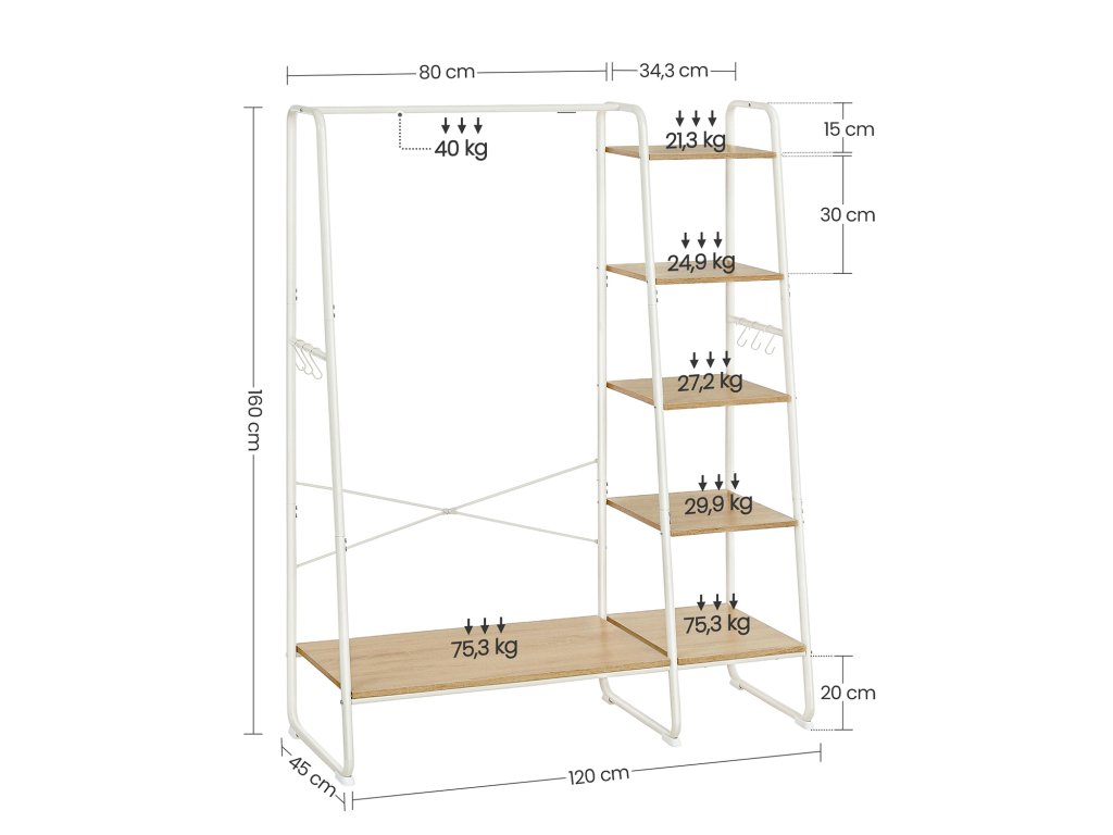 Univerzální věšák na oblečení Kolejnice na bundy nebo košile, 6 polic na tašky, krabice nebo rostliny, boční kolejnice se 6 odnímatelnými háčky na klobouky nebo doplňky, další úložný prostor ve spodní části na boty. [Spousta místa na zavěšení a otevřený design] Tento velký věšák o rozměrech 45 x 120 x 160 cm nabízí dostatek prostoru pro zavěšení i dlouhých kabátů. Díky otevřené konstrukci máte oblečení vždy po ruce, takže se můžete rychle připravit k odchodu. [Robustní a stabilní] Vysoce kvalitní dřevotříska, masivní ocelové trubky - věšák do předsíně je robustní, odolný a pružný (celková nosnost až 220 kg). Rám ve tvaru písmene A, vzpěry X na zadní straně, speciálně tvarované nohy - pro vysokou stabilitu. [Víceúčelovost] Tato otevřená šatní skříň se skvěle hodí do ložnice, šatny nebo předsíně - v závislosti na vašich potřebách lze pětiúrovňovou polici připevnit na pravou nebo levou stranu věšáku na oblečení. Montáž - velmi jednoduchá: Díky jasně označeným dílům a snadno srozumitelnému ilustrovanému návodu (čeština není zaručena) tento stojan na šaty snadno sestavíte.| Kategorie: | Stojany na oblečení |