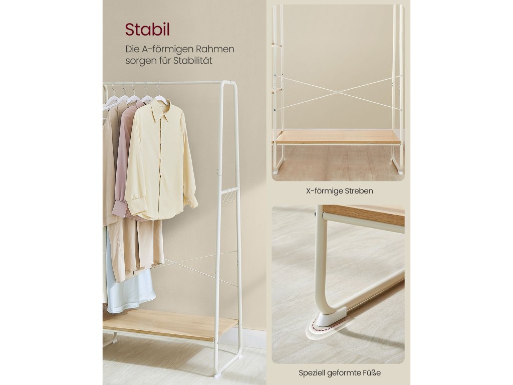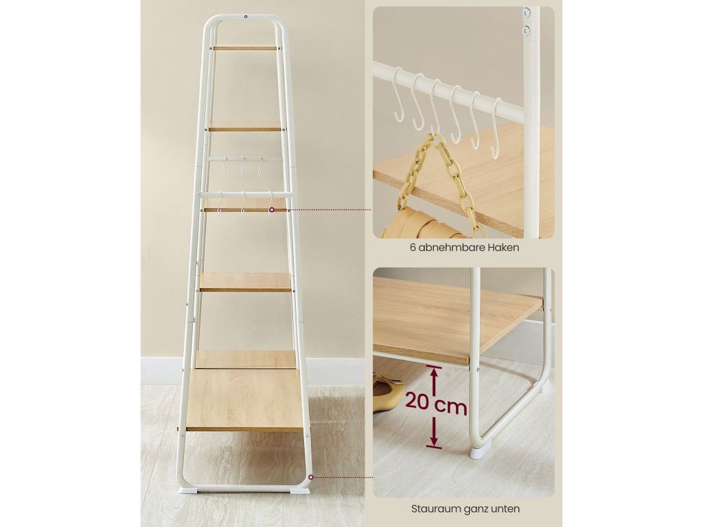 Věšák na oděvy, 45 x 120 x 160 cm, věšák s tyčí na oděvy, botník, otevřená skříň, 6 odnímatelných háčků, ložnice, předsíň, dub bílý.