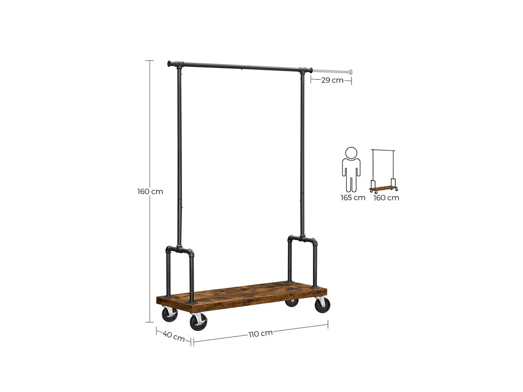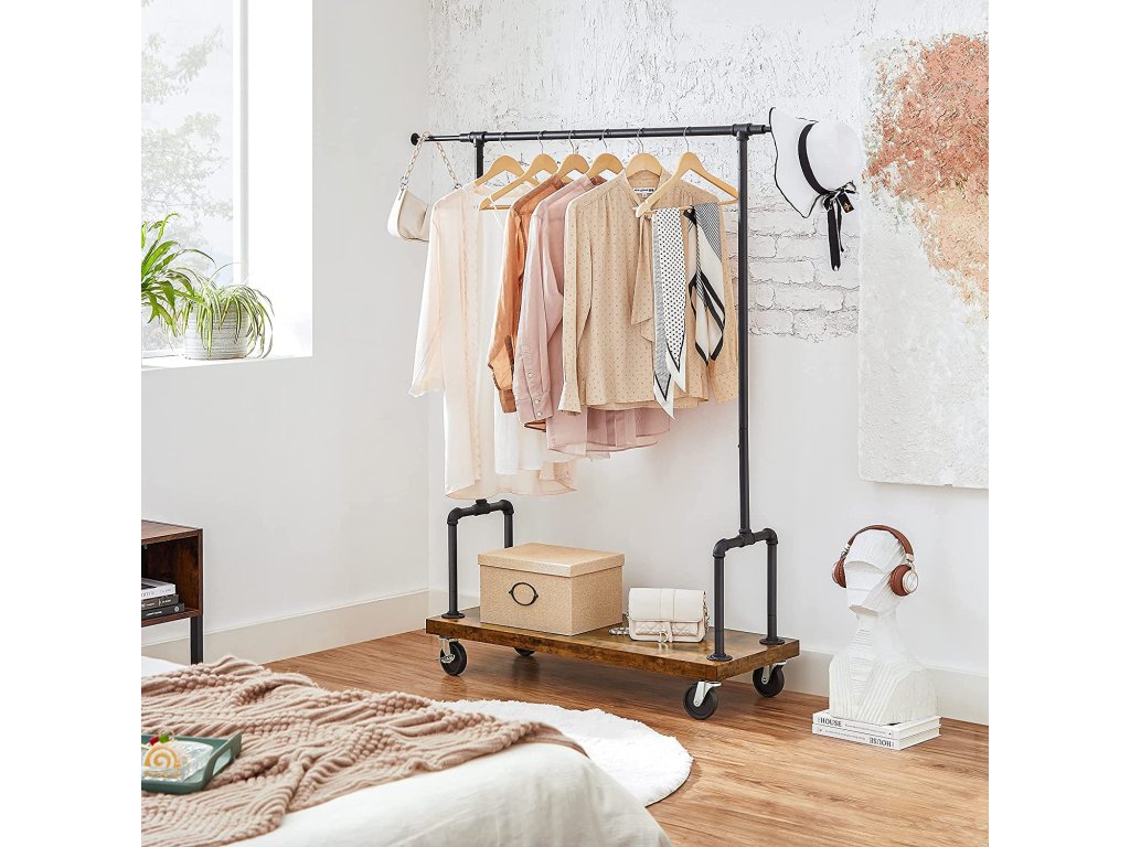 Nechte oblečení v centru pozornosti: Pokud vaše oblečení musí zůstat mimo malou skříň. proč je nevystavit pomocí tohoto elegantního stojanu na oblečení? Rustikální hnědý tón a černé trubky zvýrazní krásu vašeho oblečení a zároveň vyzařují městský, industriální šarm.Zleva doprava, shora dolů: Díky nastavitelné závěsné liště, která se rozšiřuje na obě strany, se na ni snadno vejdou vaše šaty nebo dlouhé šaty; spodní police je dokonalým úložným prostorem pro tašky a boty - oáza pro všechny!;Udržuje chlad pod velkou zátěží: Už žádné chatrné stojany, které se ohýbají pod tíhou oděvů! Tento stojan na oděvy vyrobený z robustní oceli a odolné dřevotřísky je pevný a udrží na sobě až 27 kg. závěsná tyčMobilní telefon? Fantastické! Až si budete vybírat krásné šaty na významný den, srolujte tento stojan na oblečení vedle zrcadla nebo do jiných místností. Pohybuje se plynule na 4 kolech nebo zůstává na místě díky 2 brzdám. Žádný spěch, nespěchejte!.