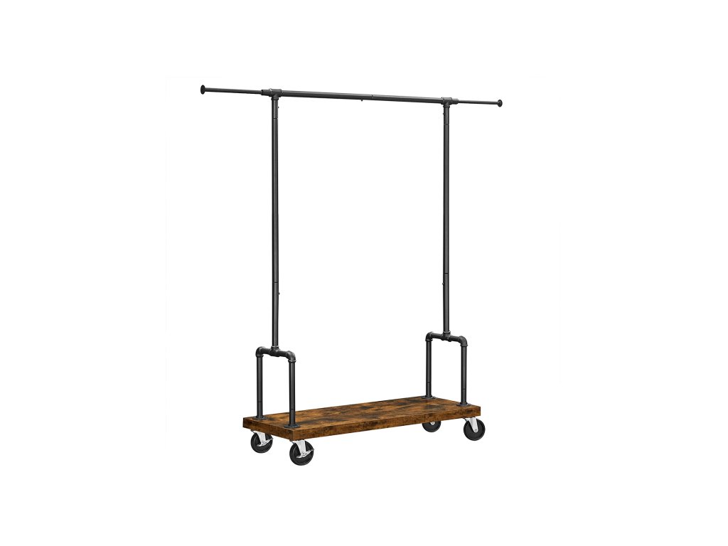 Věšák na oděvy, odolný věšák na oděvy s výsuvnou závěsnou lištou, policí a kolečky, průmyslový trubkový design, rustikální hnědá a černá barva.