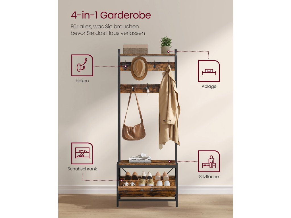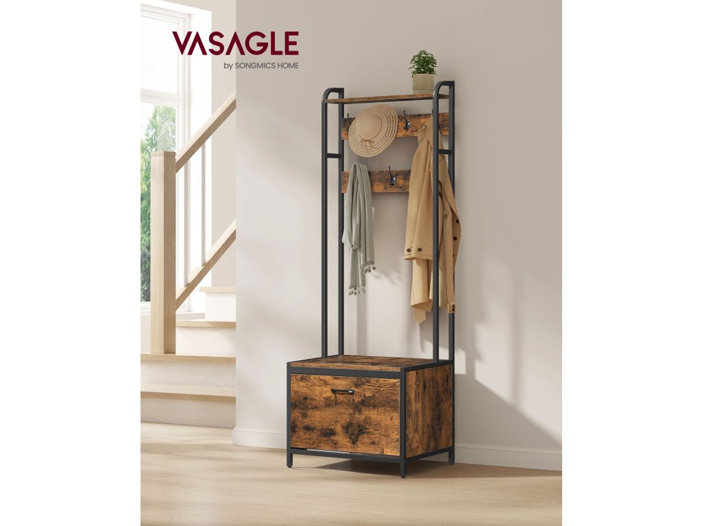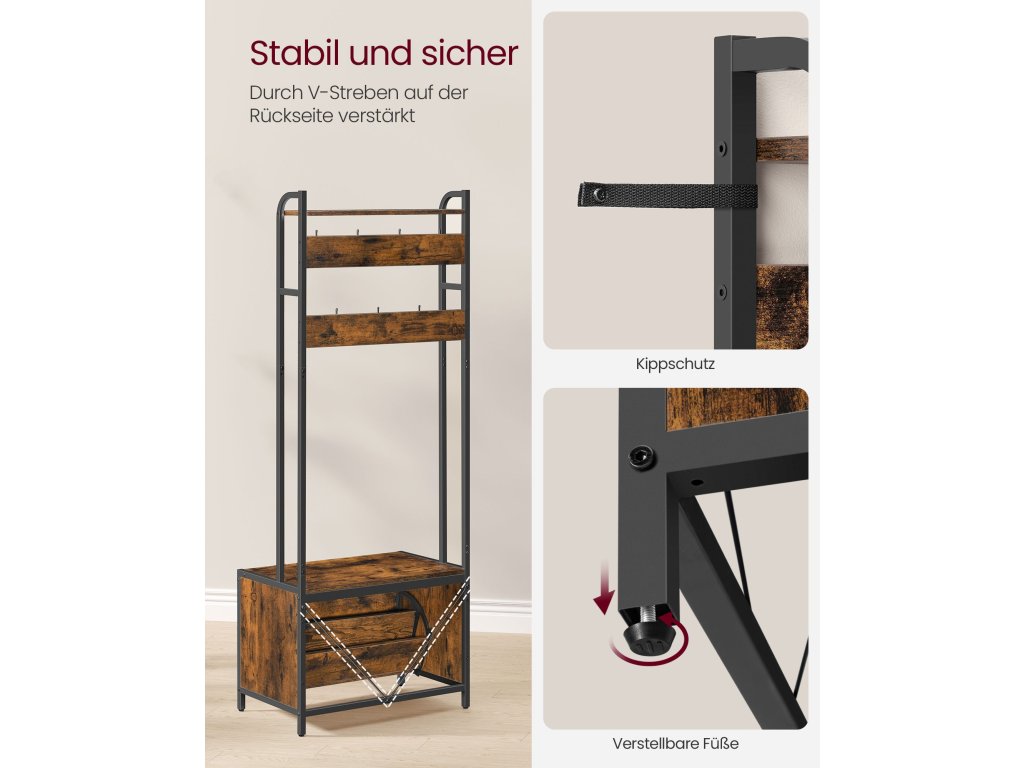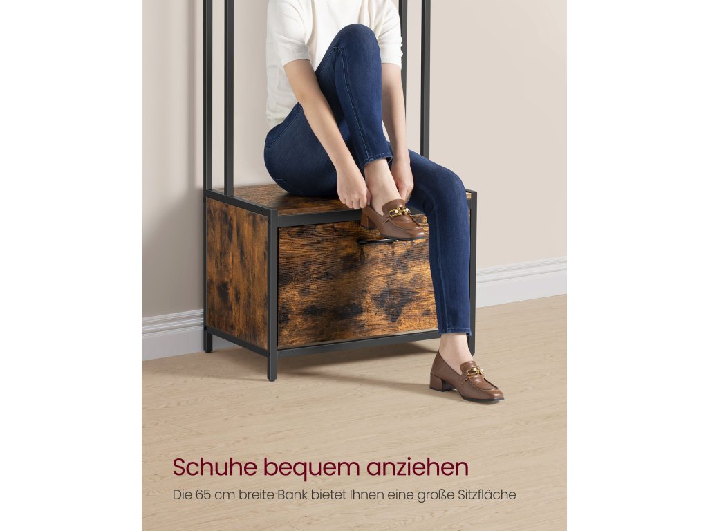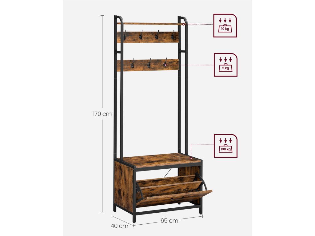 Věšák s botníkem, předsíňový strom s lavicí, 7 háčků a horní police, do předsíně, ložnice, industriální styl, rustikální hnědá a klasická černá.